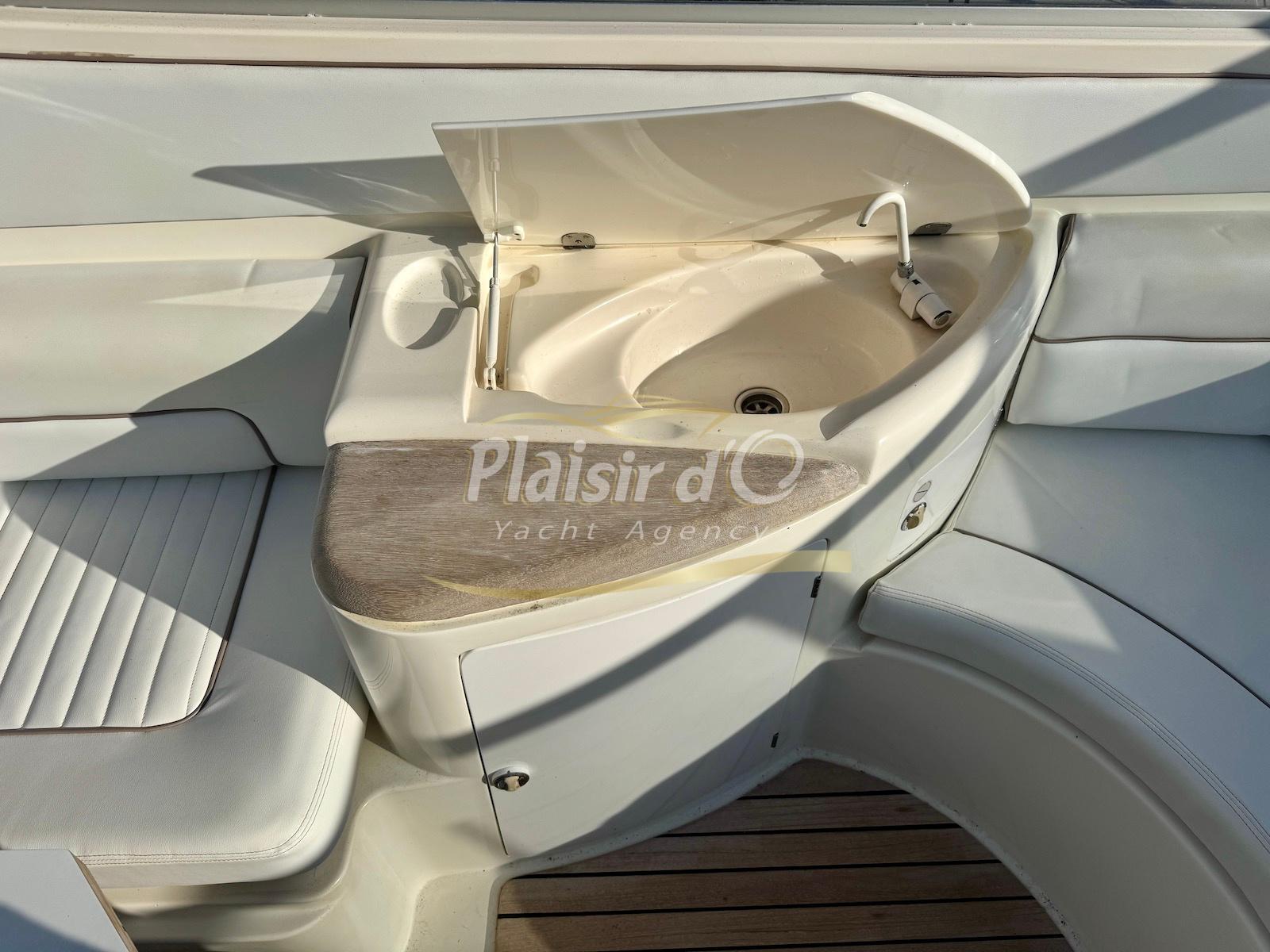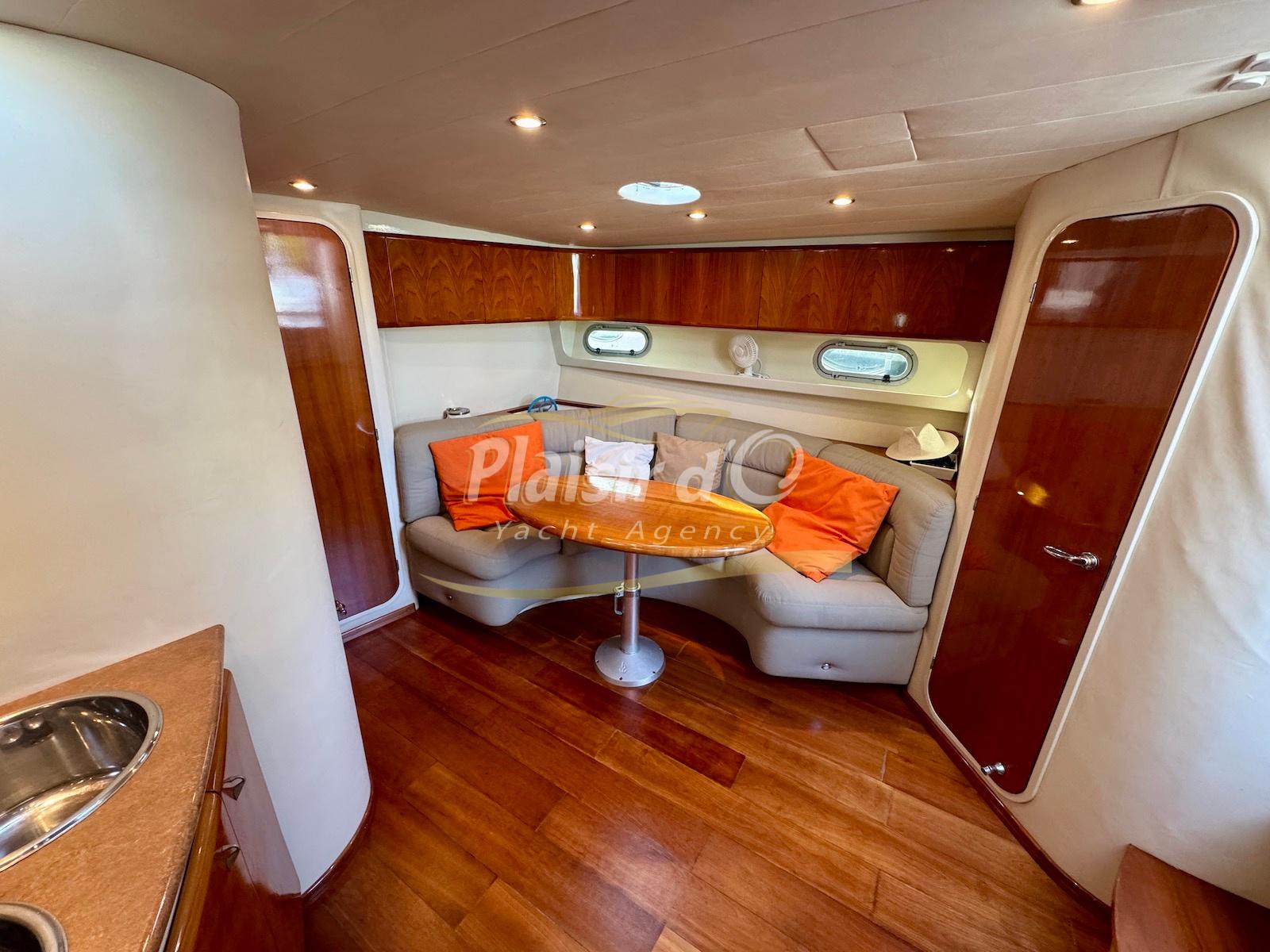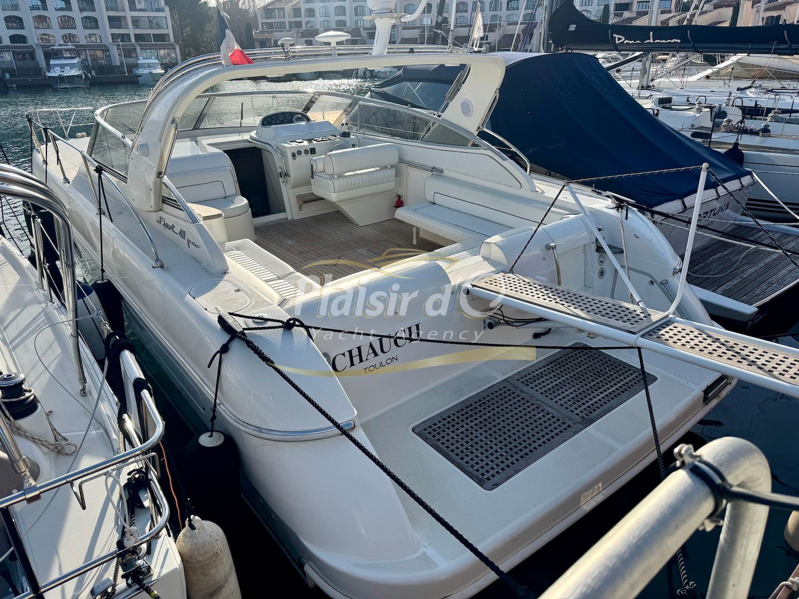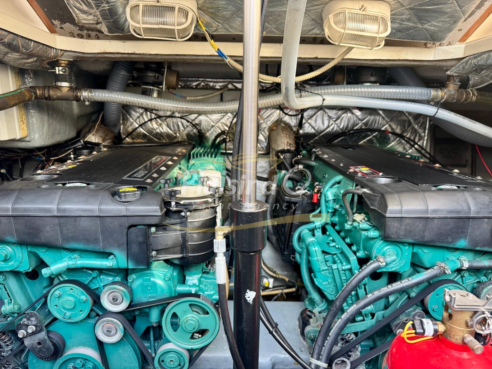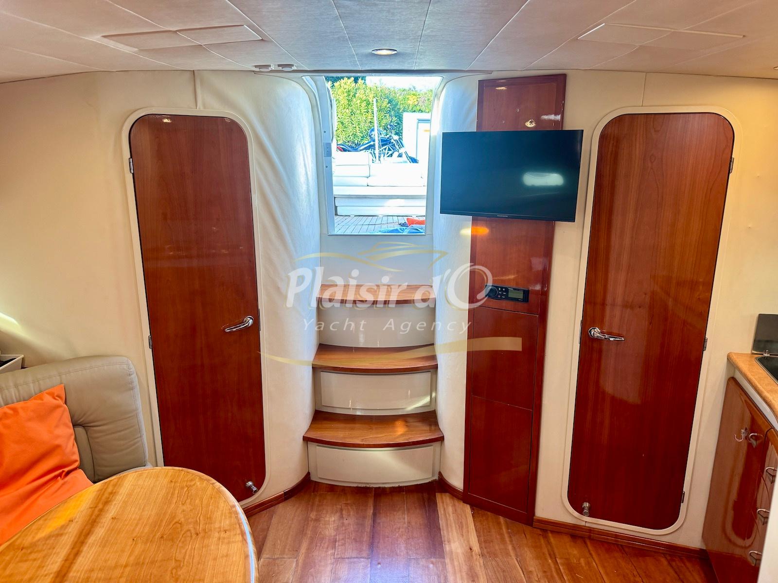 Nombreuses options : Volvo Penta D6-310; propulseur d’étrave, passerelle hydraulique, table de cockpit hydraulique, guindeau électrique, compteur de chaine, GPS Garmin récent, VHF Navicom, pilote automatique, TV, 2 réfrigérateurs, système fusion, sellerie complète récente, Bimini, taud de cockpit complet + taud de tableau de bord et siège pilote …