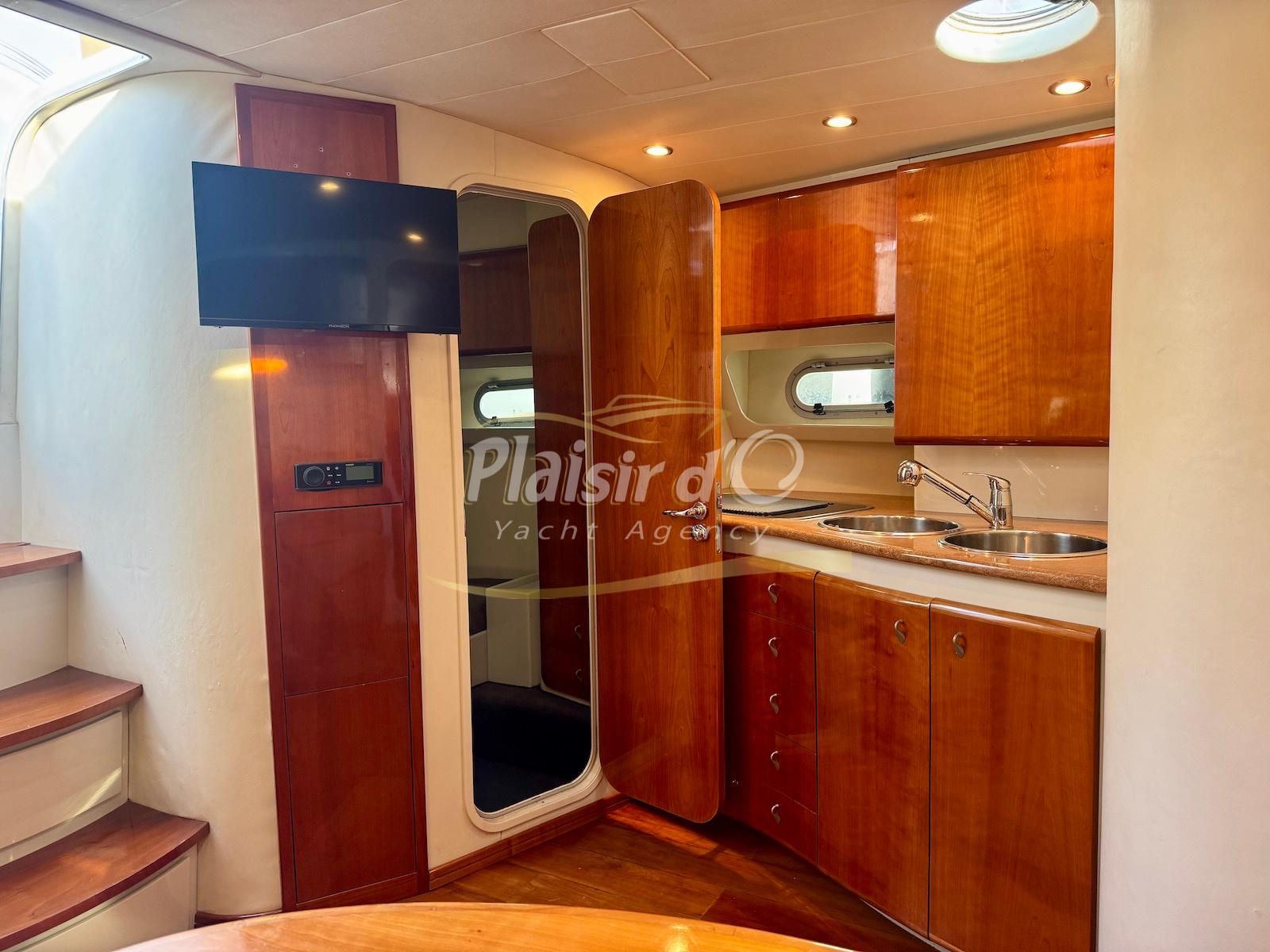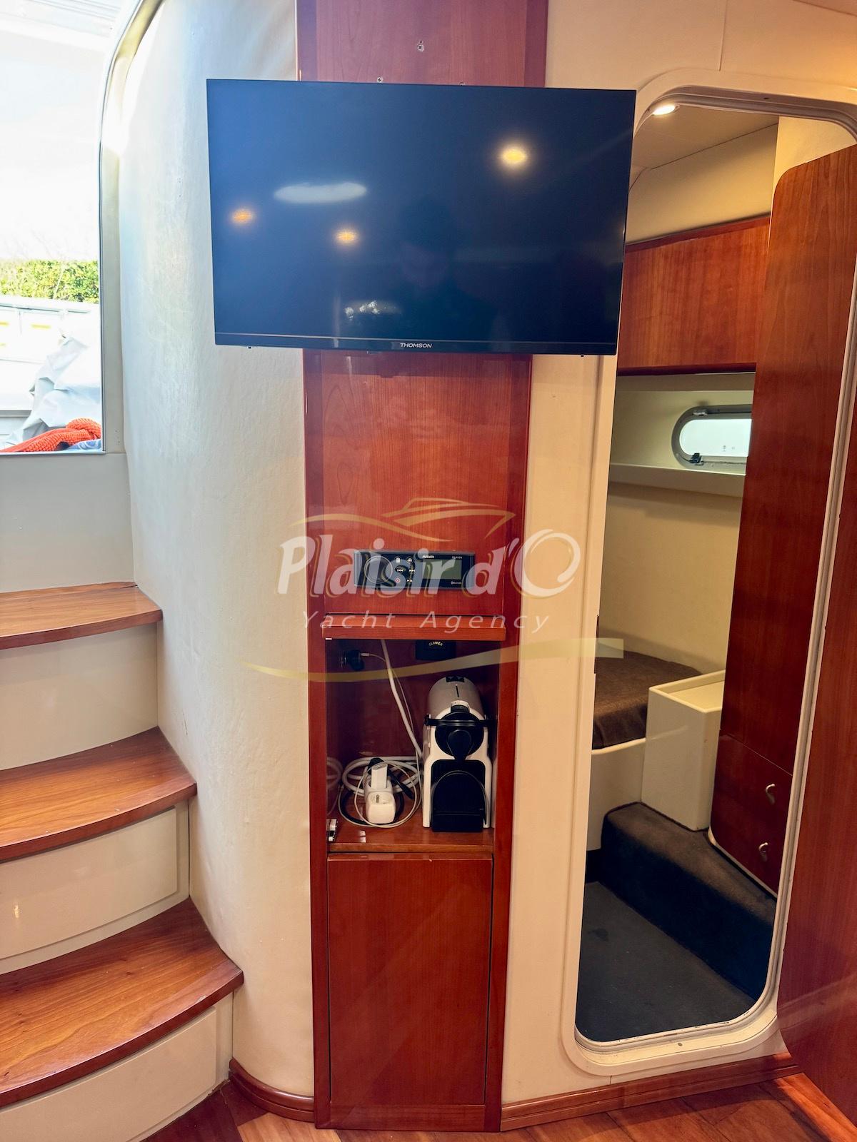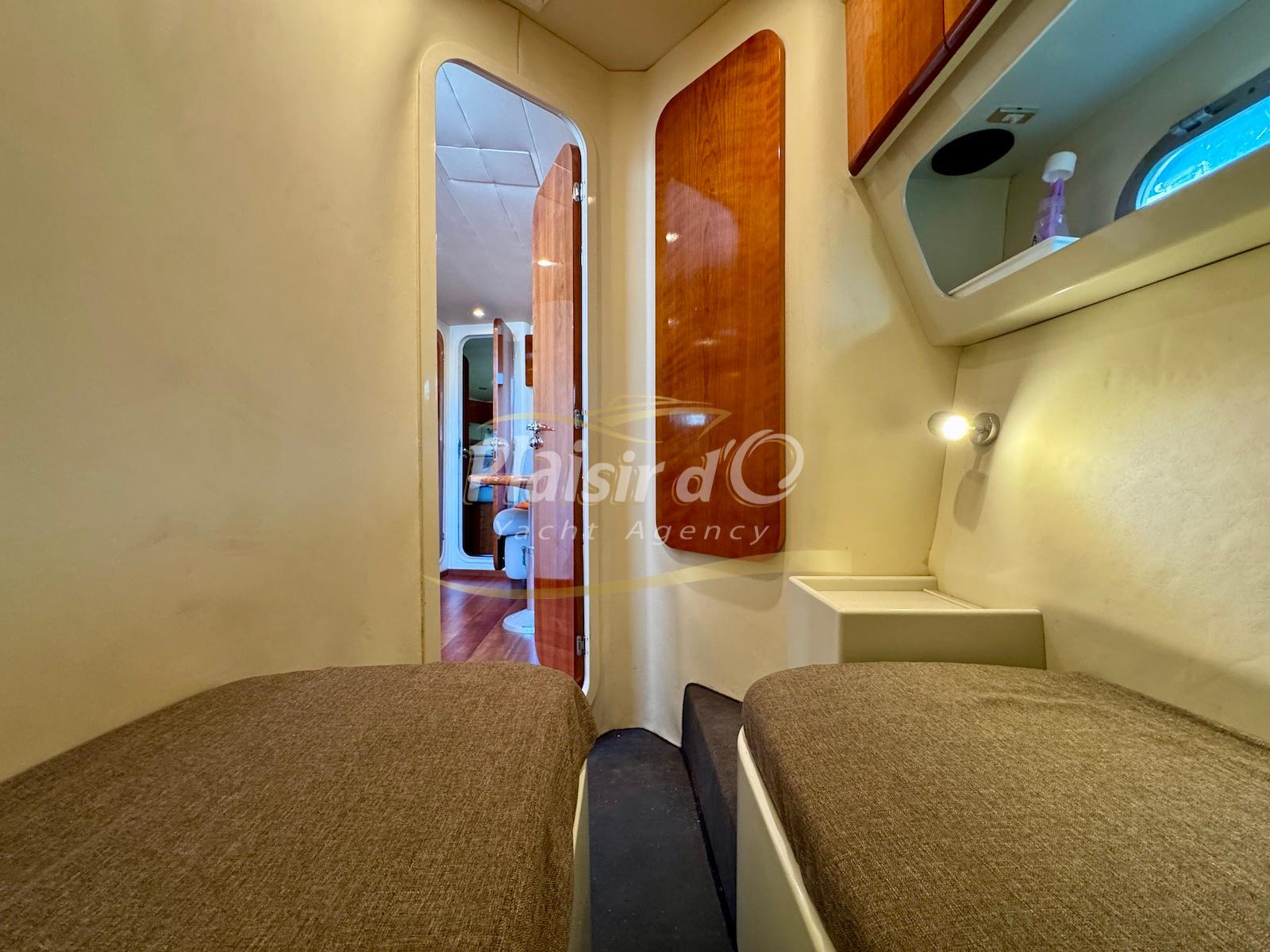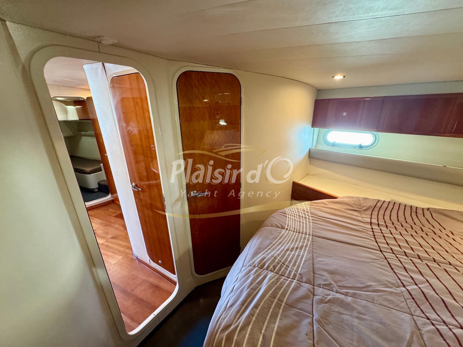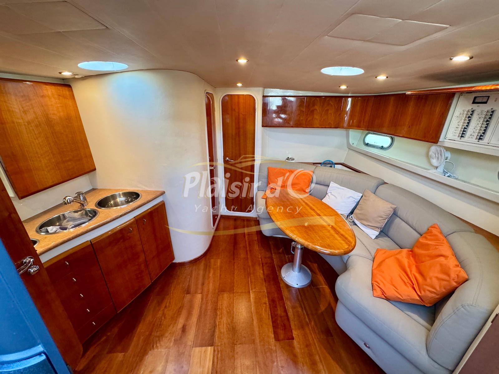 Nombreuses options : Volvo Penta D6-310; propulseur d’étrave, passerelle hydraulique, table de cockpit hydraulique, guindeau électrique, compteur de chaine, GPS Garmin récent, VHF Navicom, pilote automatique, TV, 2 réfrigérateurs, système fusion, sellerie complète récente, Bimini, taud de cockpit complet + taud de tableau de bord et siège pilote …