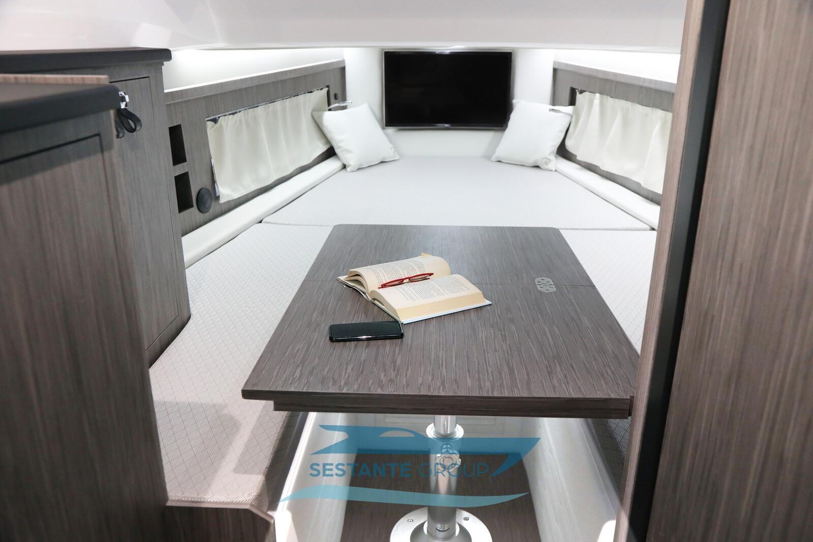 Alarme gaz, Alarme moteur, Alarme de pompe de cale, Auto Dynamic Trim Interceptor, Eau sous pression, 4 Batteries, Taquets pliants, Passavant en teck (Seadeck), Douche de cockpit, Éclairage de courtoisie, Spots sous-marins, Passerelle (Carbonio), Pompe de cale automatique, Cockpit en teck (Seadeck), Prise de quai, Guindeau électrique, 2 Echelle de bain, Chaise support HB, Table (In cabina), 2 table de cockpit (Elettrici), Corne, T-Top (Hard Top con tenda estendibile).