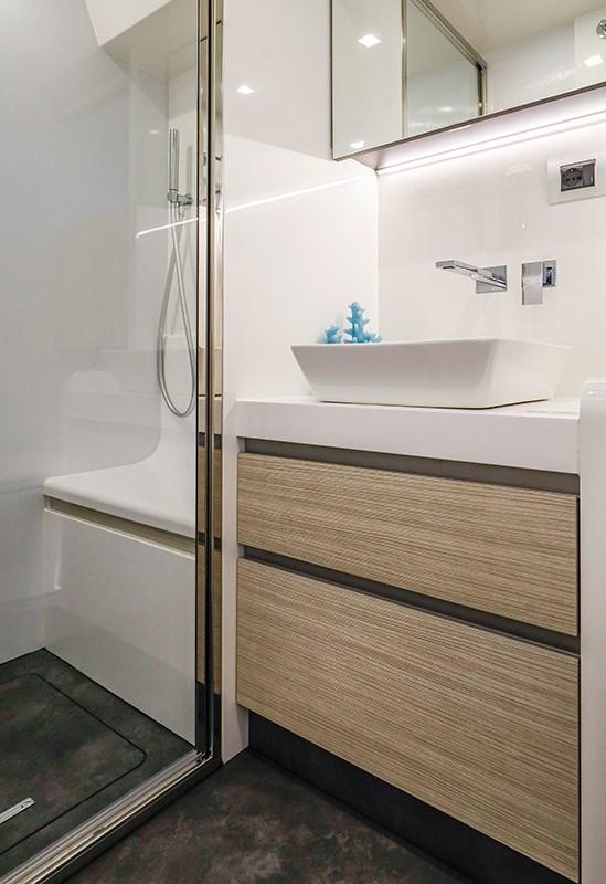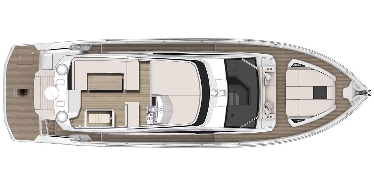 Ceux qui choisissent un flybridge, recherchent de grands espaces pour être à l’extérieur. L’E52F Evoluzione les offre généreusement. Vous vivez à l’extérieur sur le pont supérieur bien meublé, à l’avant où il y a aussi un canapé, dans le cockpit arrière ombragé et même sur le pont arrière où vous pouvez griller.