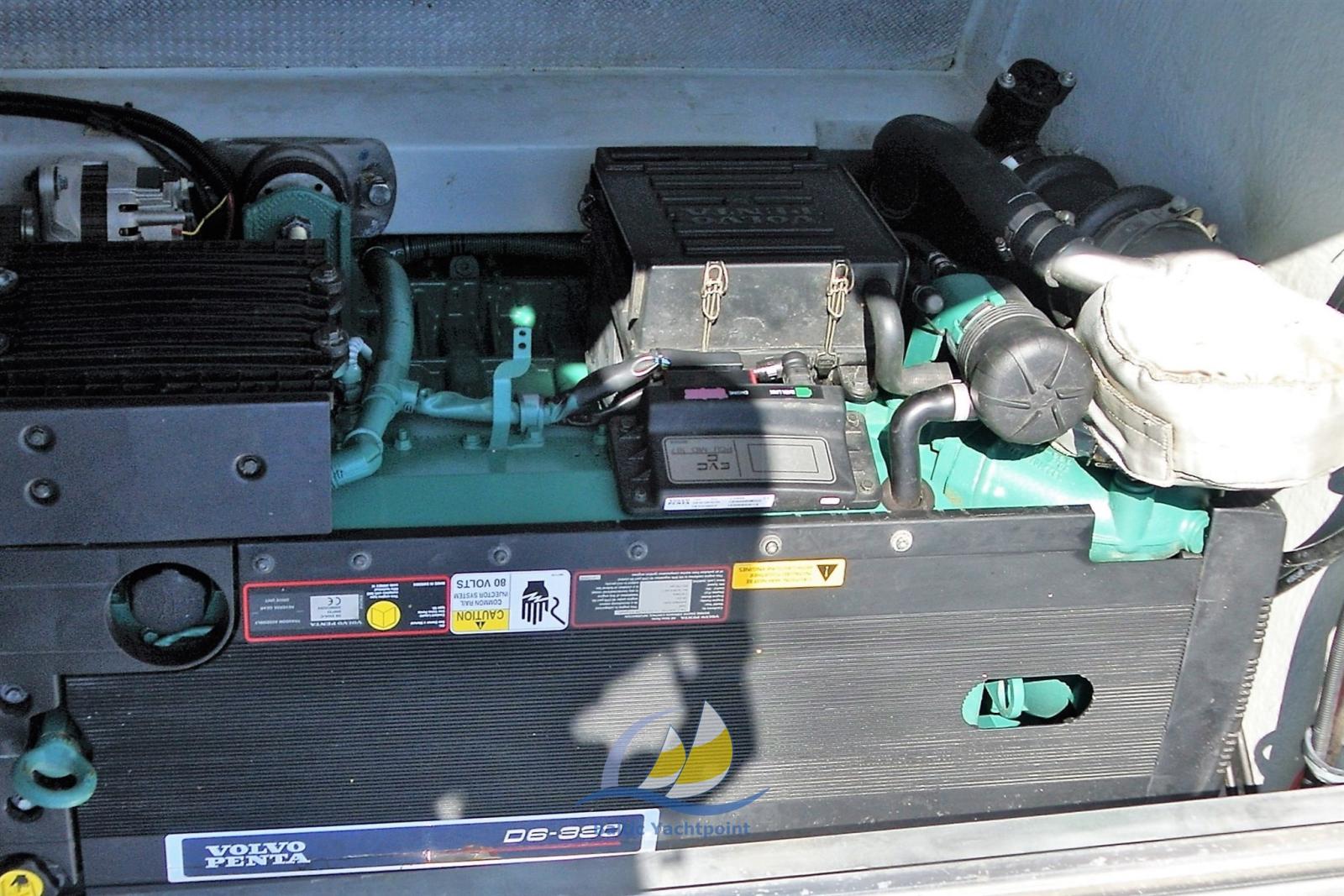 Un Volvo Penta D6-330 DPH EVC de 330 ch assure une combinaison optimale de puissance, d’efficacité et de douceur. Le système de propulsion Duoprop assure une excellente manœuvrabilité. Le bateau atteint une vitesse de croisière d’environ 25 nœuds et une vitesse de pointe de plus de 30 nœuds. Les compensateurs automatiques assurent la stabilité, tandis que la salle des machines bien insonorisée assure un faible bruit à bord. L’équipement technique comprend une connexion à quai, une pompe de cale électrique, une alimentation en eau chaude et bien plus encore.
