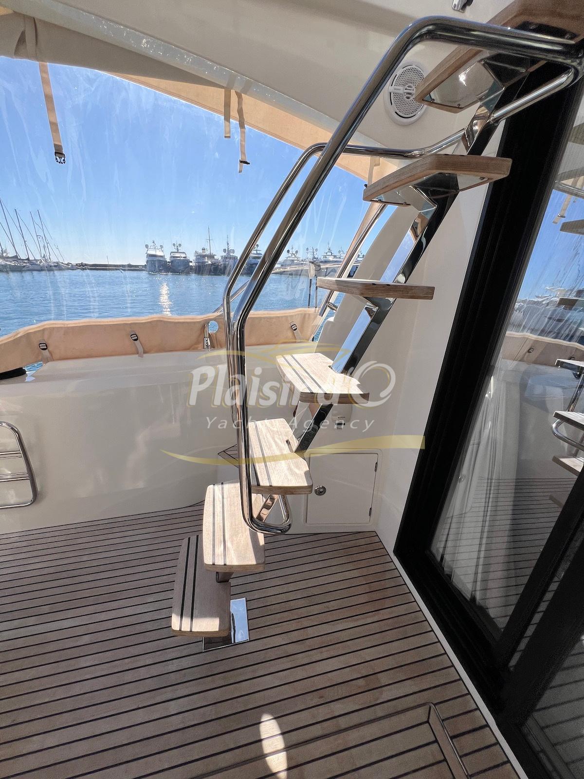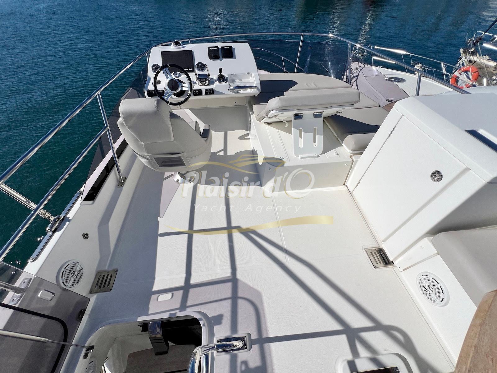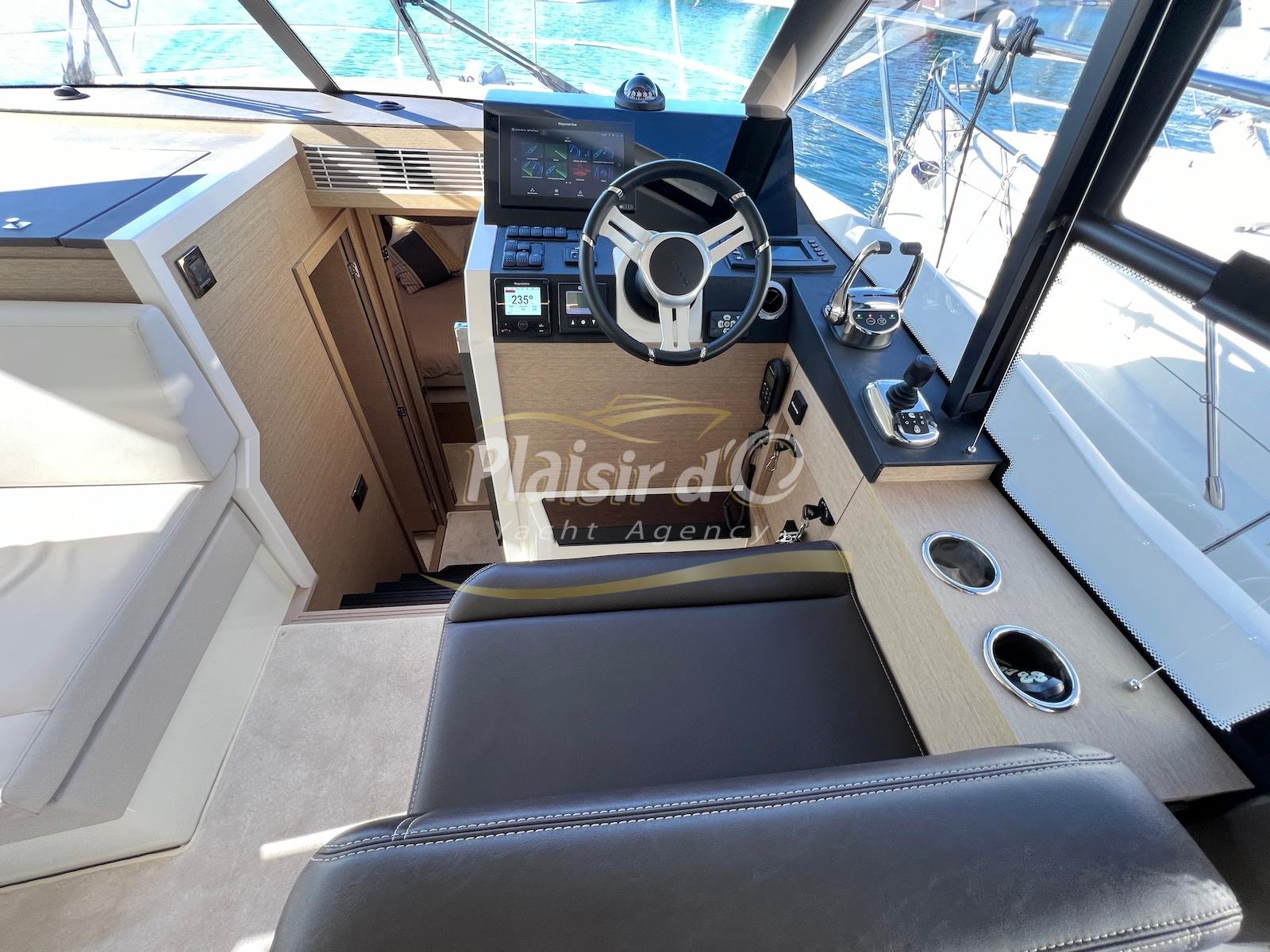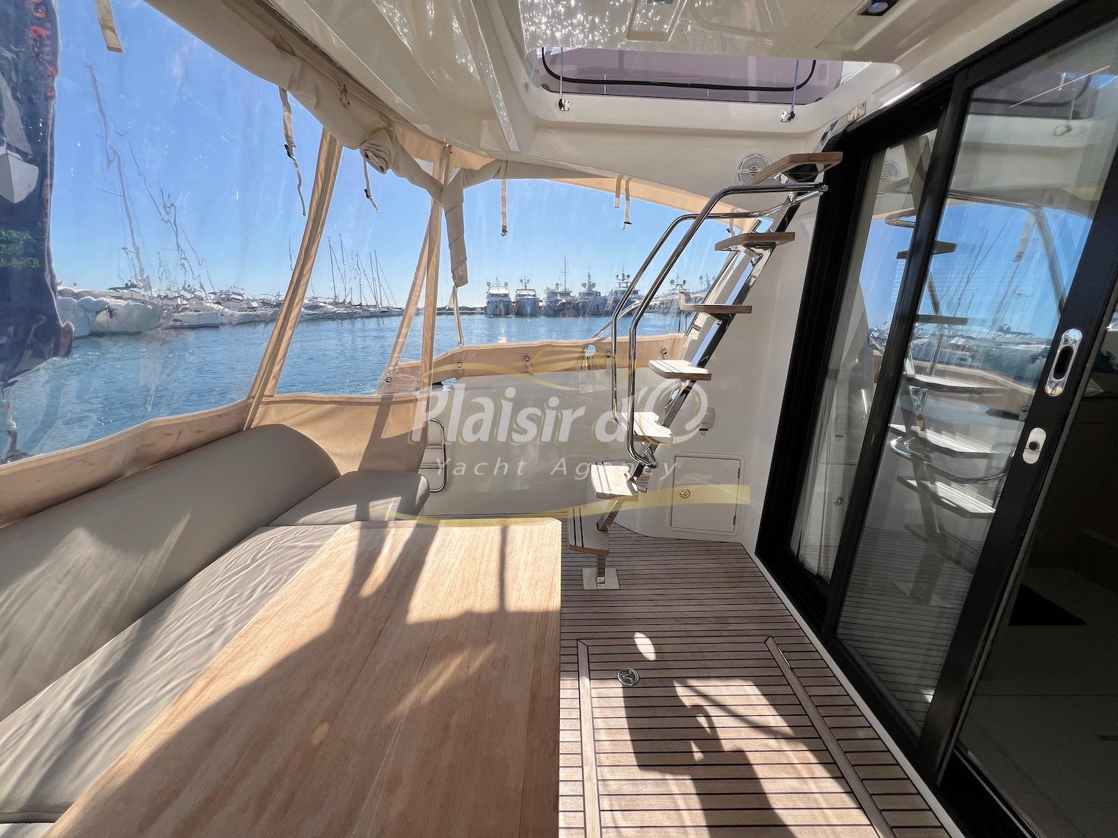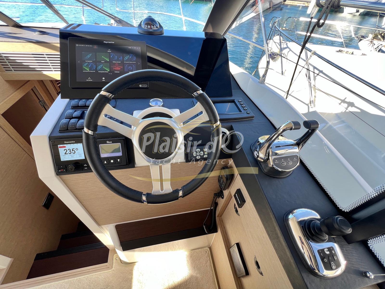 Nombreuses options: Motorisation maximale, Joystick, Générateur, GPS/Sondeur, AIS émetteur récepteur, radar, VHF, climatisation tropicale, Système fusion, Passerelle hydraulique, cockpit teck, table de cockpit teck, table intérieur électrique, 3 TV …