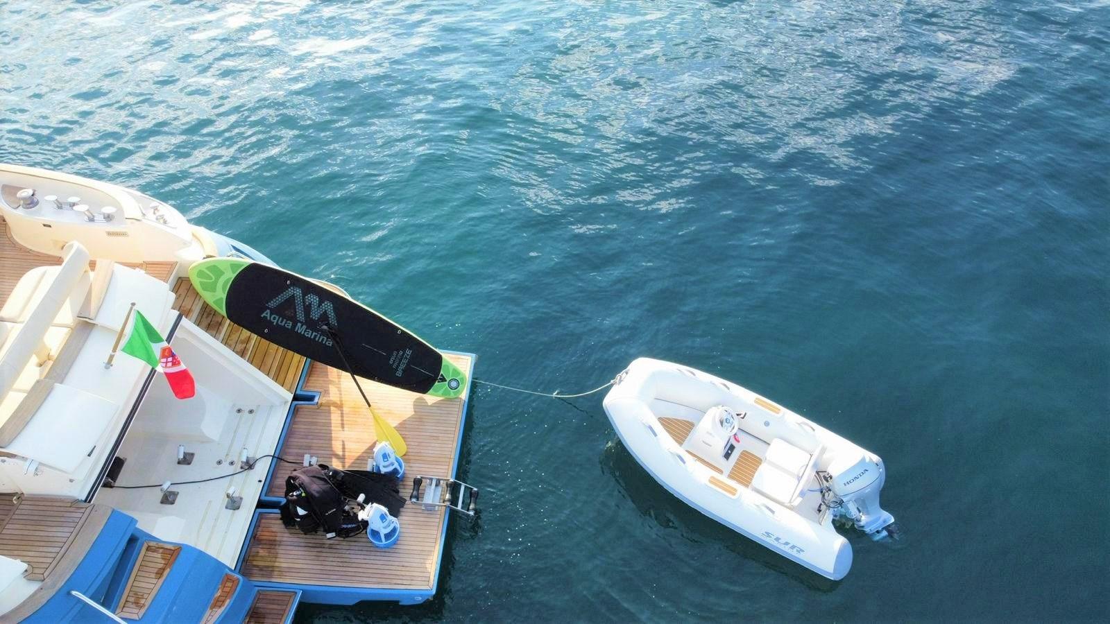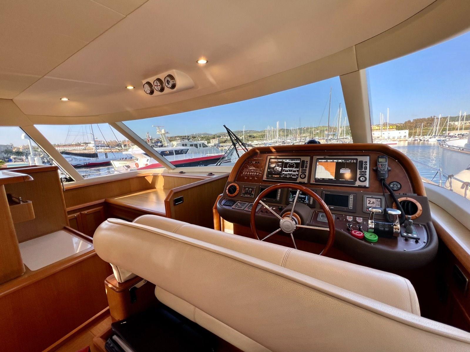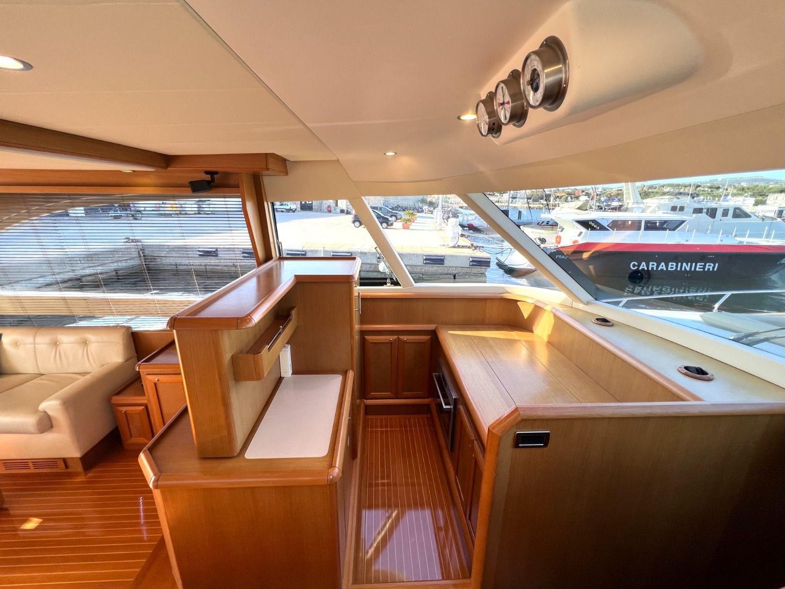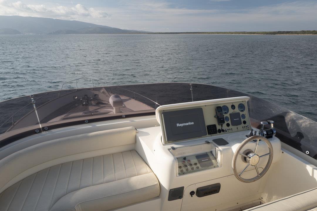 Alarme moteur, Alarme de pompe de cale, Eau sous pression, Passavant en teck, Couleur spéciale (Azzurro), Phare de poursuite, Flaps hydrauliques, Garage à annexe, Extincteur(s) fixe(s), Lavabo dans le cockpit, Passerelle, Porte latérale, Cockpit en teck, Prise de quai, Connexion eau sous pression à quai, Répétiteur électronique, Guindeau électrique, Echelle de bain, Stabilisateurs (Arg Mitsubishi), table de cockpit (2 divani), Annexe, 2 Winch électrique arrière.