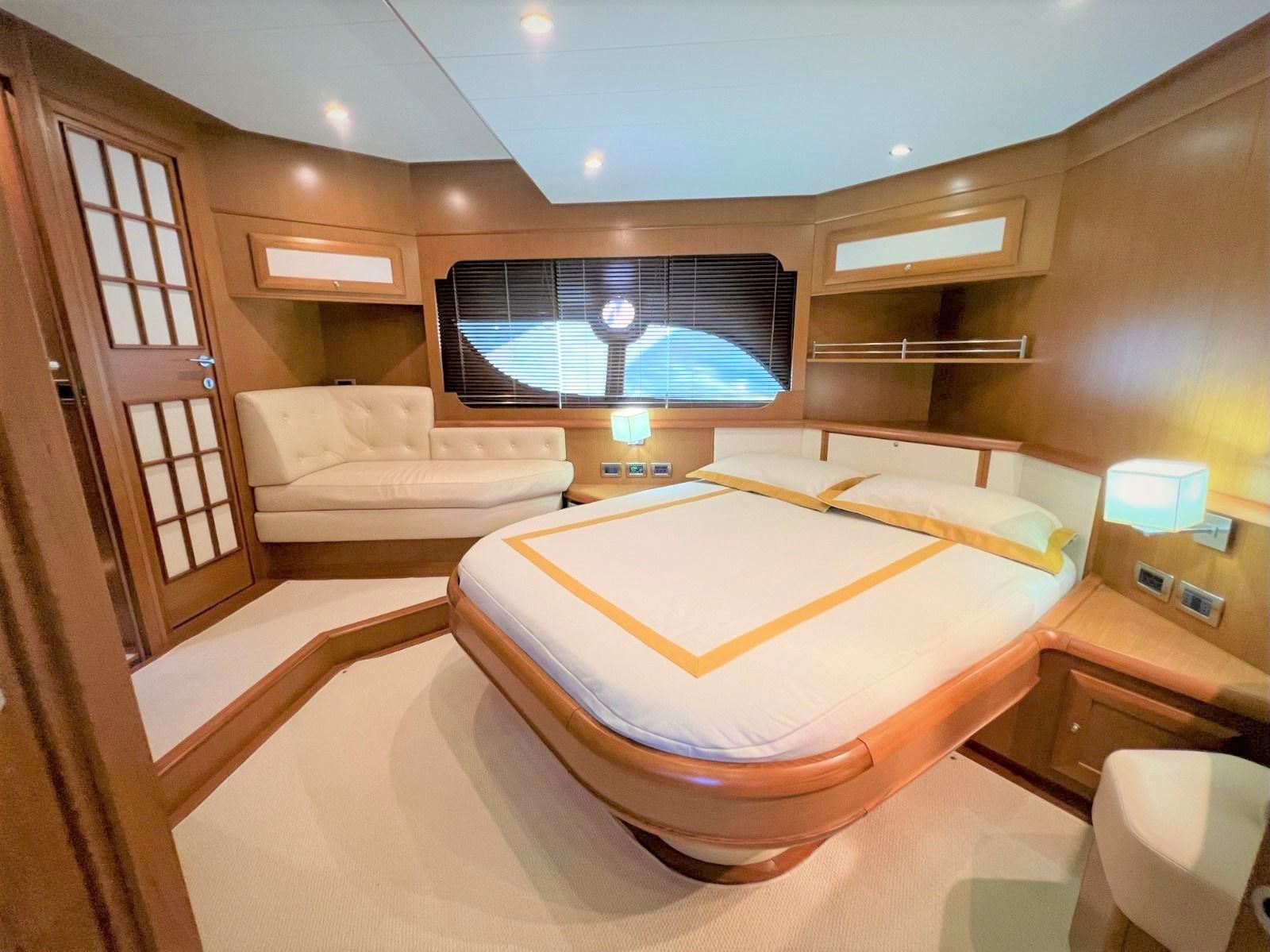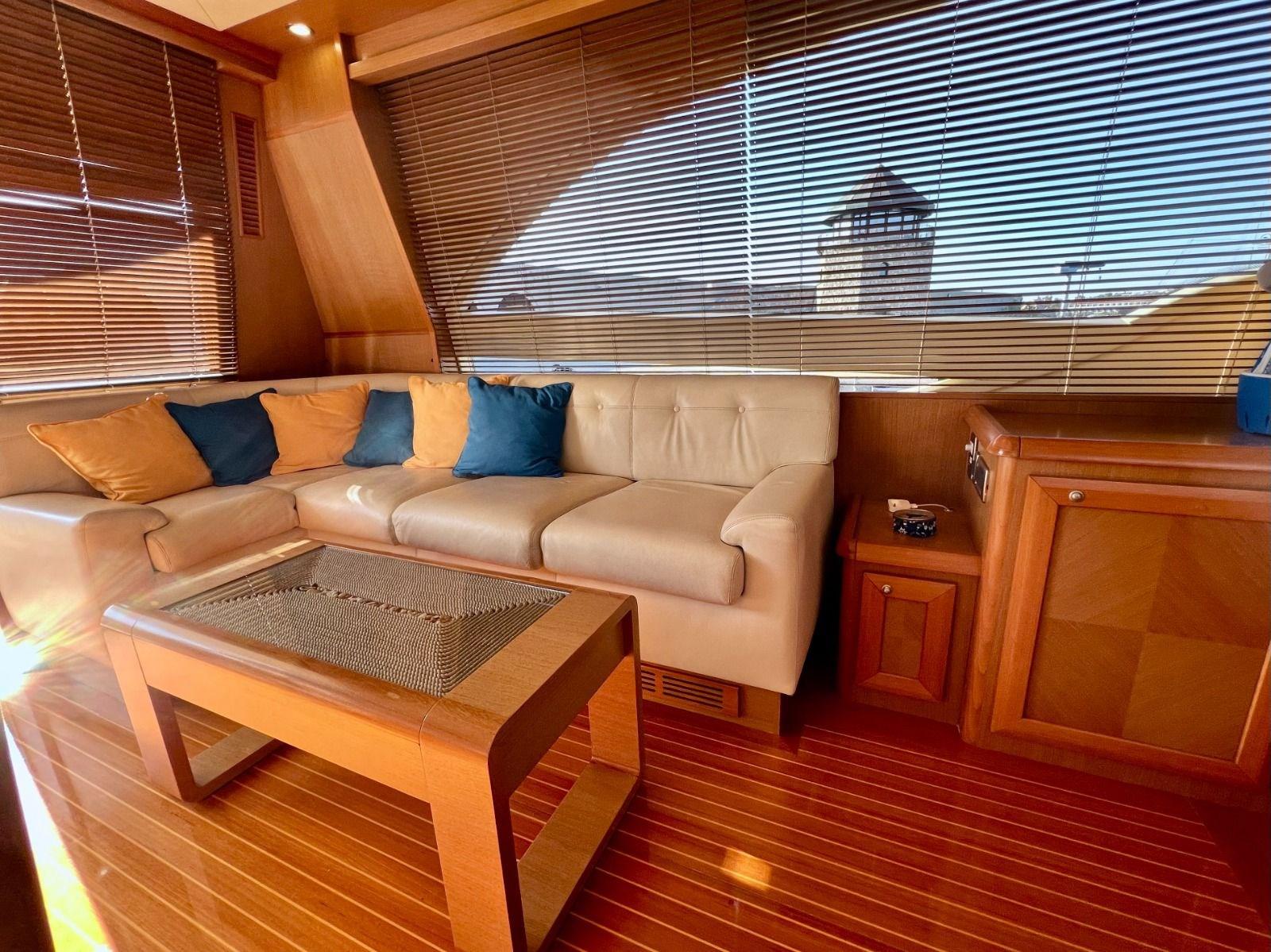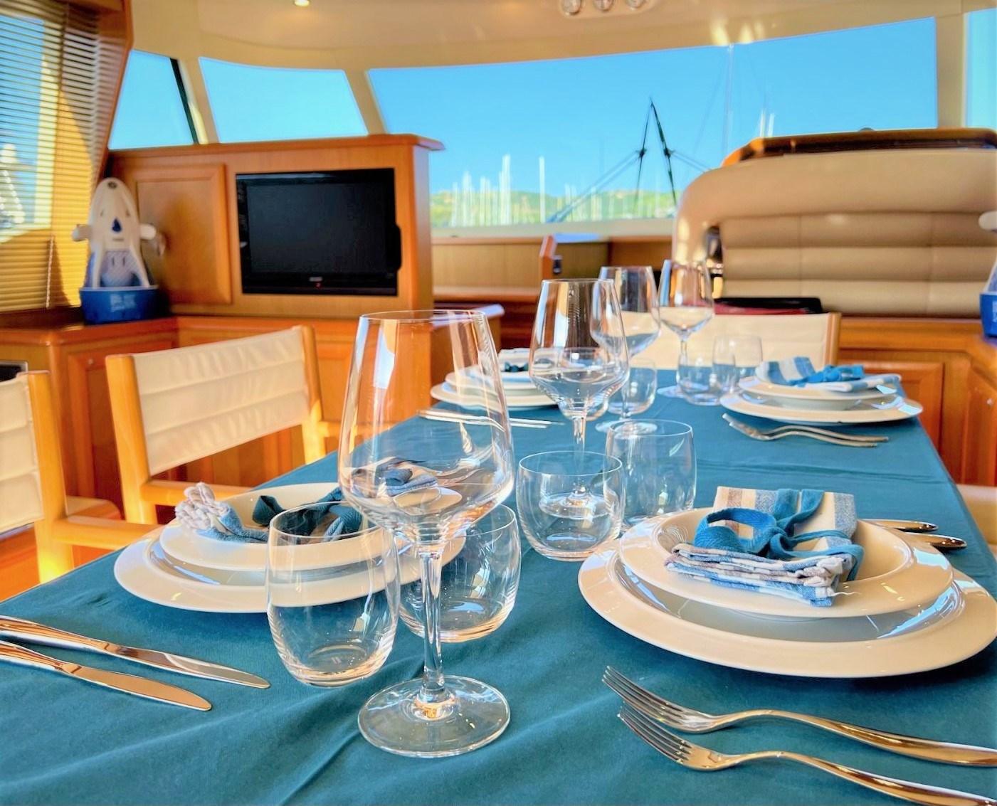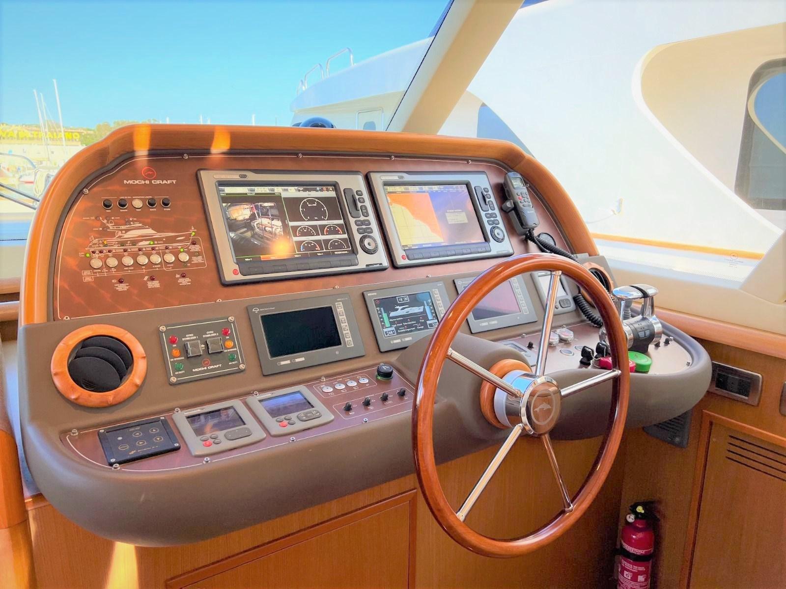 Alarme moteur, Alarme de pompe de cale, Eau sous pression, Passavant en teck, Couleur spéciale (Azzurro), Phare de poursuite, Flaps hydrauliques, Garage à annexe, Extincteur(s) fixe(s), Lavabo dans le cockpit, Passerelle, Porte latérale, Cockpit en teck, Prise de quai, Connexion eau sous pression à quai, Répétiteur électronique, Guindeau électrique, Echelle de bain, Stabilisateurs (Arg Mitsubishi), table de cockpit (2 divani), Annexe, 2 Winch électrique arrière.