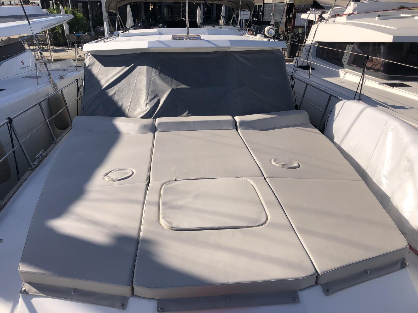 Cockpit : Cockpit en teck avec taud, panneaux solaires, bancs, table et poste de pilotage