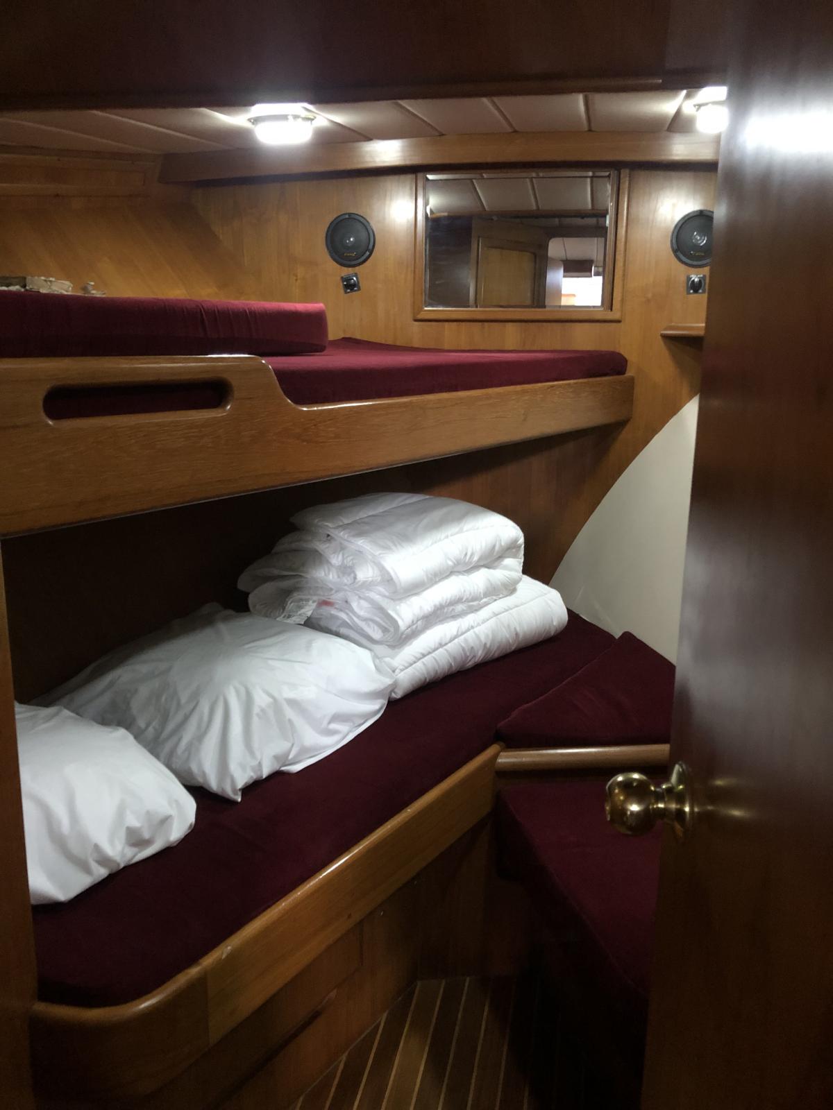 Cabines : 2 cabines, dont 1 à la proue avec lits superposés et 1 à la poupe avec grand lit