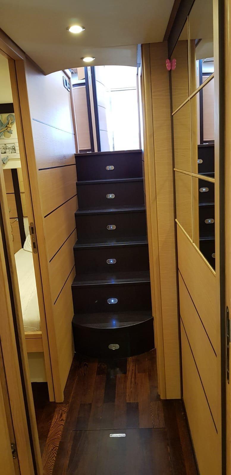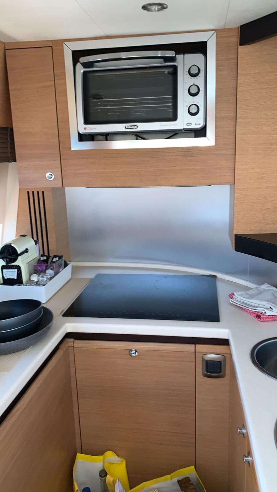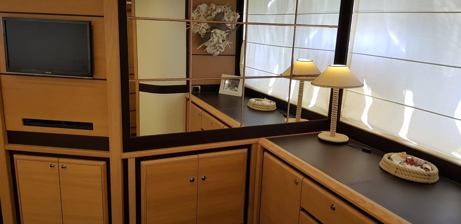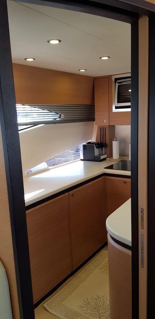 Stores électriques, intérieur en teck, porte latérale électrique. Étagère à aliments avec serrure électrique. Auvent de bain de soleil sur le bain de soleil avant.