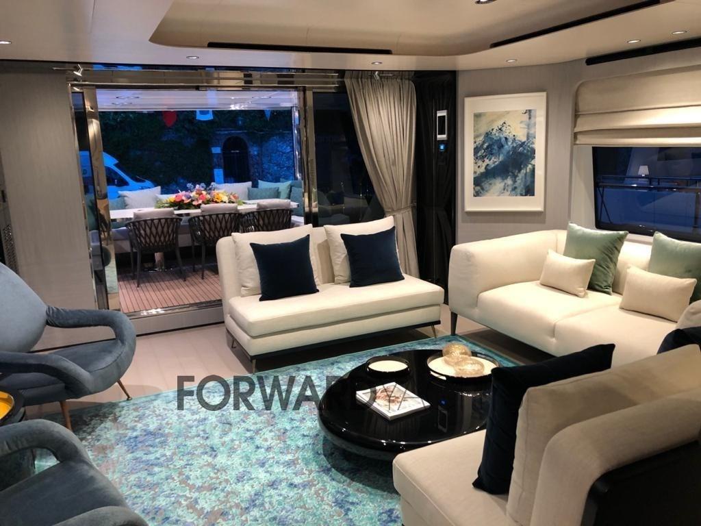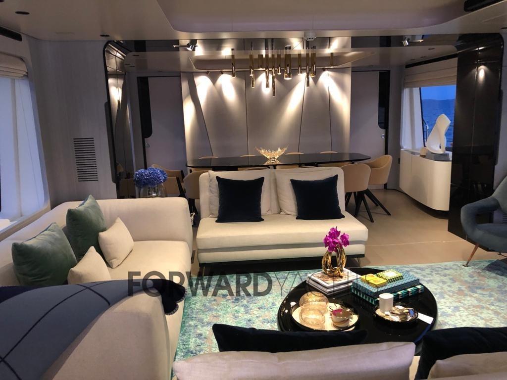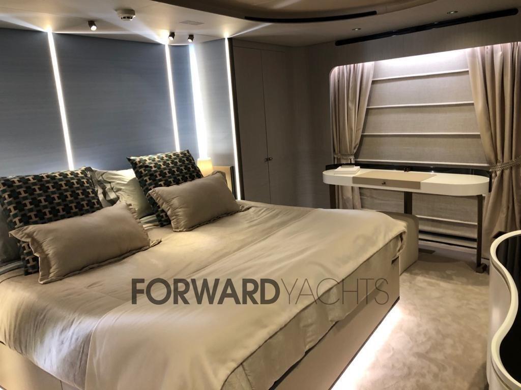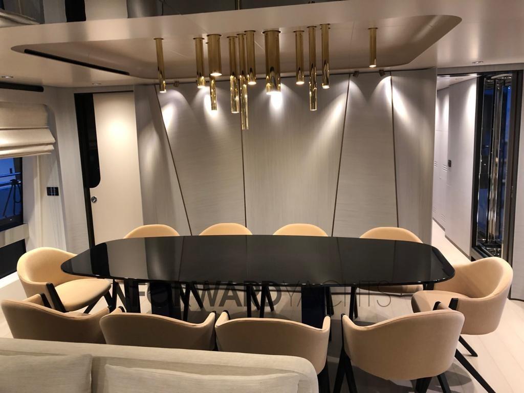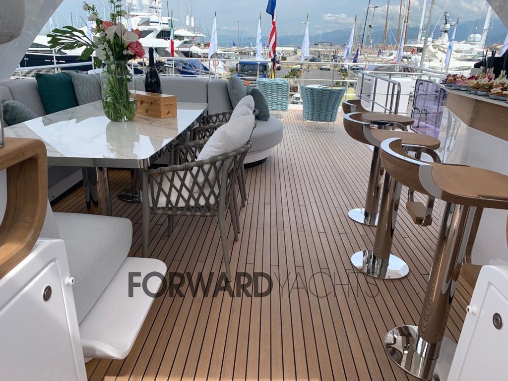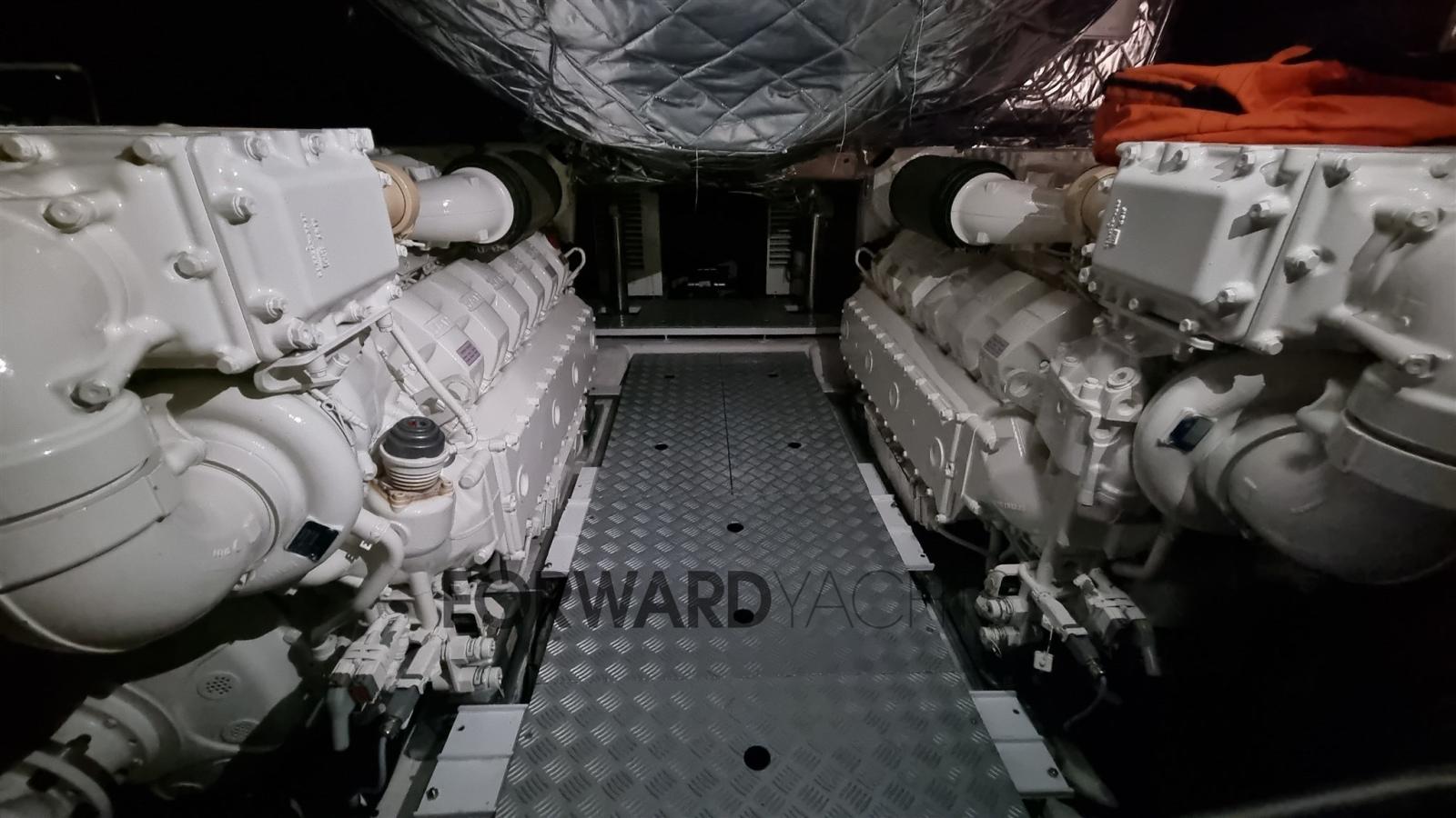 Le bateau est équipé de 2 moteurs MAN V12 de 1 900 CV. De plus, l’utilisation de la fibre de carbone permet d’augmenter la taille des volumes et des surfaces tout en conservant le même poids, assurant ainsi d’excellents niveaux de stabilité dynamique. Bien équipé avec : troisième poste de pilotage dans le cockpit, propulseur de poupe et d’étrave, stabilisateurs d’ailerons, pont de poupe hydraulique et bien plus encore.