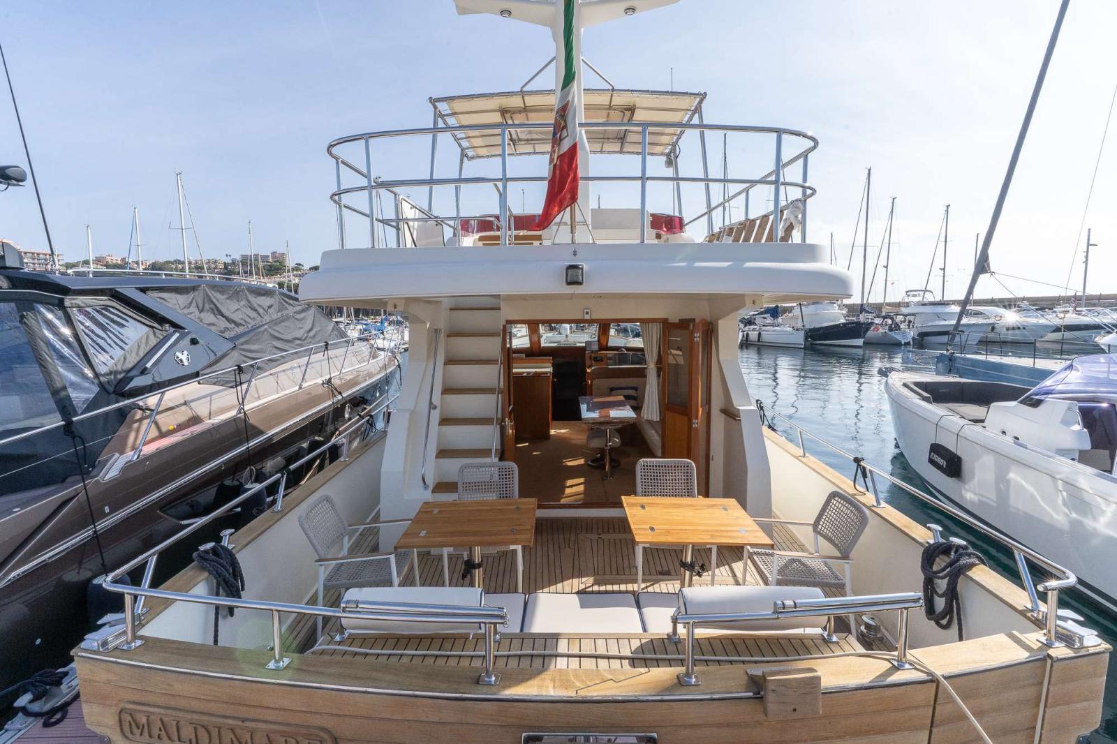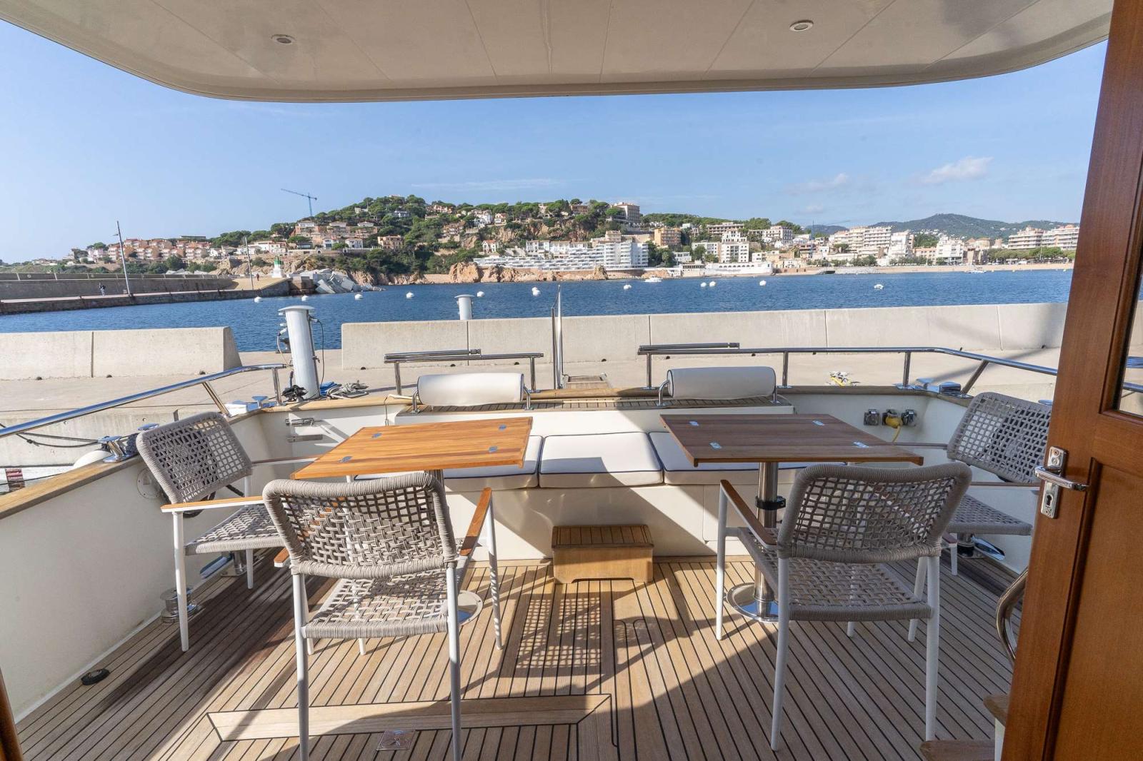 A l'arrière, le cockpit est immense, équipé de deux tables en teck et de chaises.