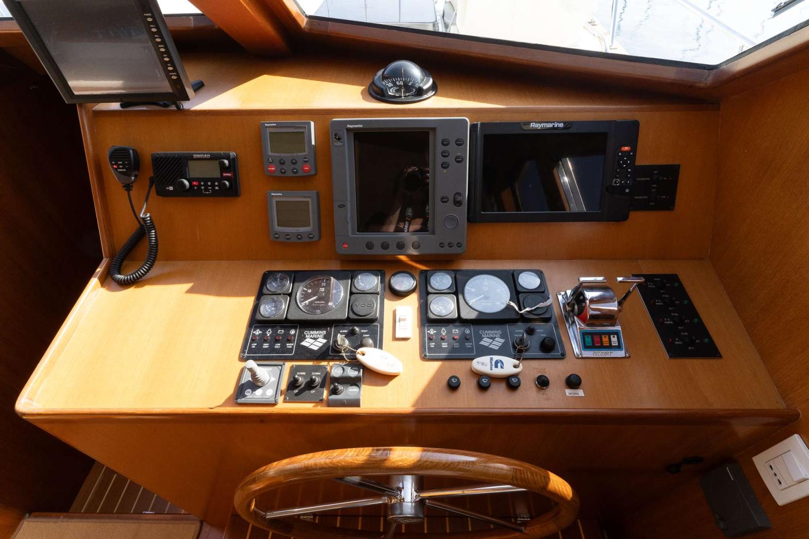 Le poste de pilotage se trouve sur tribord, avec un accès direct sur le pont par une porte de coupée.