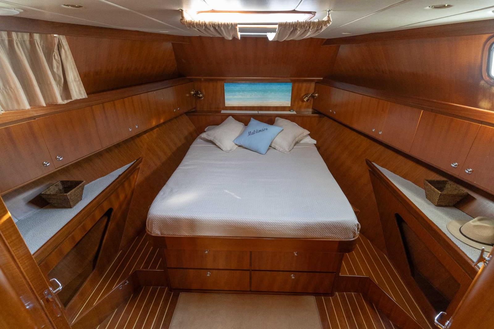 La cabine principale se trouve à l'avant, grand lit double et nombreux rangements. Elle à sa propre salle d'eau, WC avec douche séparée.