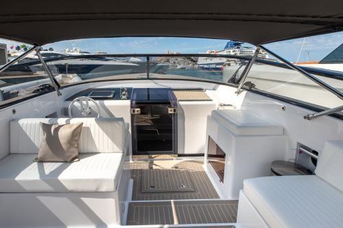 Conçu pour le style et le confort, il est entièrement équipé de la climatisation, du pilote automatique, d’un système audio haut de gamme et d’un VHF Simrad Pro. En outre, il comprend un crochet de remorquage, une passerelle pliante et une marche d’accès, assurant la facilité d’utilisation et le maximum de commodité.