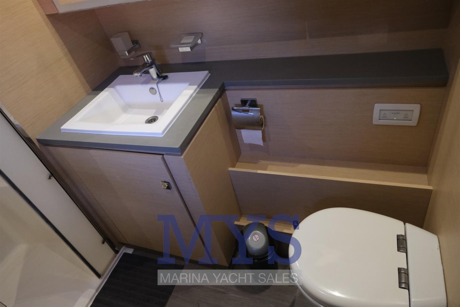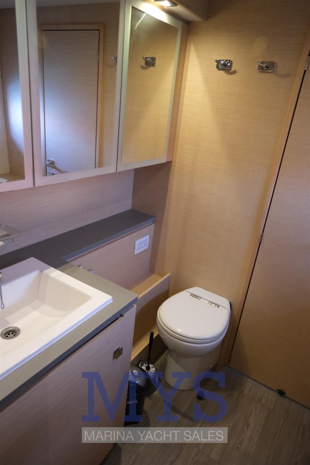 1 cabine principale King-Size à l’avant avec salle de bain complète avec lavabo, douche et WC marin électrique
