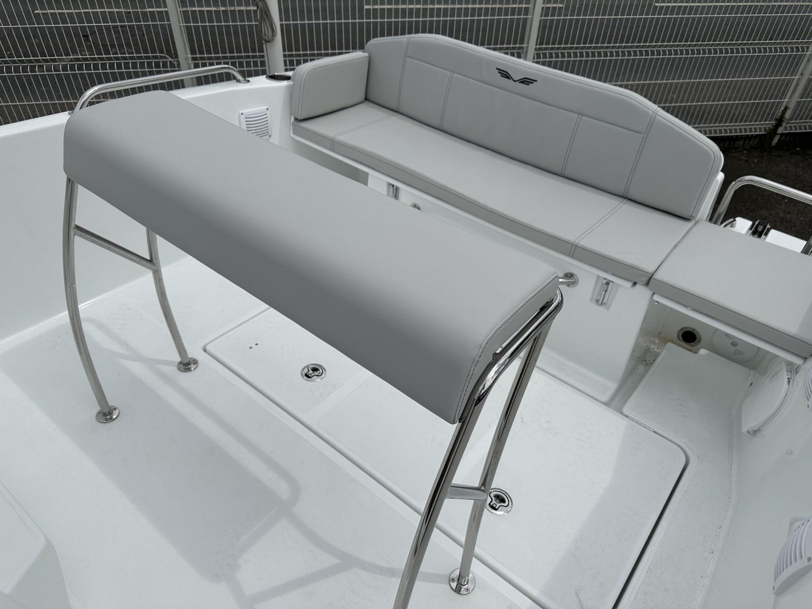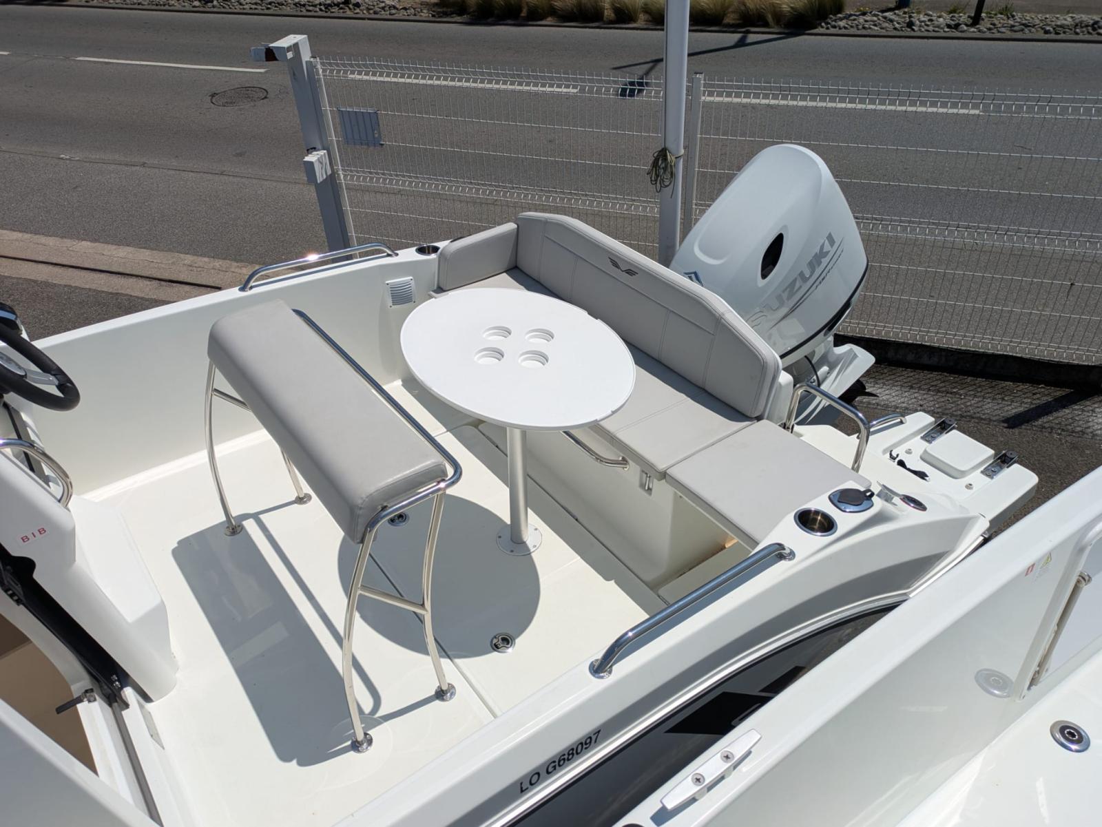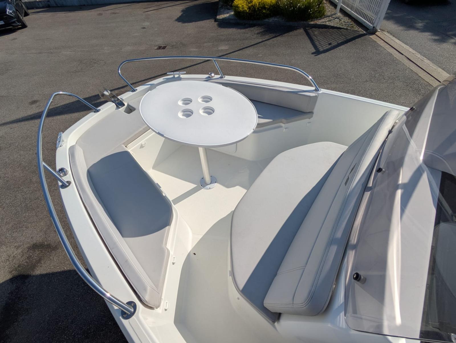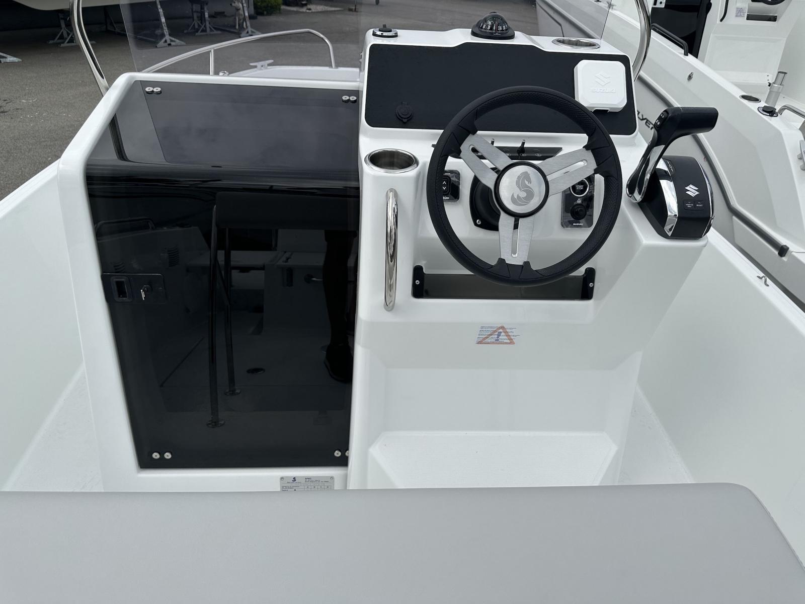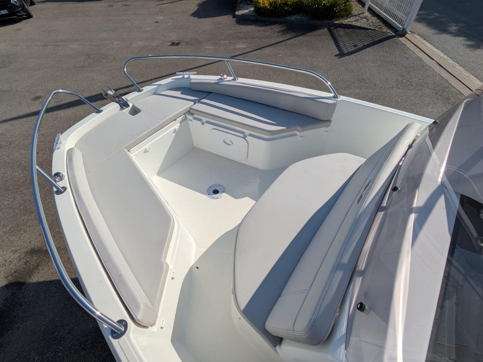 Version sellerie standard, finition confort, plateformes den bain polyester, rangements cockpit avant, portes cannes, extension banquette de cockpit, selleries salon avant, housse de console et leaning post, GPS-Sondeur GAMRIN 72 et sonde tableau arrière + cartographie.
