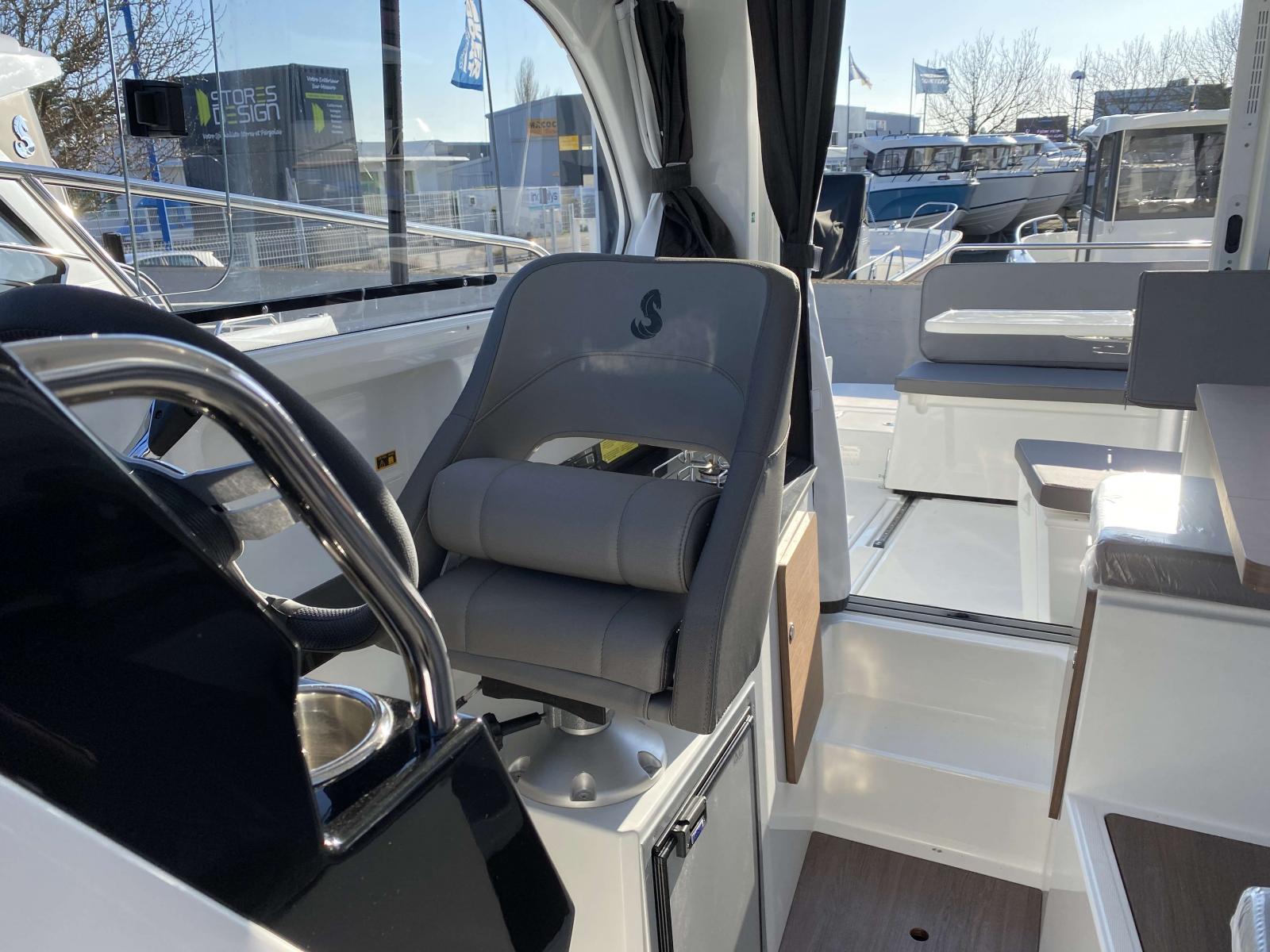 version sellerie élégance cruising, finition confort, Ecran multifonctions GARMIN ECHOMAP UHD 92sv, cartographie garmin pour GPS, Sonde GARMIN GT23 M-Tm, guindeau éléctrique, banquette de cockpit latérale repriable sellerie élégance, taud de soleil de cockpit, taud de fermeture arrière de cockpit, plate-forme de bain polyestère, table de cockpit, bain de soleil de cockpit, propulseur d'étrave, circuit éléctrique 220 V, cuisine luxe avec réchaud Gaz, réfrigirateur 42 litres, complément de couchage, WC marin avec réserve d'eau noires, pré-rigging suzuki, coque blanche, panneau de timonerie coulissant avec rideaux occultants.