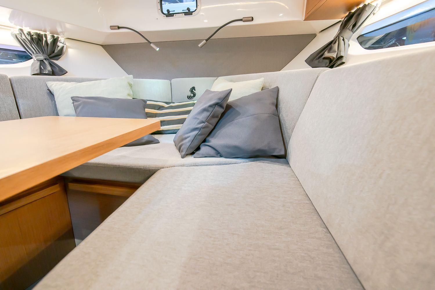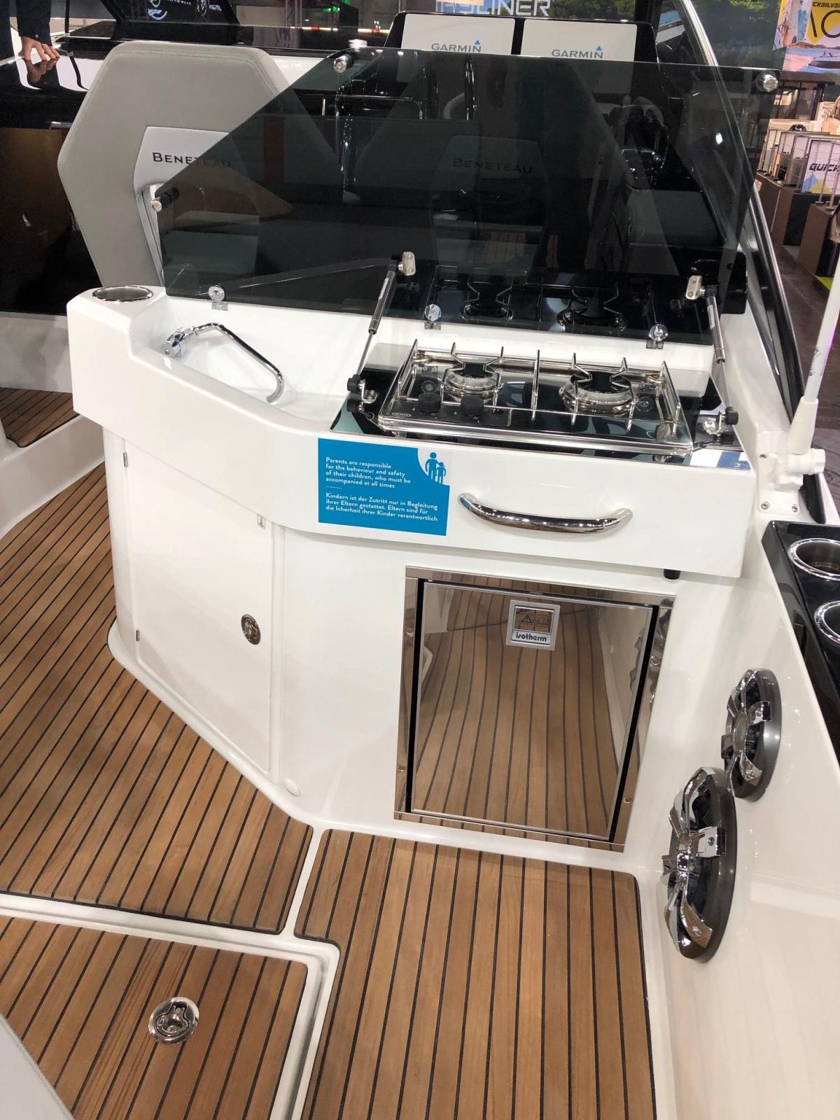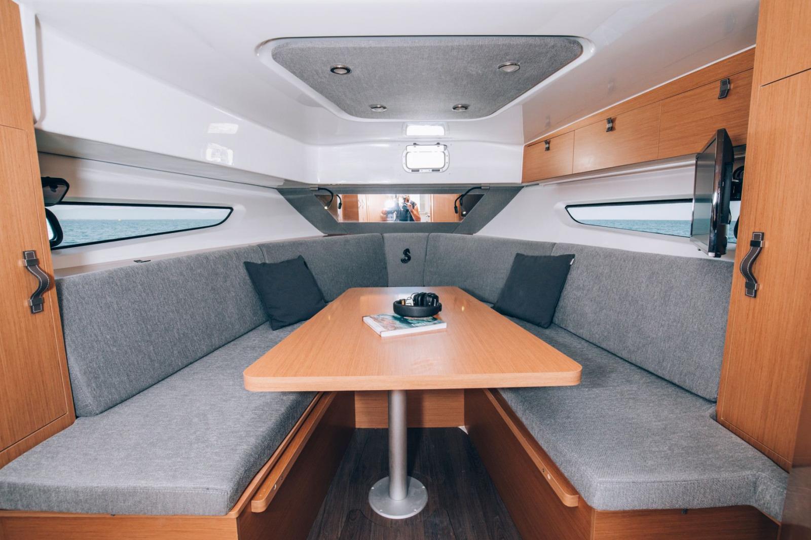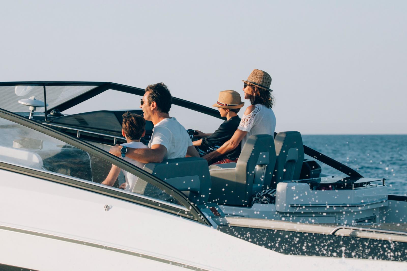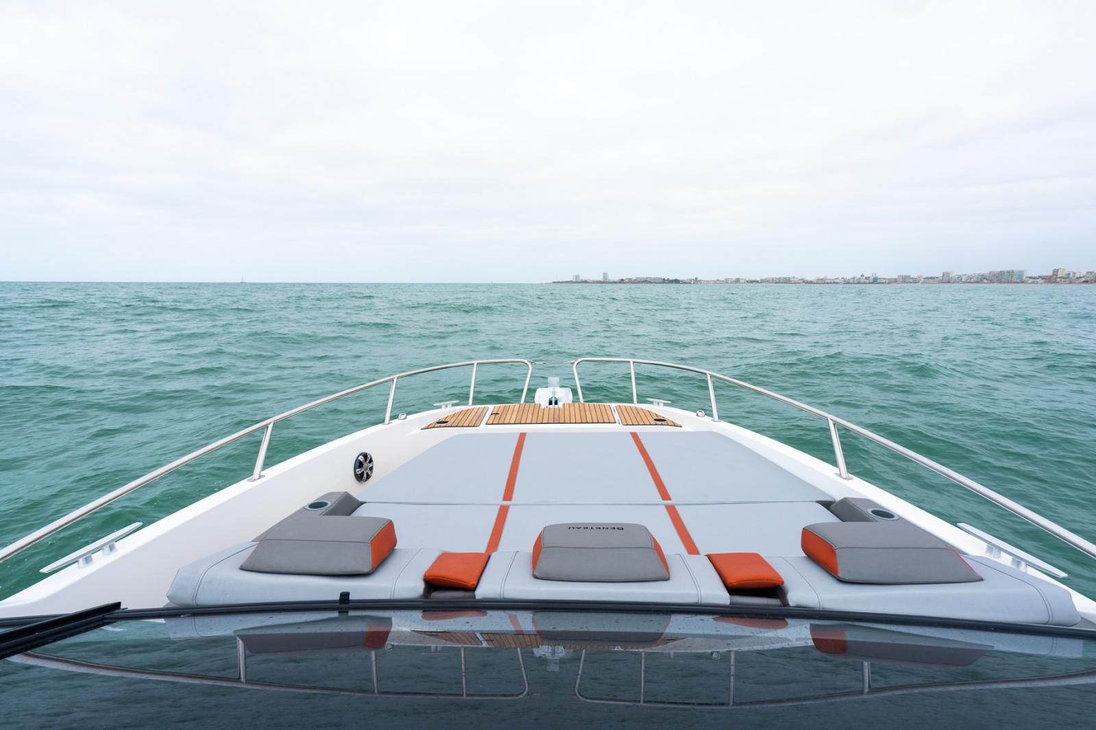 Aussi séduisant à l’œil qu’à vivre, le Flyer 10 offre une silhouette tendue joliment soulignée son par pare-brise pleine largeur avec retours latéraux. Pour permettre à quatre personnes de partager les sensations de navigation face à la mer, le poste de pilotage s’organise en deux sièges bolster côté console et une banquette double à bâbord. Maximisé dans ses volumes et sa modularité, le cockpit offre une assise en méridienne ainsi qu’une banquette arrière basculante pour former en quelques secondes un vaste solarium surplombant la plage de baignade.
