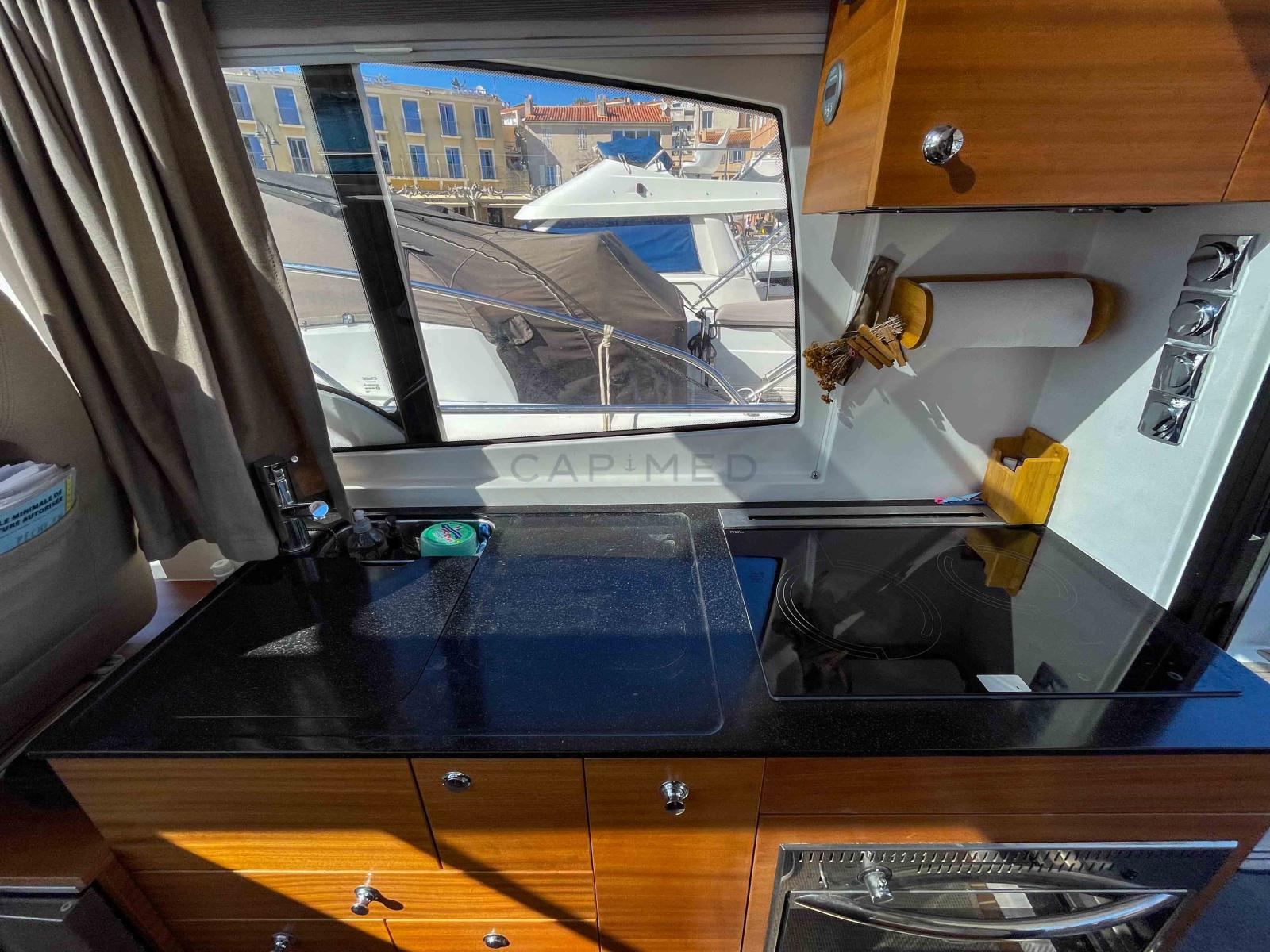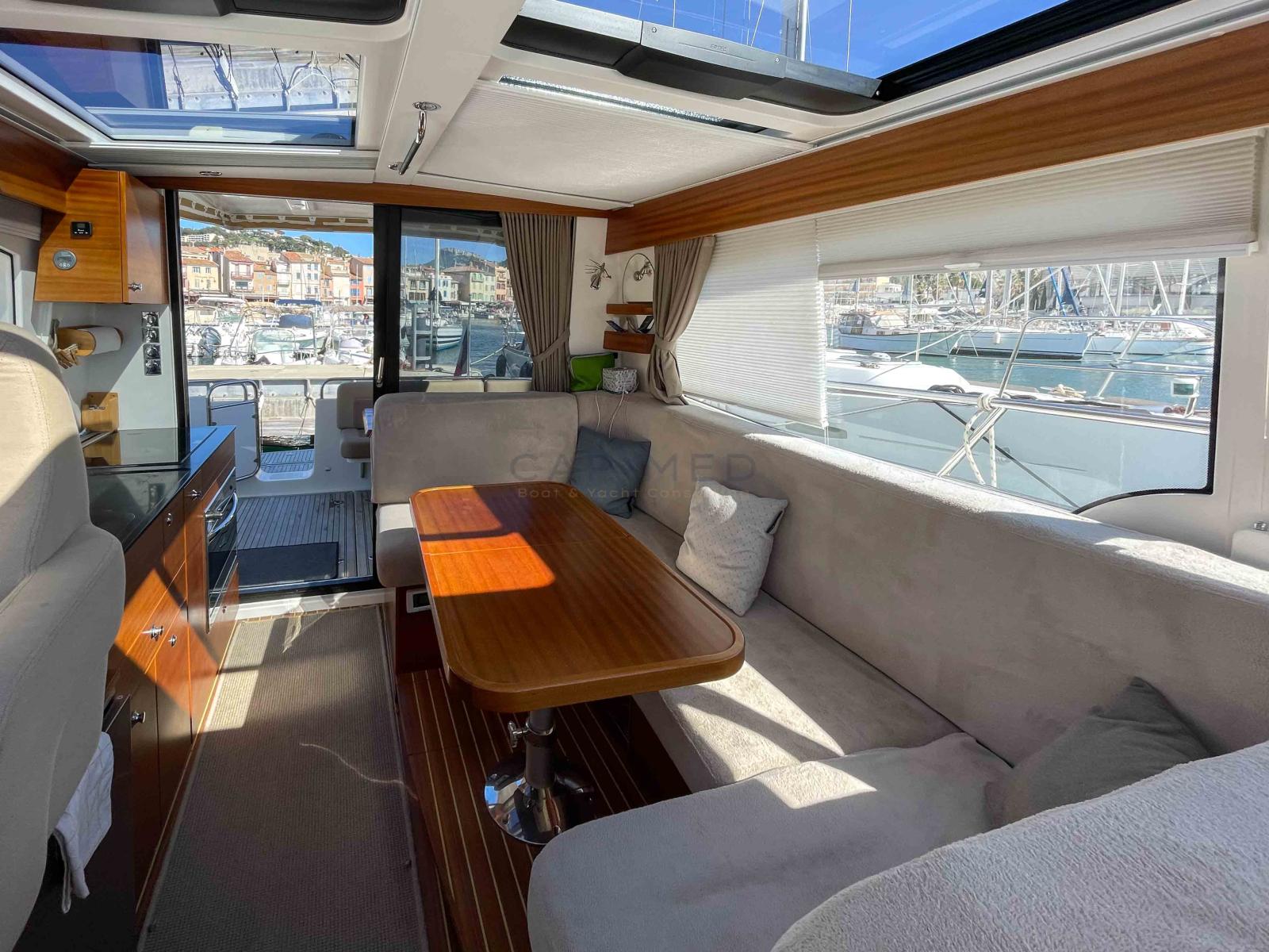 Confort et habitabilité : Intérieur chaleureux et lumineux grâce aux larges vitrages panoramiques, 2 cabines / 1 salle d'eau, carré transformable, bains de soleil avant, large plage arrière, cockpit teck spacieux et modulable,