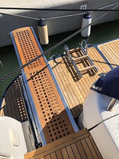 Alarme moteur, Eau sous pression, Douche de cockpit, Garage à annexe, Hard top, Passerelle, Plateforme arrière, Cockpit en teck, Prise de quai, Connexion eau sous pression à quai, Guindeau électrique, Echelle de bain, Annexe.