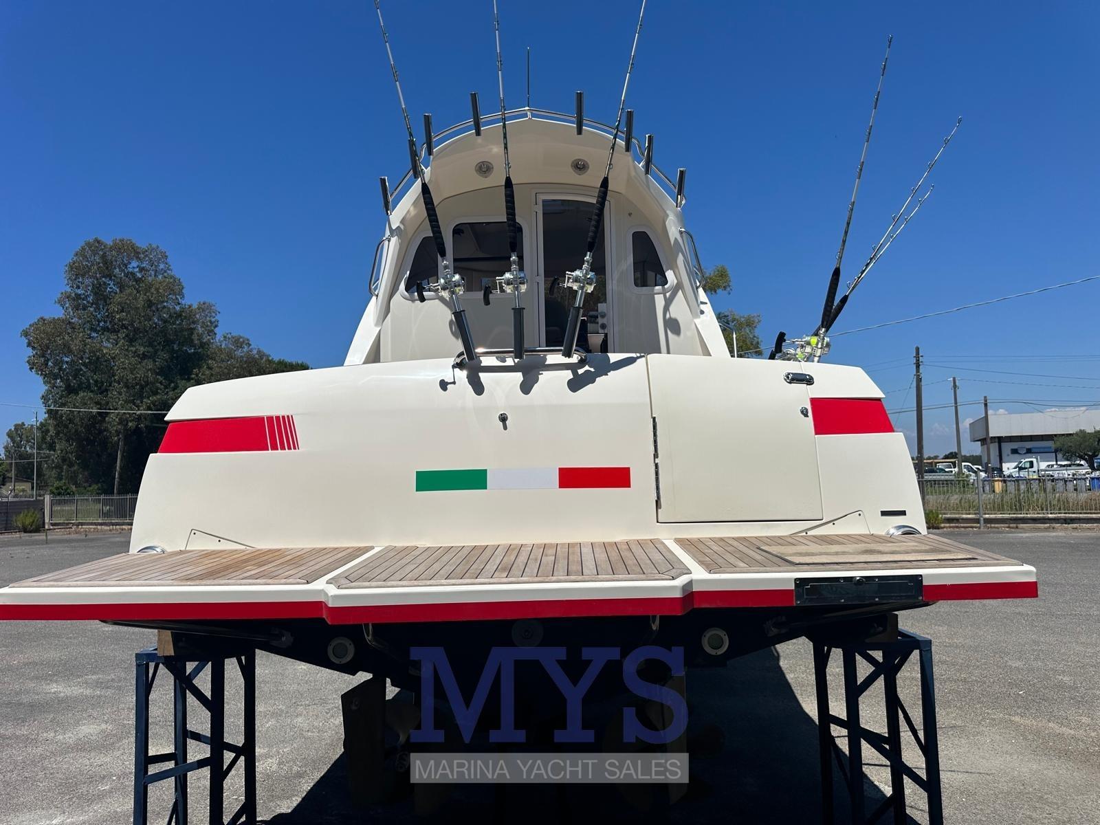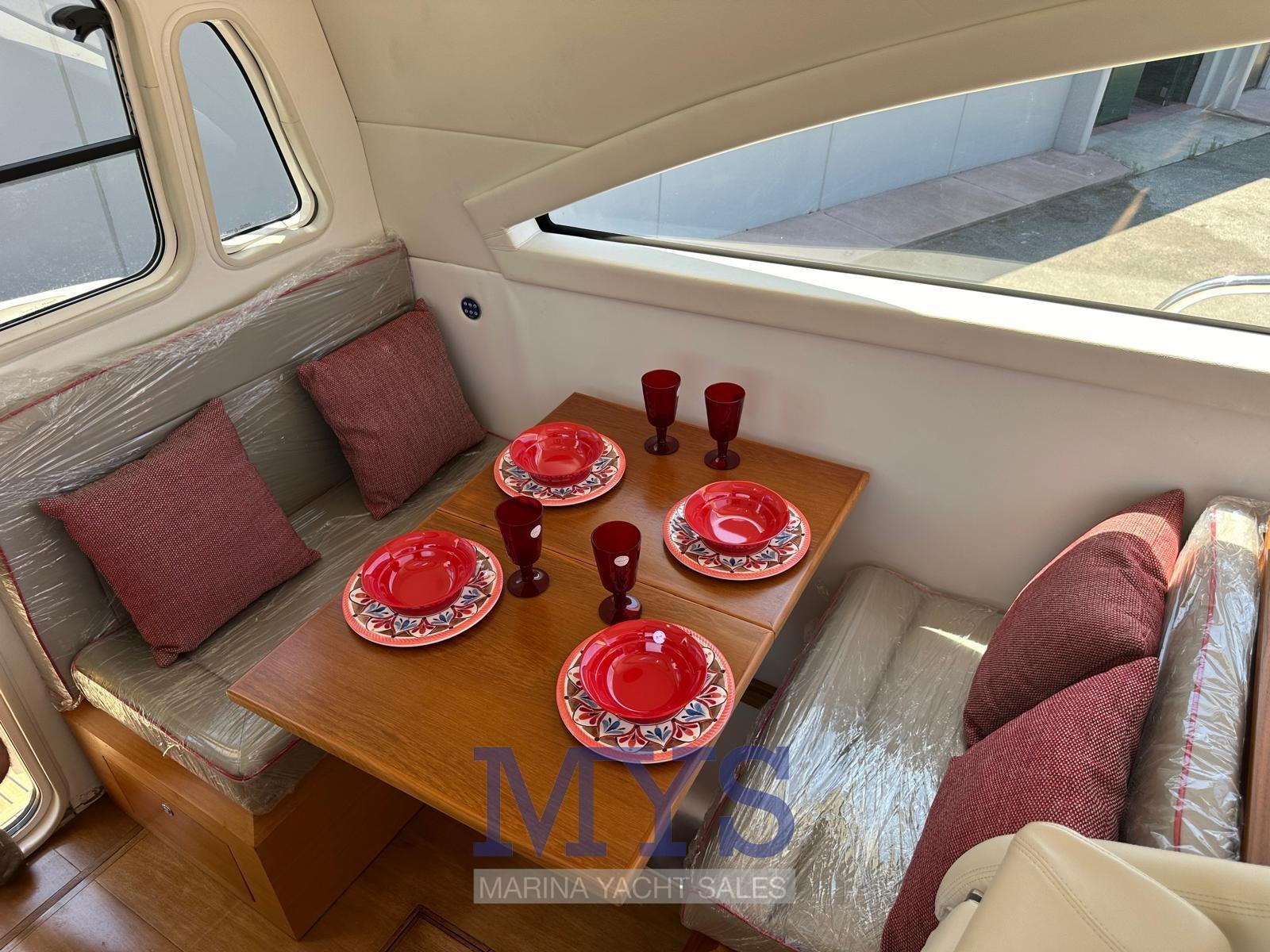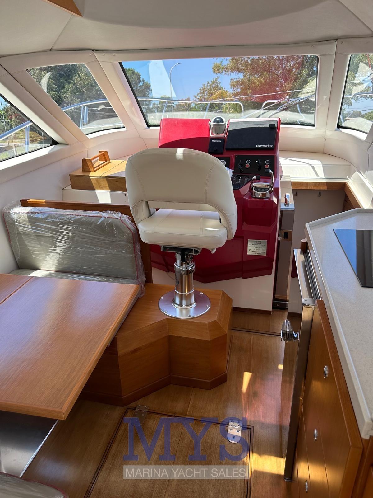 Alarme moteur, Eau sous pression, Douche de cockpit, Flaps hydrauliques, Indicateurs de flaps, Spots sous-marins, Plateforme arrière, Pompe de cale automatique, Porte latérale, Prise de quai, Connexion eau sous pression à quai, Guindeau électrique, Echelle de bain, Corne.