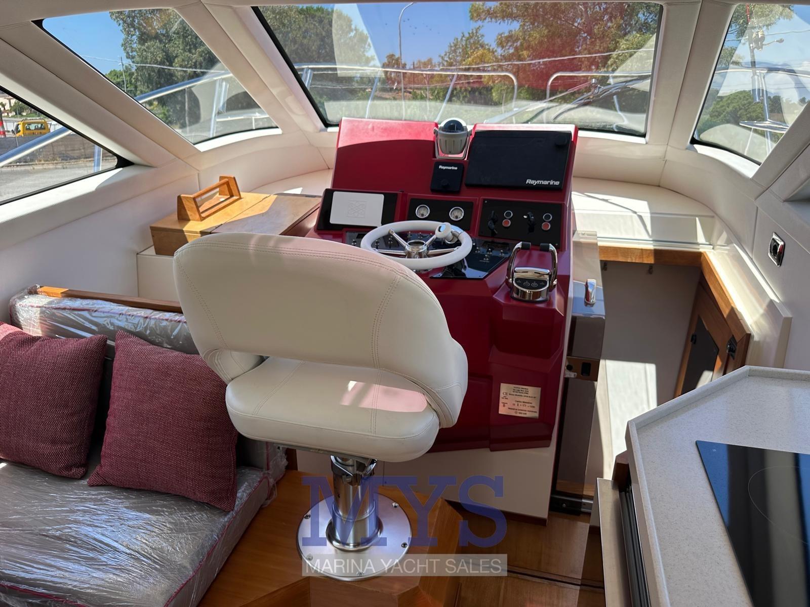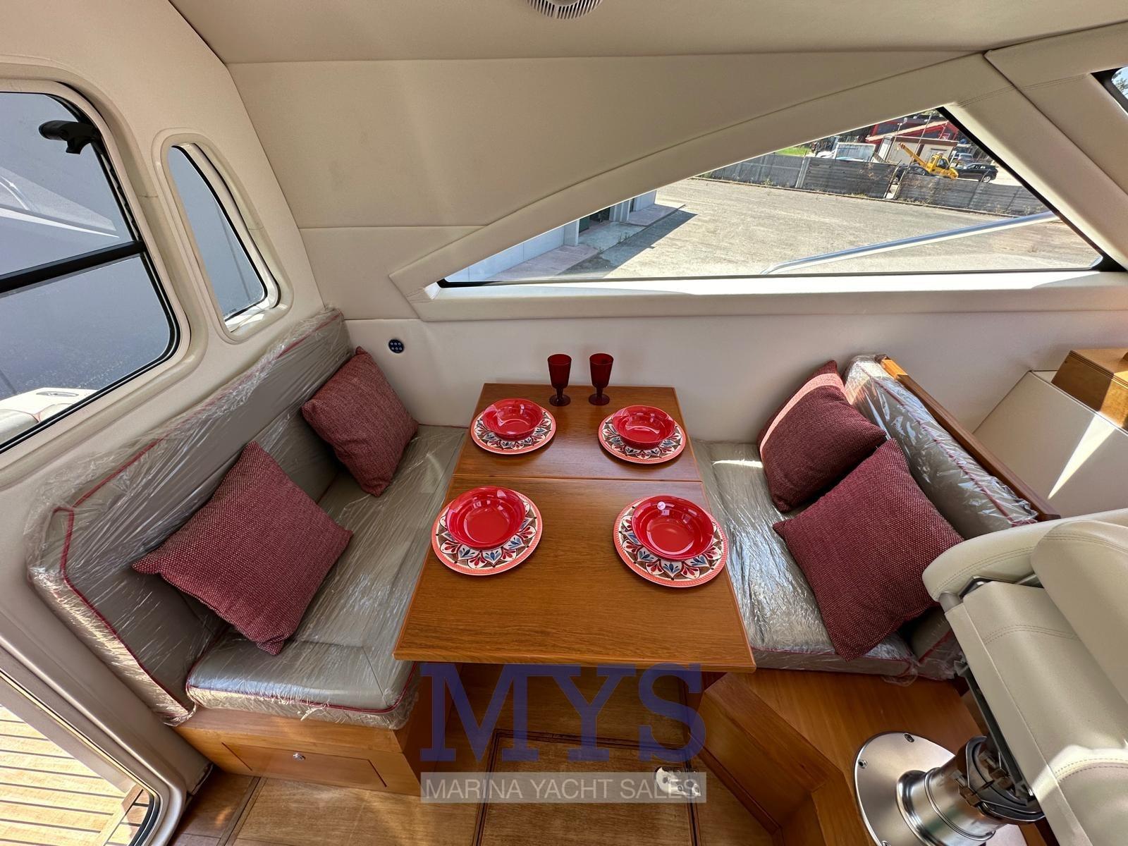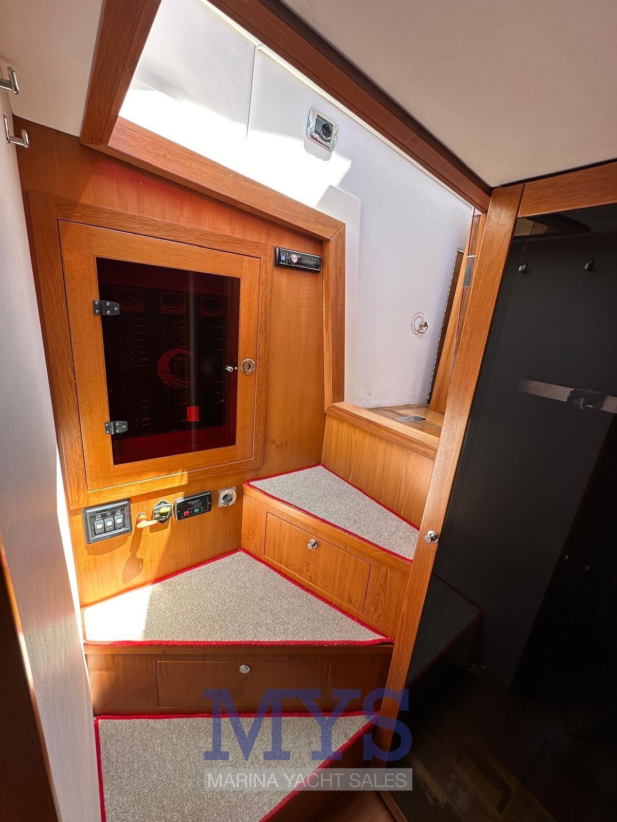 Alarme moteur, Eau sous pression, Douche de cockpit, Flaps hydrauliques, Indicateurs de flaps, Spots sous-marins, Plateforme arrière, Pompe de cale automatique, Porte latérale, Prise de quai, Connexion eau sous pression à quai, Guindeau électrique, Echelle de bain, Corne.