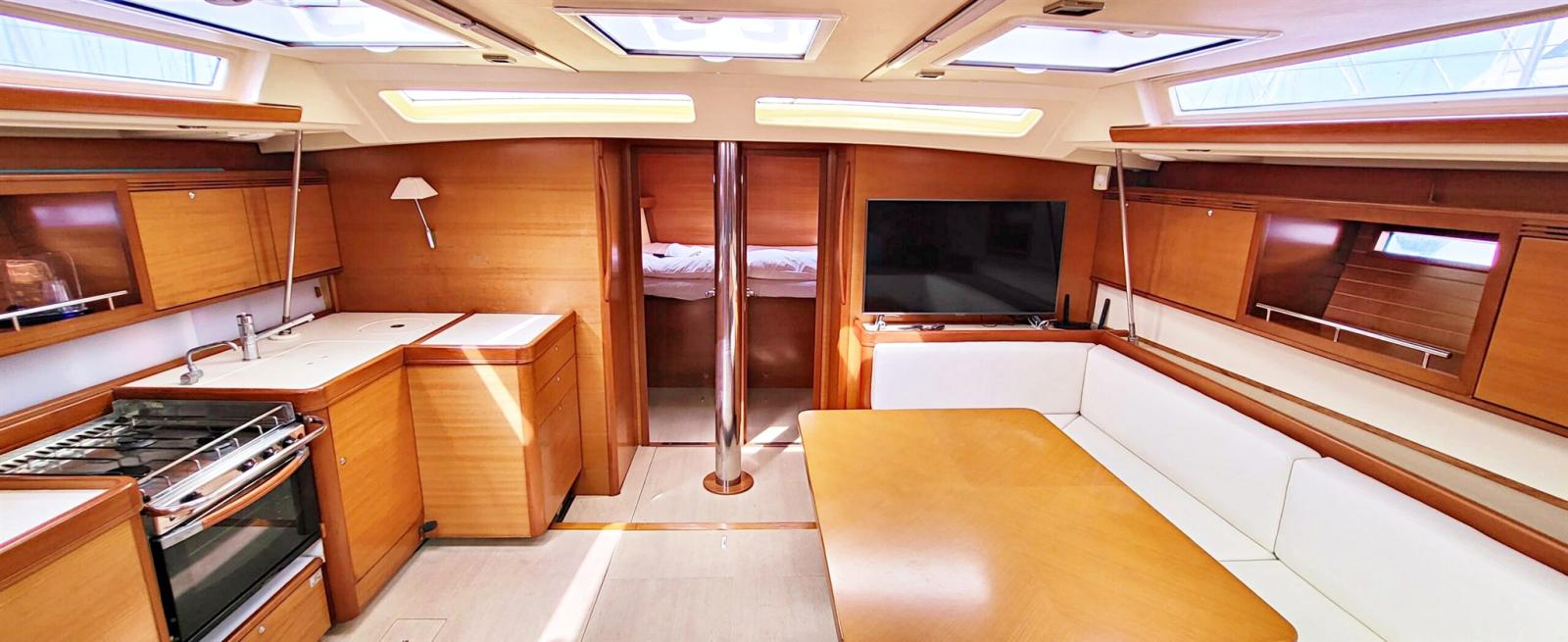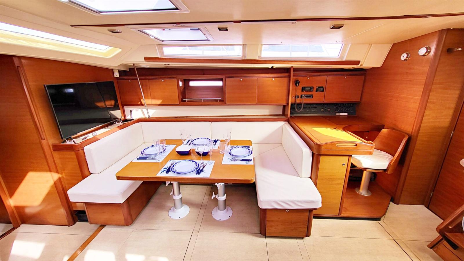 4 cabines, 4 salles de bain, cabine skipper avec salle de bain. NOUVEAU moteur Yanmar de 110 ch remplacé en décembre 2022. Nouvel onduleur. Nouvelle hélice en acier titane Ewol. Gréement neuf fin 2022. Drisses et écoutes neuves. De nouvelles bouées de sauvetage. Bimini. Capote. Coussins