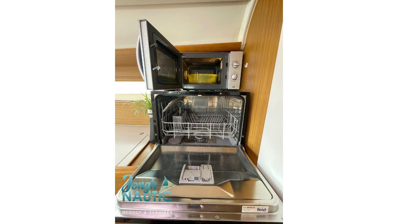 Chauffage, propulseur d'étrave, frigo, congélateur, lave-linge, lave-vaisselle, circuit 220V, panneau solaire, bossoirs, annexe, winch électrique, radar FURUNO, pont en teck,