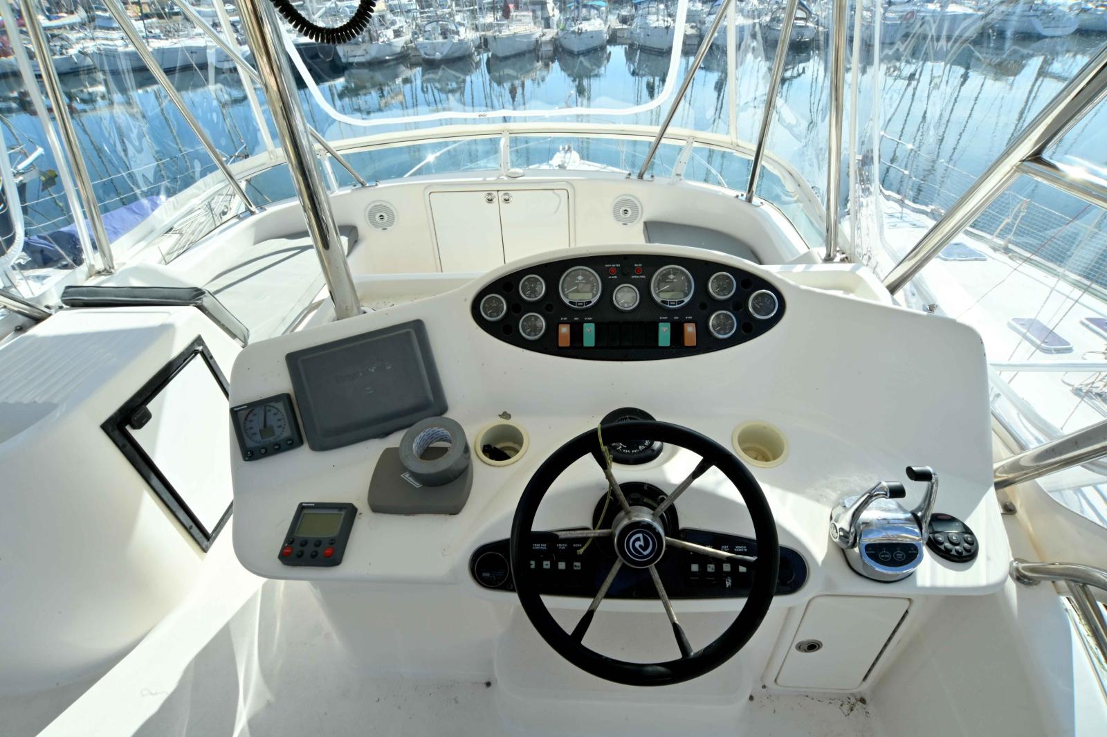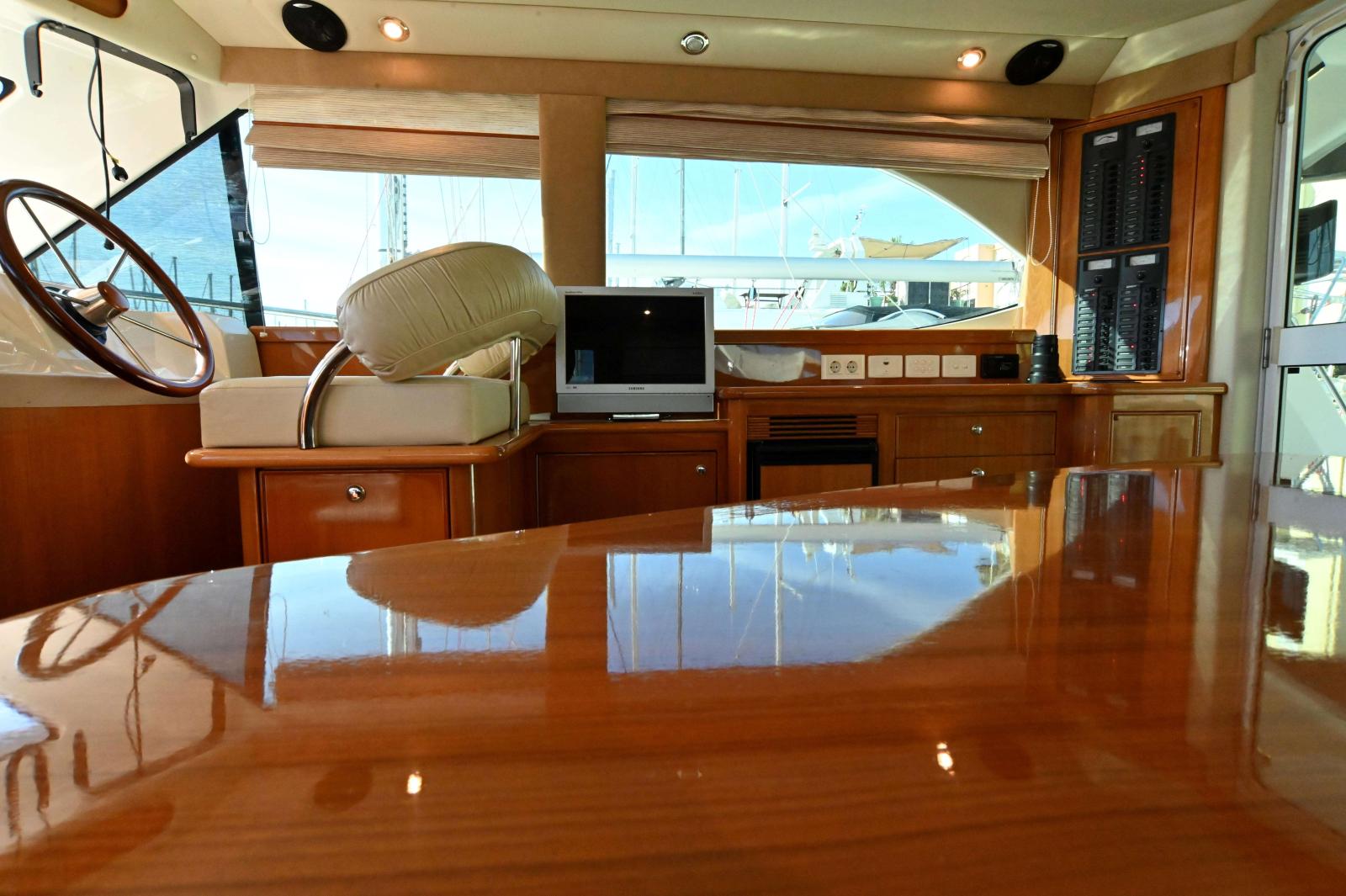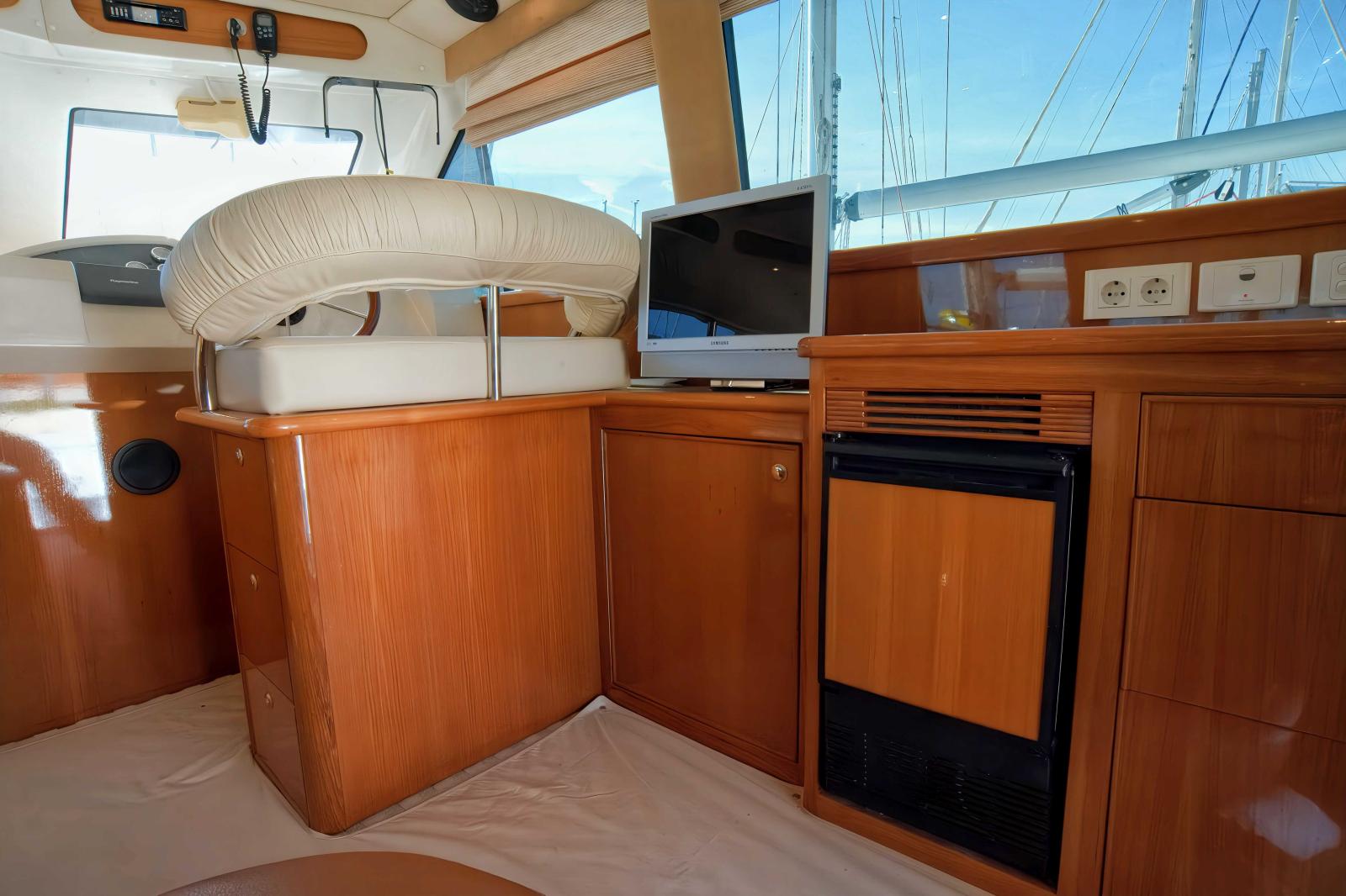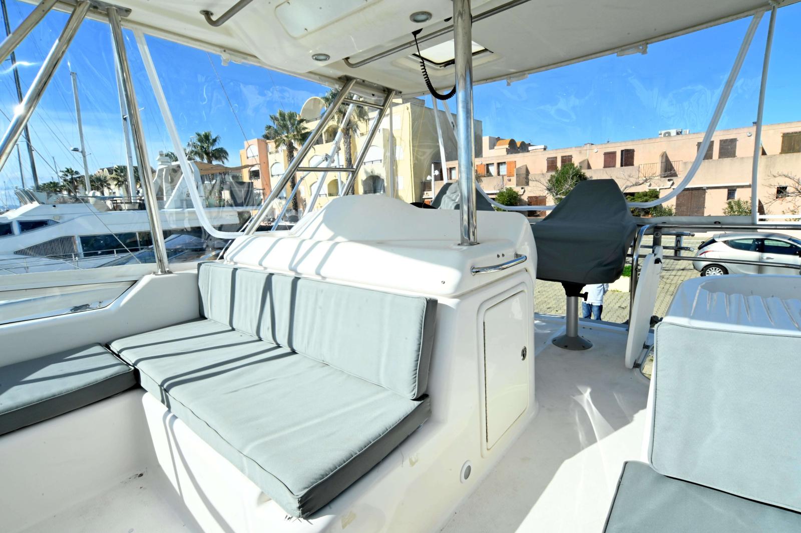 Une très grande plateforme de bain, un cockpit énorme, bien carré avec 3eme poste de commande, grand réfrigérateur pour les appâts ou le poisson, vivier etc...