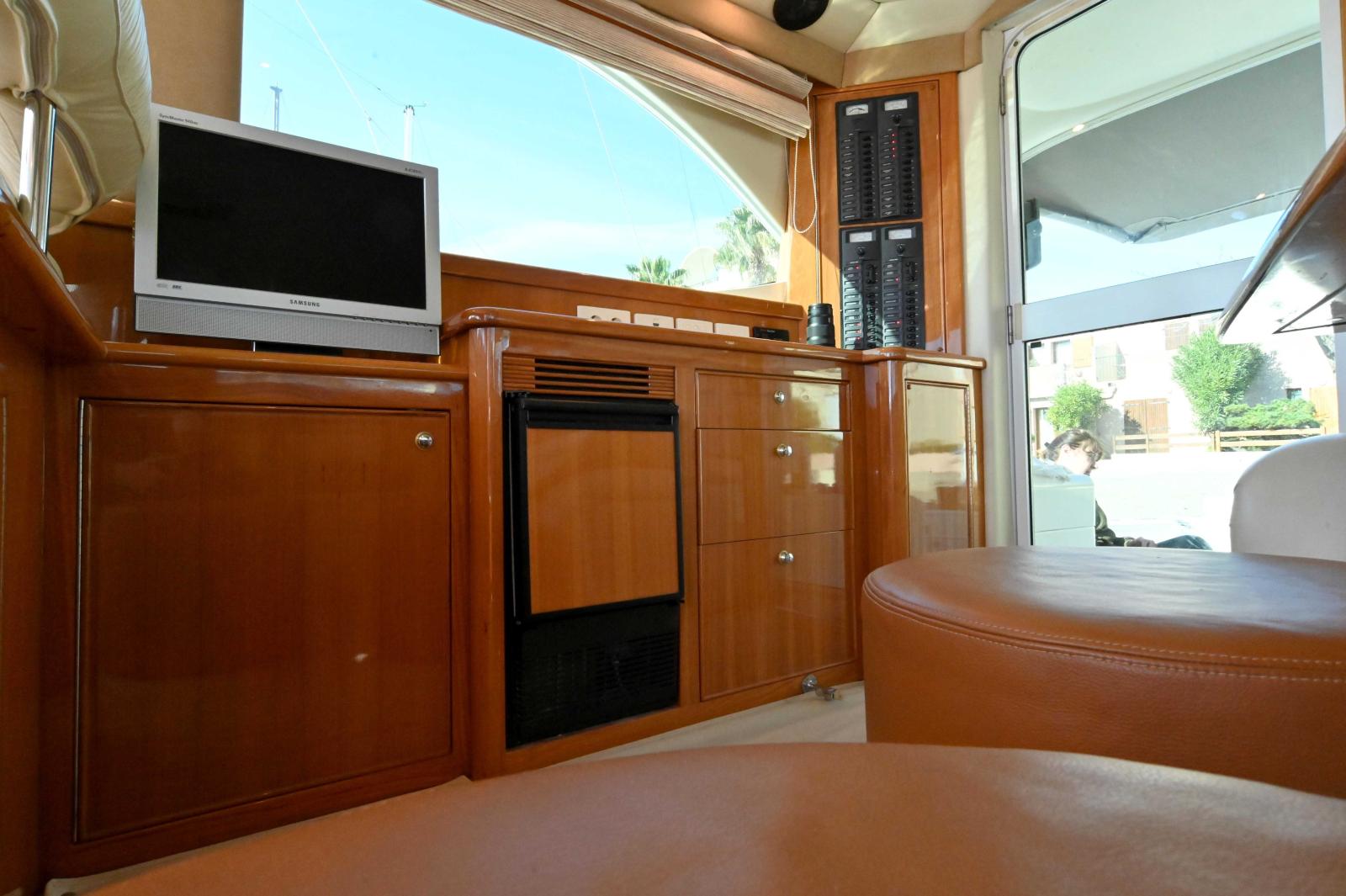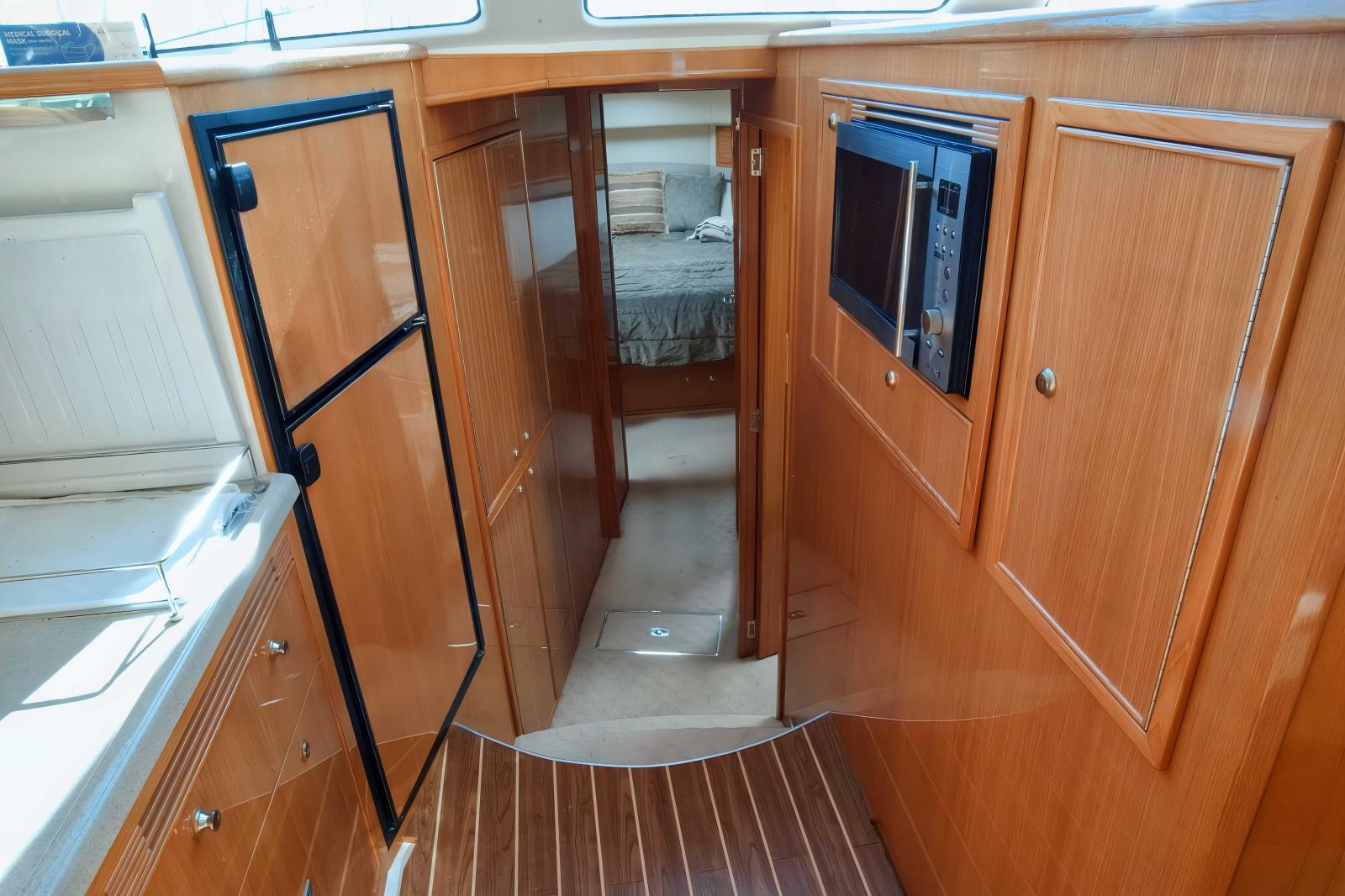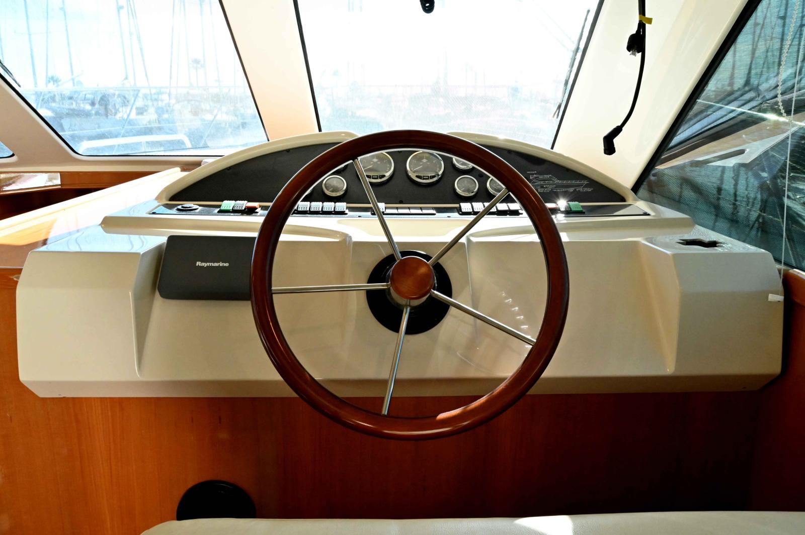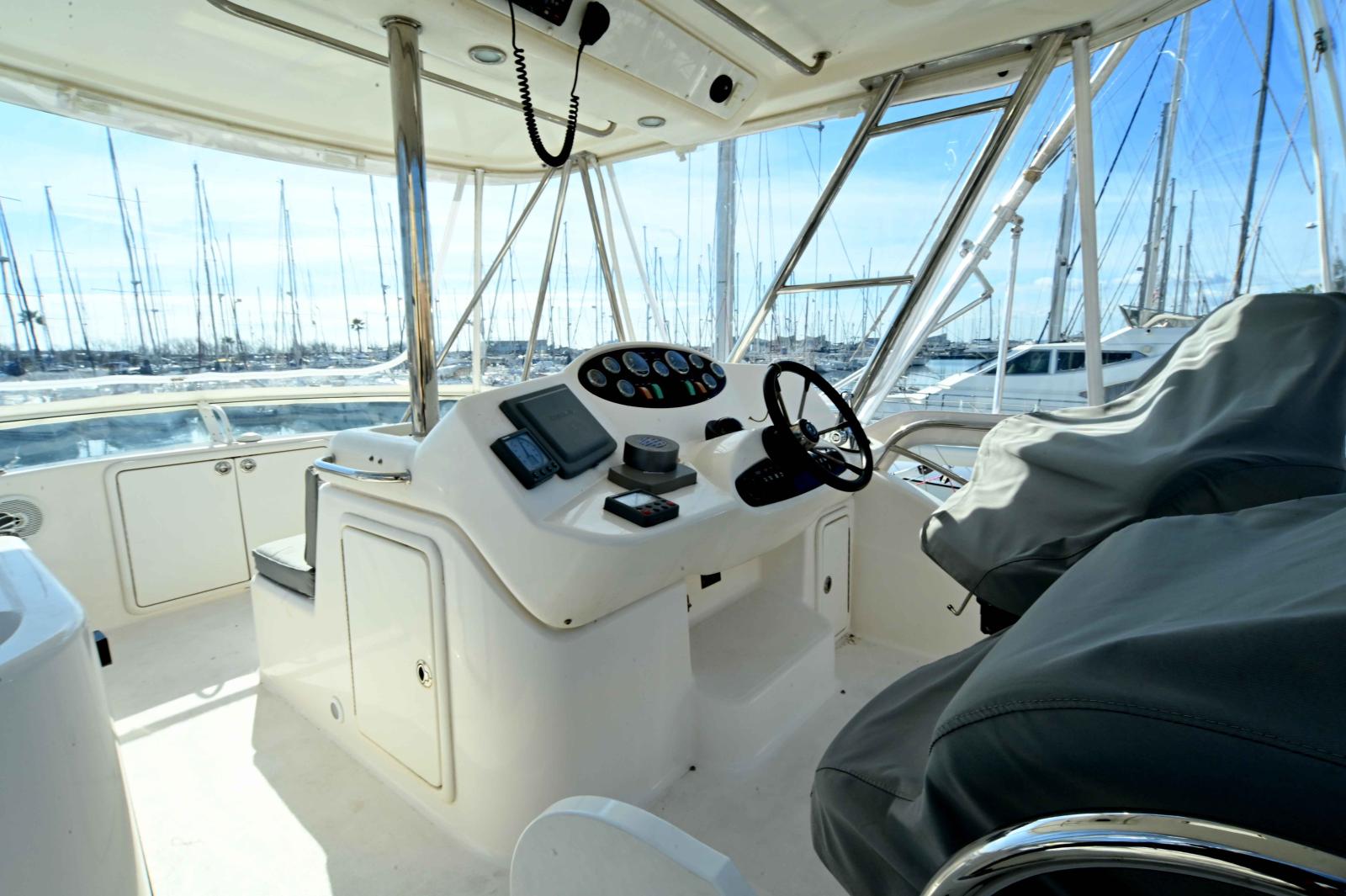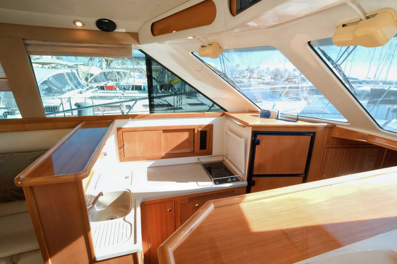 Une très grande plateforme de bain, un cockpit énorme, bien carré avec 3eme poste de commande, grand réfrigérateur pour les appâts ou le poisson, vivier etc...