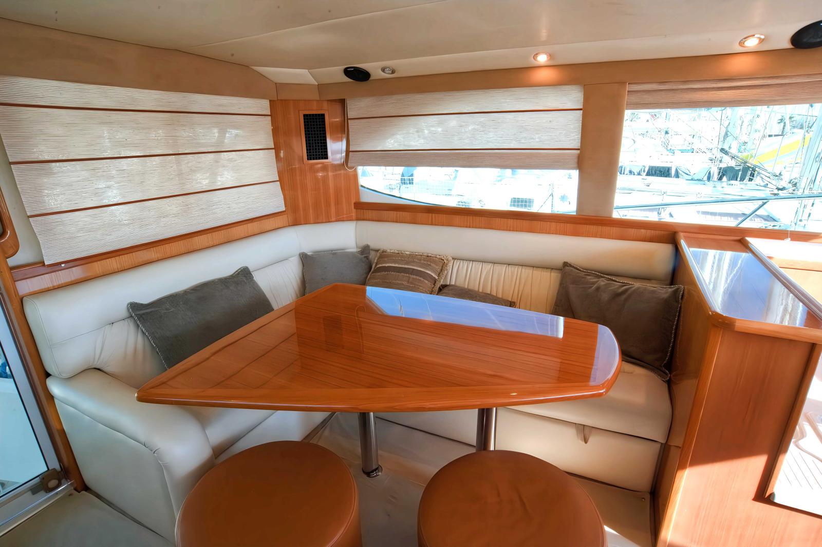 A l'intérieur, un beau salon avec table et banquette en L sur bâbord.