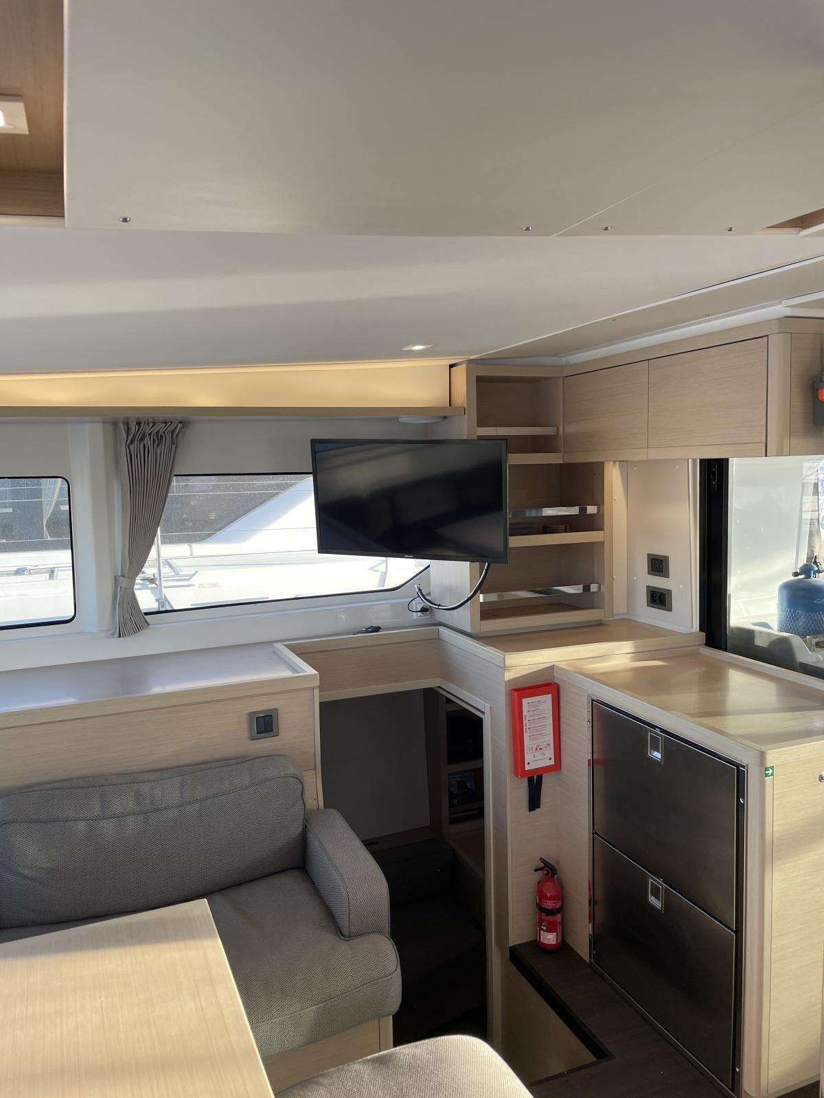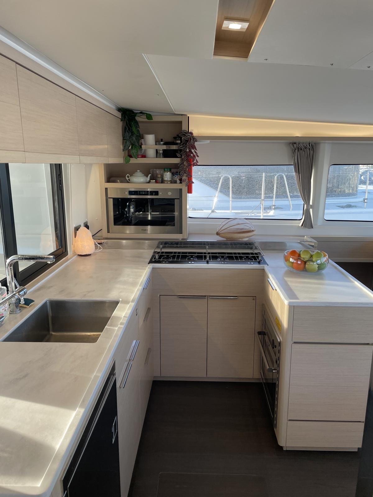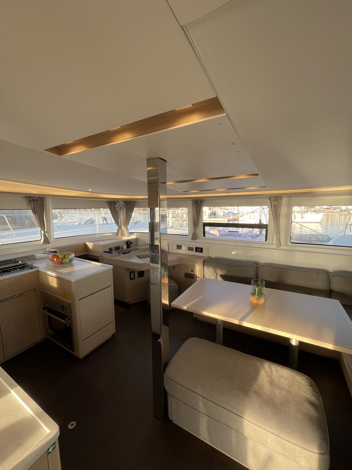 Equipement intérieur : Réfrigérateur 12 V (tiroirs inox), conservateur de froid12 V / - 5°C, four micro-ondes grill, lave-linge & sèche-linge dans meuble sur mesure, four Inox à gaz, plaque de cuisson Inox Grand Luxe à gaz, rideaux carré (dont porte d'entrée) et cabines, prise USB 12 V intérieure et extérieure, éclairage de courtoisie dans le carré et les cabines, climatisation reversible CRUISER 48000 BTU dans les cabines et le carré, dessalinisateur 105 L/H, panneaux solaires 4 X 150 W, convertisseur 2000 W, WC électrique, 3 batteries AGM 140 A supplémentaires (toutes batteries AGM), générateur FISHER PANDA 5000i, ventilateurs pour carré et cabines, grand vitrage ouvrant sur le cockpit avant depuis le carré, sellerie Grand Confort (Marble), couchette double dans le carré, lits avec sommier à lattes, lits avec sur-matelas sur-mesure, éclairage de courtoisie intérieur, pompe électrique eau de mer à la cuisine.