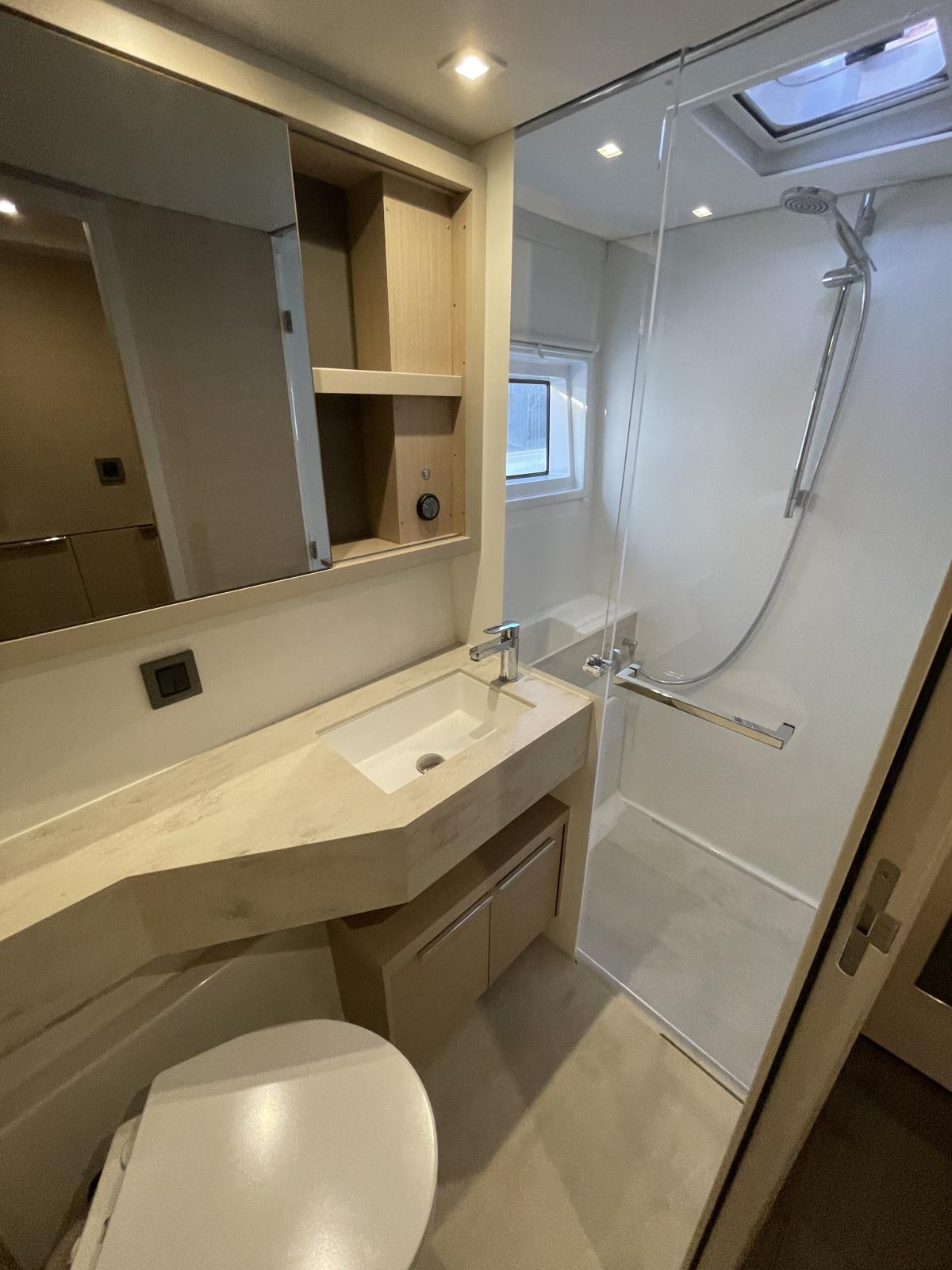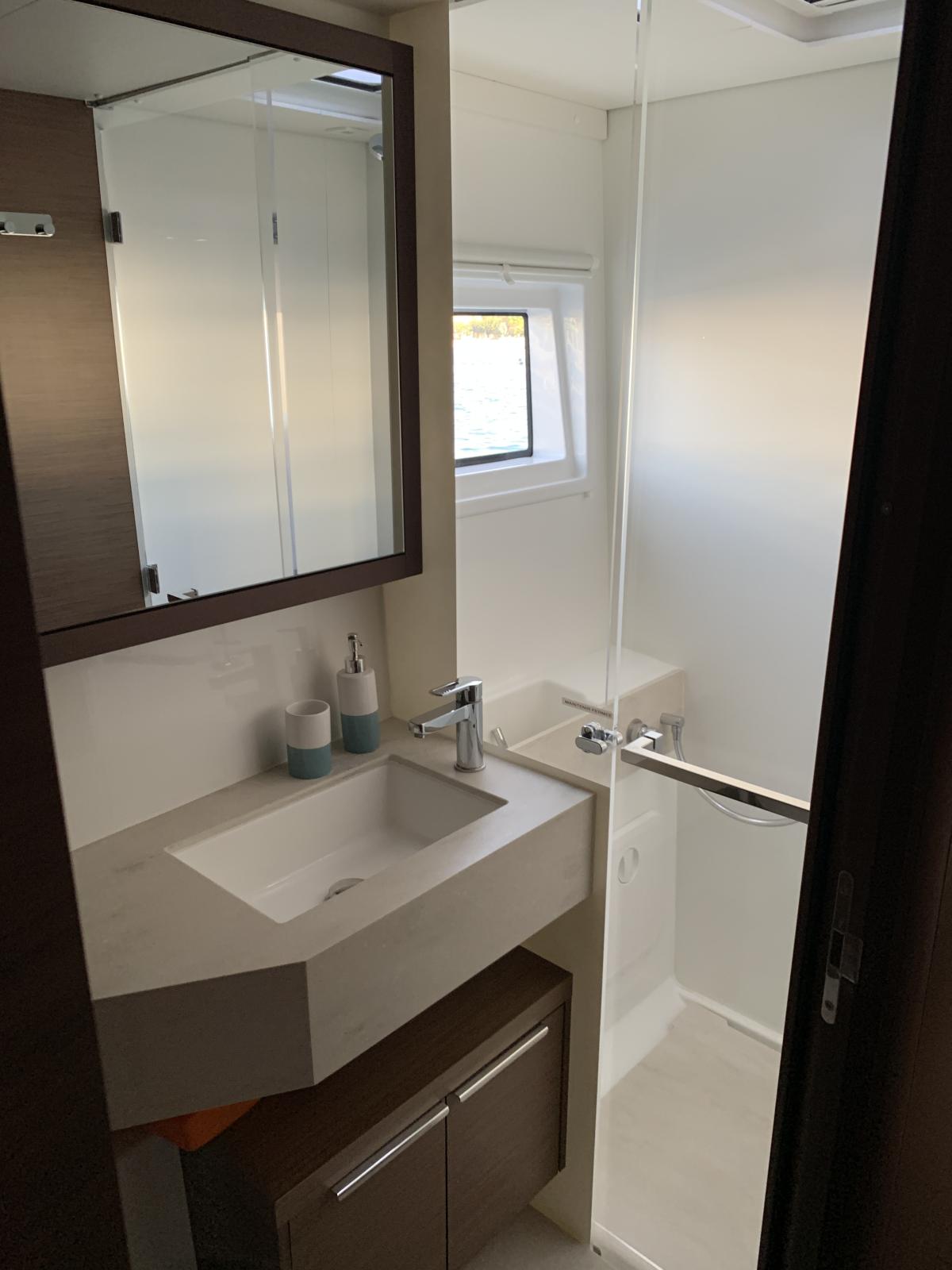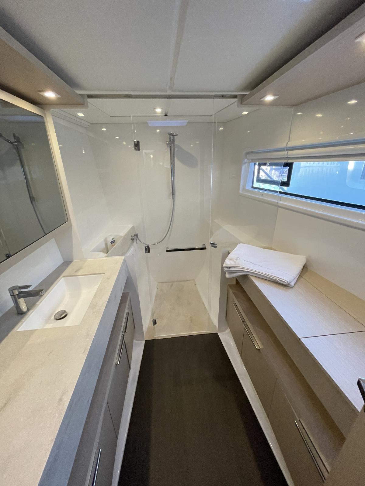 Equipement intérieur : Réfrigérateur 12 V (tiroirs inox), conservateur de froid12 V / - 5°C, four micro-ondes grill, lave-linge & sèche-linge dans meuble sur mesure, four Inox à gaz, plaque de cuisson Inox Grand Luxe à gaz, rideaux carré (dont porte d'entrée) et cabines, prise USB 12 V intérieure et extérieure, éclairage de courtoisie dans le carré et les cabines, climatisation reversible CRUISER 48000 BTU dans les cabines et le carré, dessalinisateur 105 L/H, panneaux solaires 4 X 150 W, convertisseur 2000 W, WC électrique, 3 batteries AGM 140 A supplémentaires (toutes batteries AGM), générateur FISHER PANDA 5000i, ventilateurs pour carré et cabines, grand vitrage ouvrant sur le cockpit avant depuis le carré, sellerie Grand Confort (Marble), couchette double dans le carré, lits avec sommier à lattes, lits avec sur-matelas sur-mesure, éclairage de courtoisie intérieur, pompe électrique eau de mer à la cuisine.