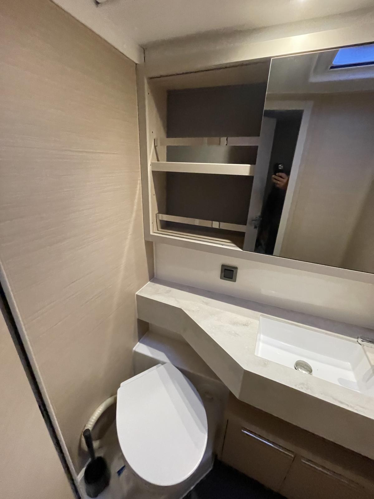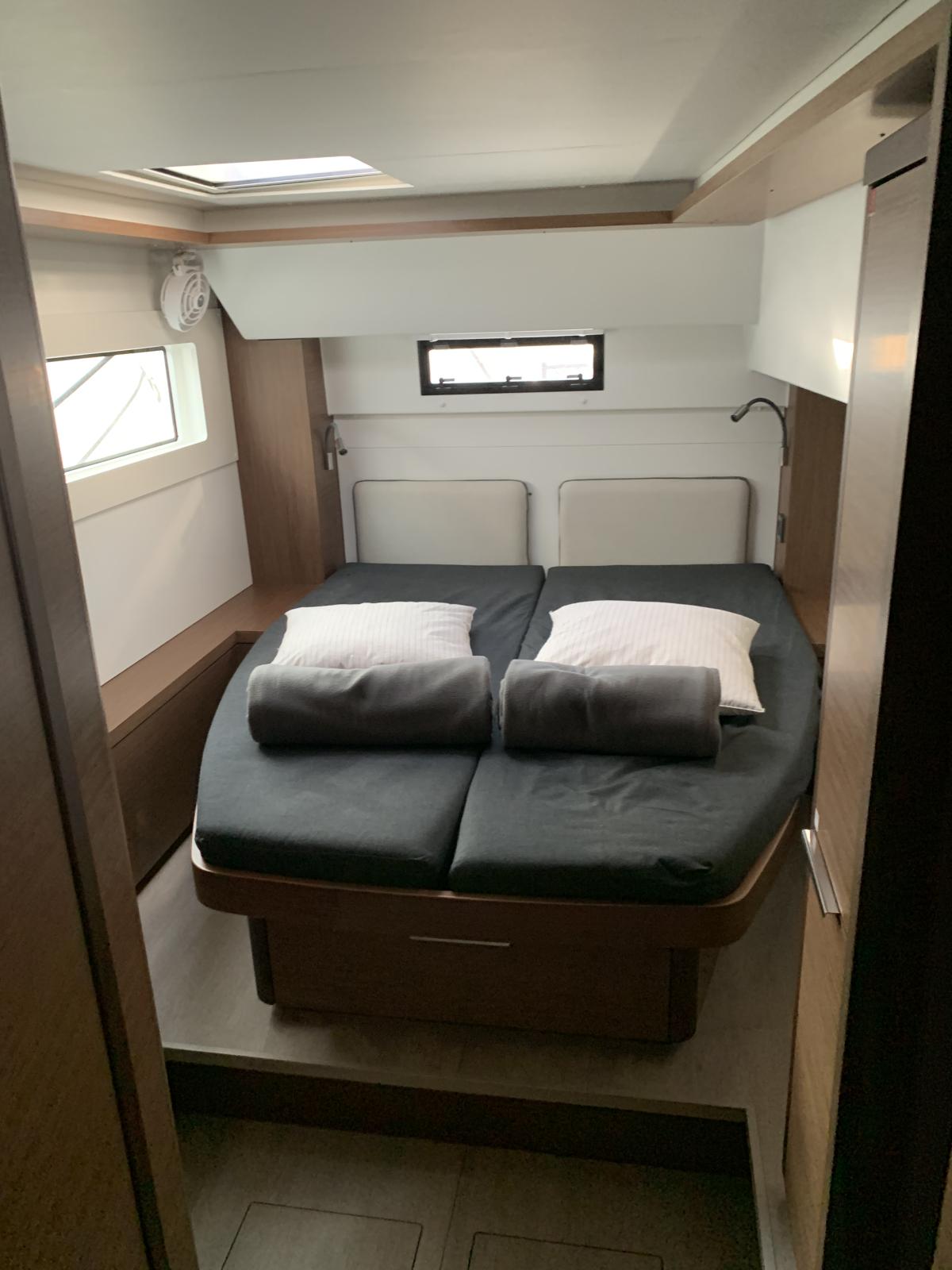 Version Millésime 2021 : Version Elégance Line, 3 cabines doubles, 3 salles d'eau, boiserie claire (Alpi White Oak, plancher Fortezza), aménagement WC & douche dans la pointe avant bâbord, aménagement couchette simple dans la pointe avant tribord.