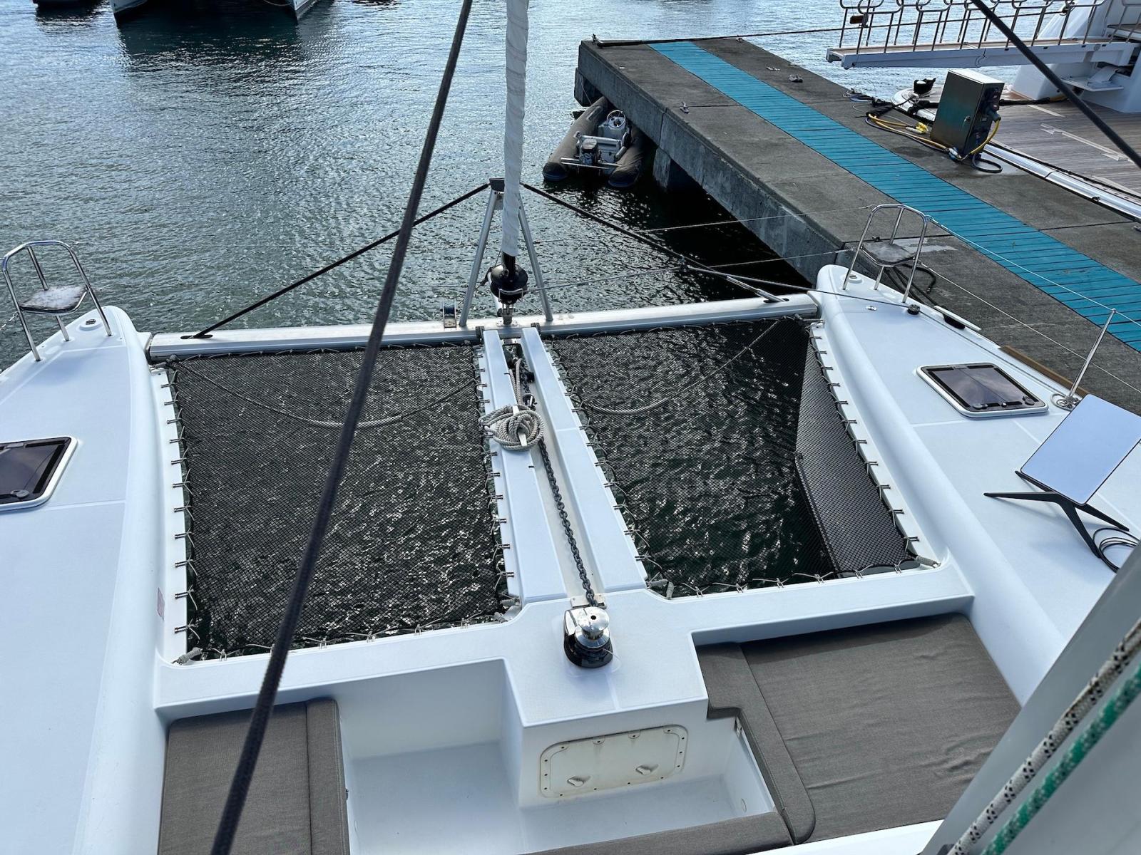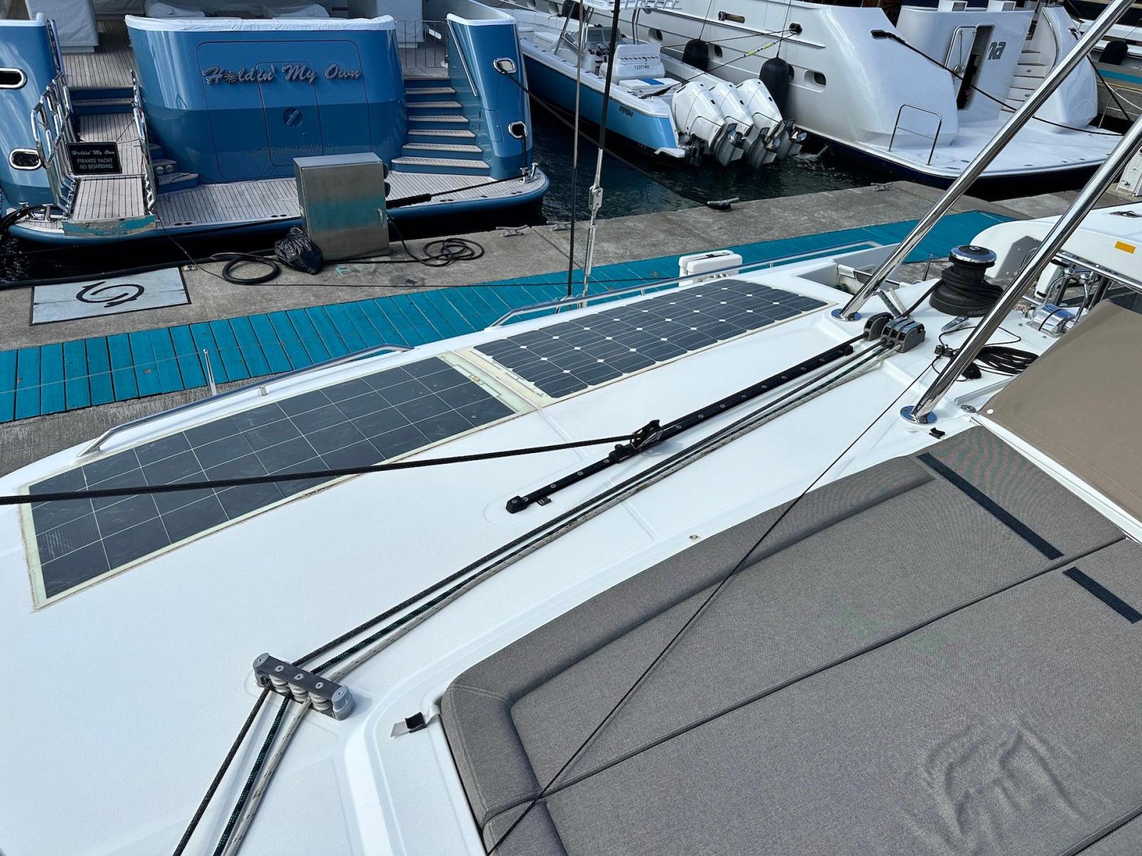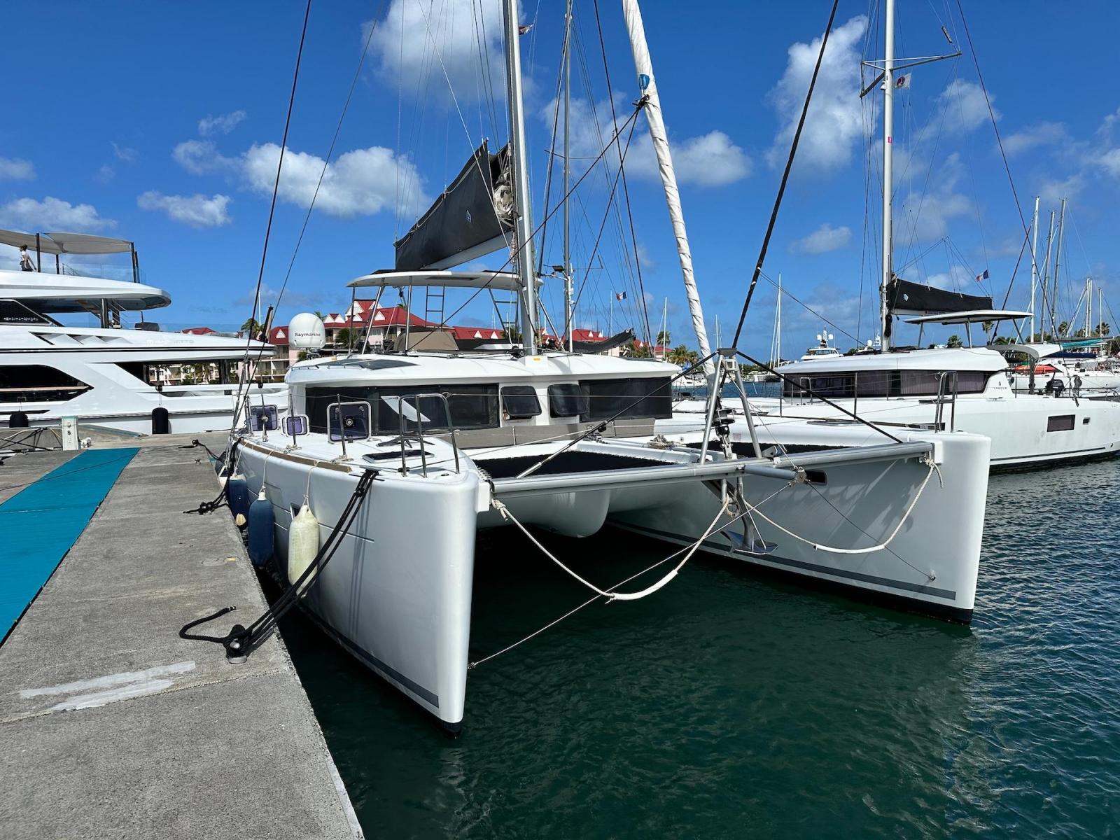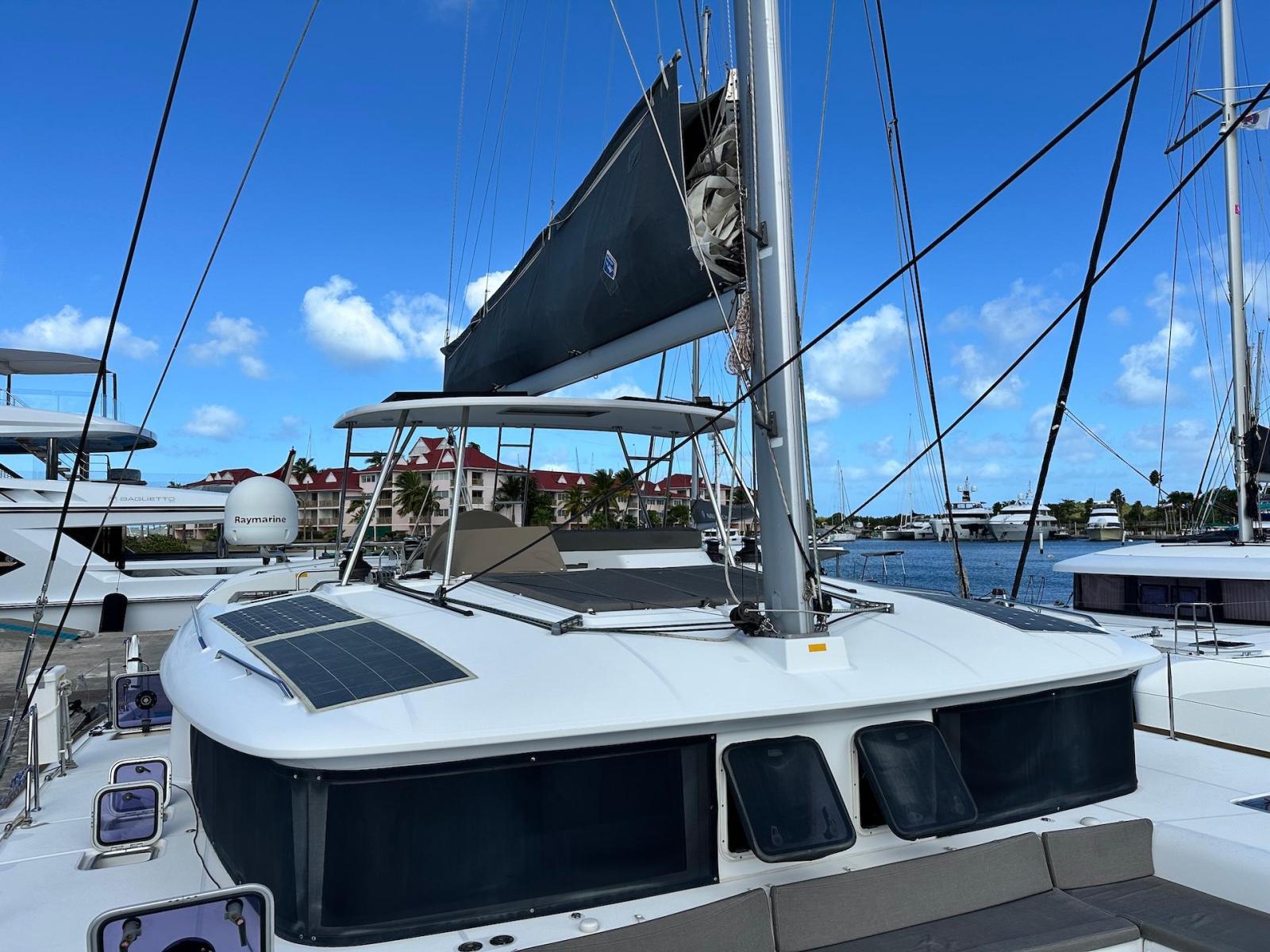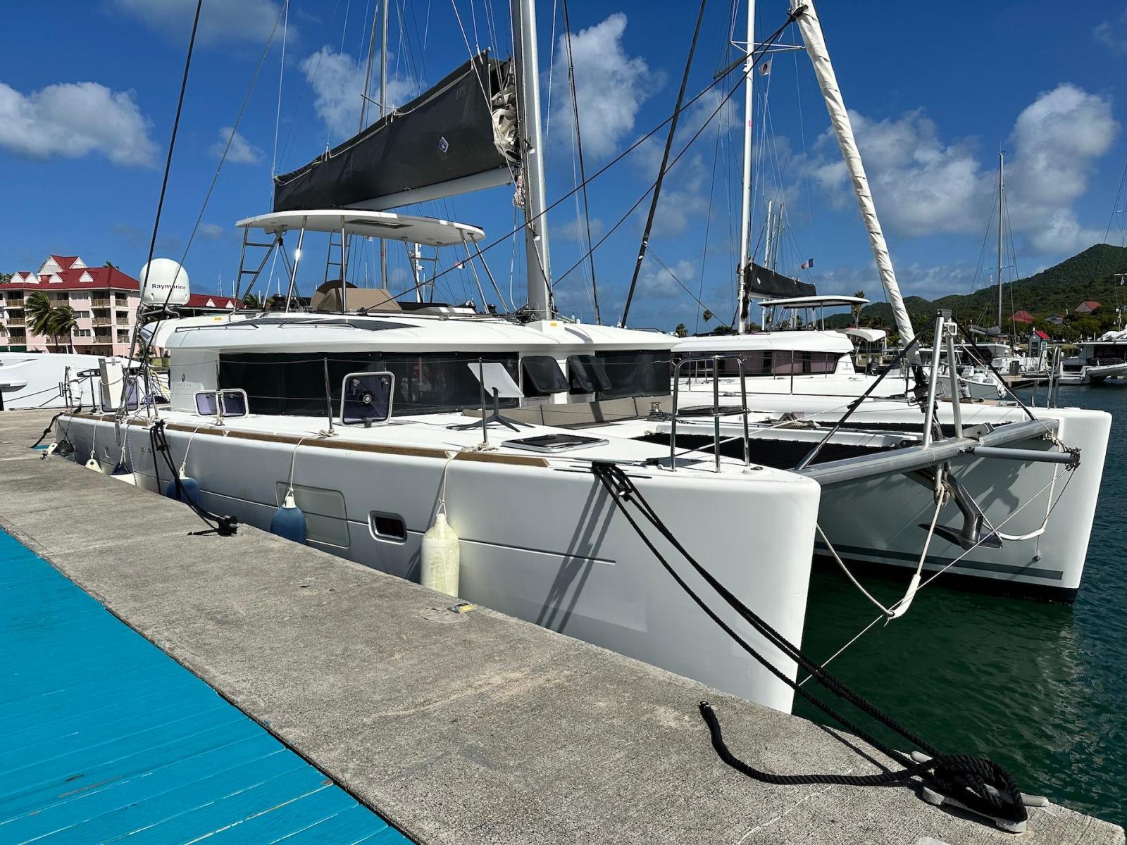 SpecificationInterior Equipment:• 4 x A/C Units (Cruisair 48,000 BTU) – Factory Installed• 6 x 2-speed fans• Watermaker AQUA-BASE• 6-filter + remineralizer drinking water filtration system (2023)• Washing Machine (BEKO, 5kg)• 2 x TVs with Raymarine Antenna• Fusion MS-RA 70 Sound System with 6 built-in speakers• Safe (Installed 2023)• New Carpet (2023)• New Mattress in Owner’s Cabin (2023) Galley:• Propane Oven & Stove (ENO) + 6 propane bottles• Refrigerator & Freezer (Frigonautica)• Microwave (Samsung)• Dishwasher (Electrolux)• Saltwater tap with foot pump• Blender & Coffee Grinder• Full set of dishes and glasses Bathrooms:• 3 x Electric toilets (saltwater flush with macerators)• 3 x Holding tanks• Shower in each bathroom• Teak floors Engines & Propulsion:• 2 x Yanmar 54HP (2,600 hrs)• 3-bladed folding props (Flex-O-Fold, 2021) Electrical & Power:• Cummins Onan Generator (11 KVA, 2,200 hrs)• 4 x Lithium Batteries (2023)• Solar Array (3,000 watts total, 2023):• 4 x 150W flexible solar panels (cabin top)• 4 x solar panels on stainless steel arch (2023)• Victron 5000W Inverter/Charger (2024) – Can power all A/C units Exterior Equipment:• Complete cushion set (cockpit, flybridge, forward sunbathing area)• Teak cockpit• Hardtop Bimini (2023)• Cockpit refrigerator (Waeco)• Passerelle• 48Kg ULTRA stainless steel anchor• 300-foot galvanized steel anchor chain (2023)• Windlass (QUICK) with chain counter + spare Delta anchor, chain & rode• Black trampoline replacement (2023)• Davits Sails & Rigging:• Square Top Mainsail• Roller Furling Genoa• Code 0 on roller furling (2016)• Asymmetrical Spinnaker w/ sock (1.5 oz, 2019)• Storm Jib (2019)• Headstay replaced (2021)• Dyneema Reefing Lines (12mm)• Jib Drum (2023)• 1 x Electric Harken Winch Electronics & Navigation (Raymarine):• Plotter, Depth Sounder, Wind Speed/Direction, Radar, AIS• Autopilot• VHF Radio at Helm & Nav StationExtras & Safety:• 10ft VIPER Dinghy with 15HP Mercury Outboard (electric start, 2019)