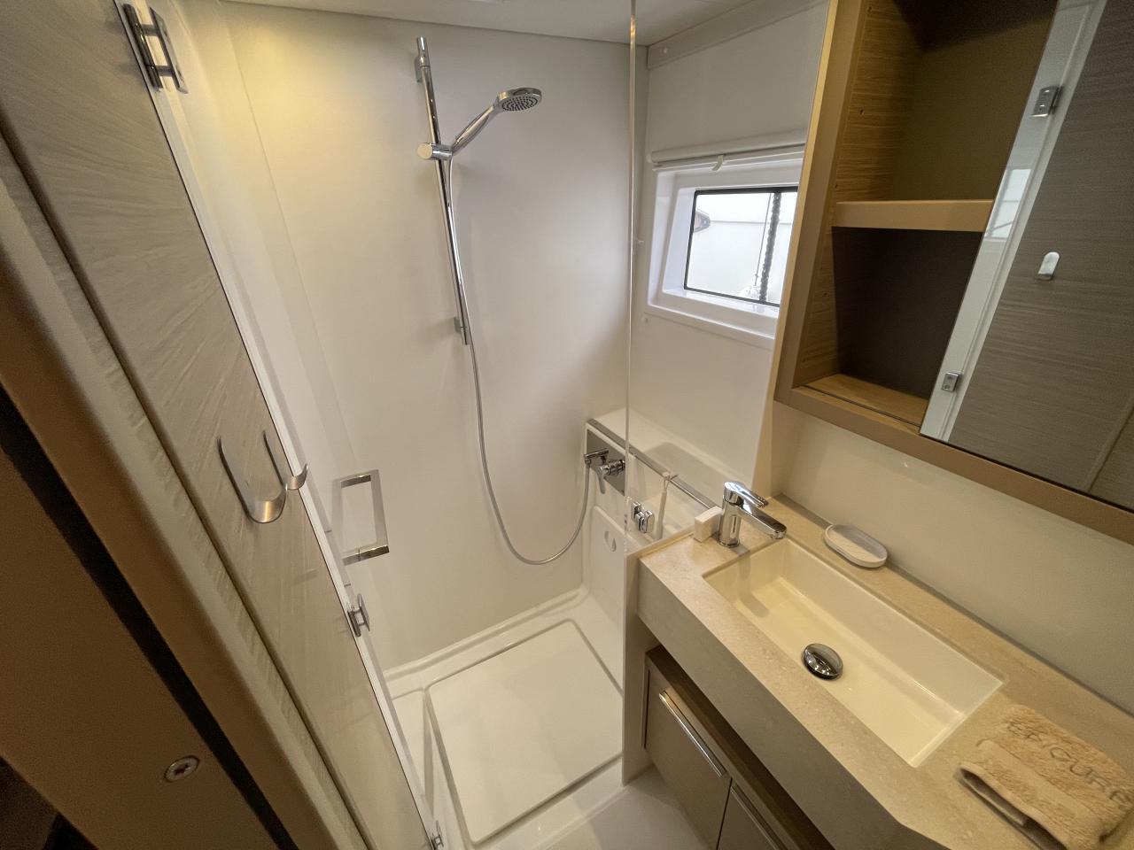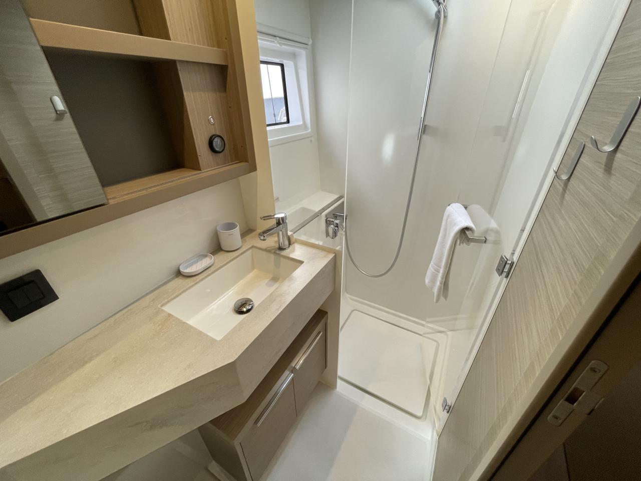 Une salle d’eau avec douche, lavabo et WC électrique avec holding tank