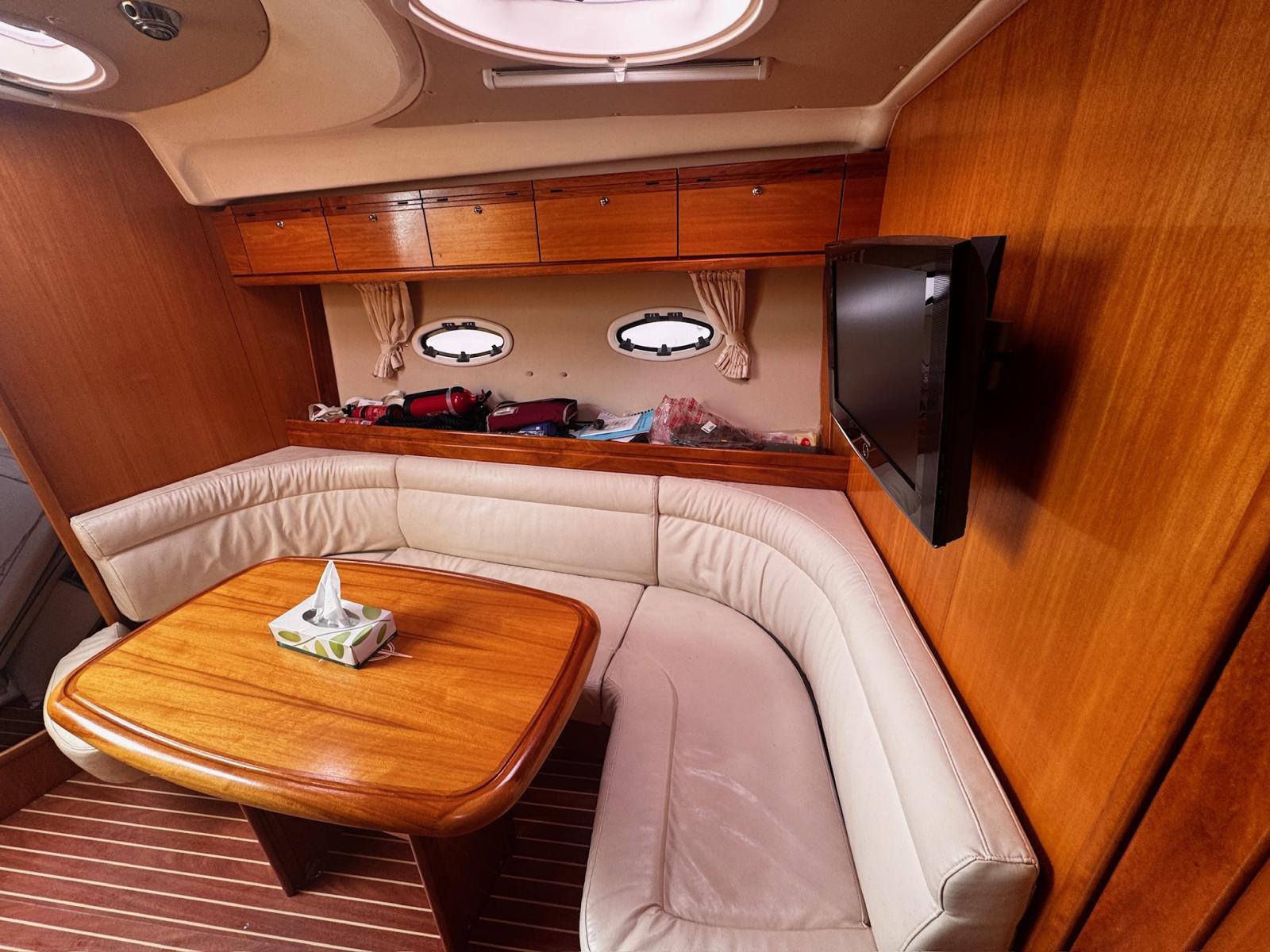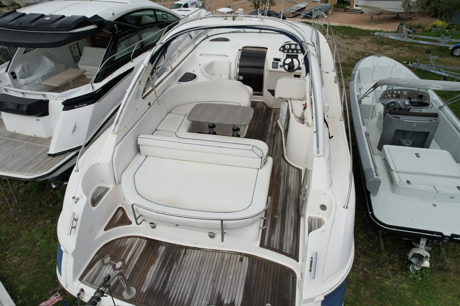 Équipements pratiques : Propulseur d’étrave, cockpit en teck, bains de soleil avant et arrière, guindeau électrique, plateforme de bain, coussins de cockpit, tauds de protection.