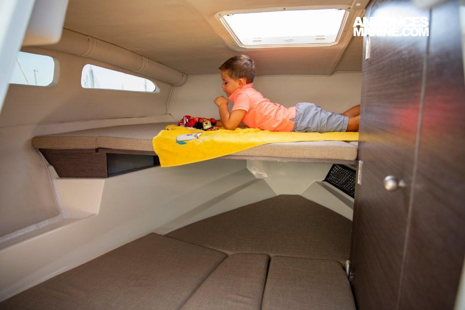 Fait assez unique pour un bateau de cette taille, l’ajout d’une cabine dotée de deux couchettes et d’un cabinet de toilette est un des points forts de ce bateau qui brille également par sa polyvalence.