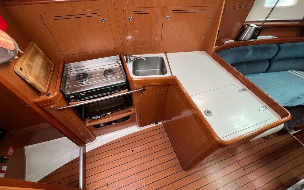 Banquette tribord : 1,76 m x 0,52 m. Les dossiers des banquettes sont inclinés pour plus de confort. Table centrale du salon : table en bois marqueté avec porte-bouteilles et ailes rabattables avec baguettes moulées en bois. La table est fixée au pilier de soutien du mât. Des étagères en bois et inox sont présentes à bâbord et tribord. Rangements :