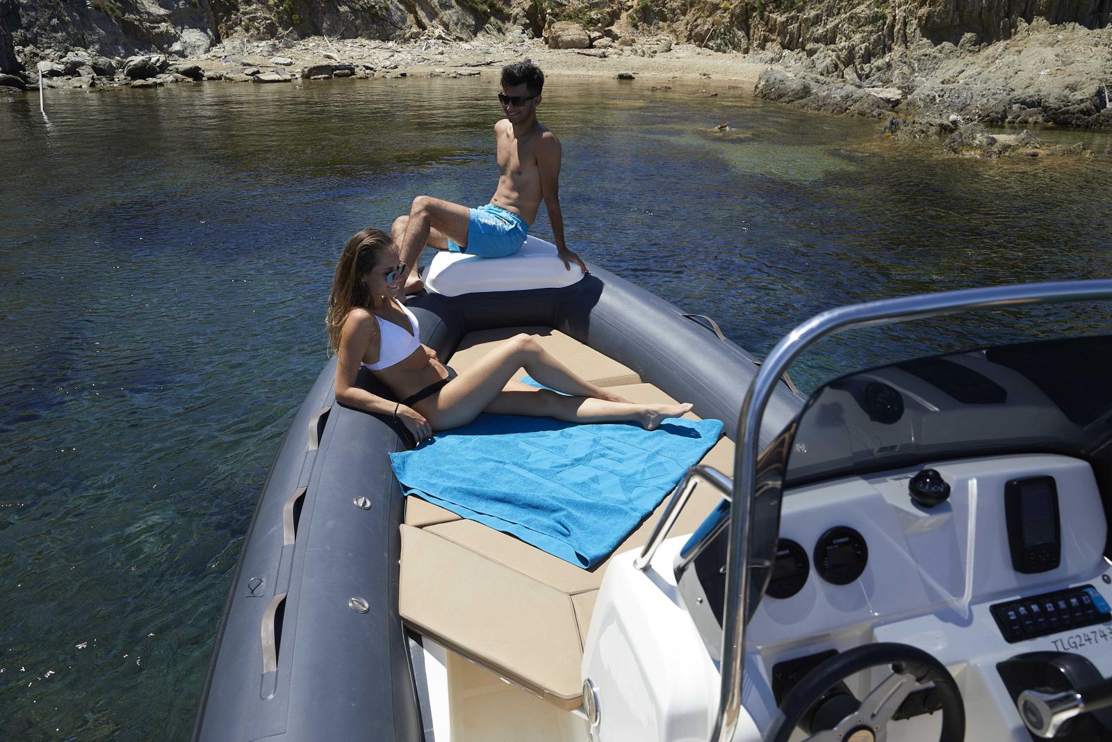 Le grand bain de soleil à l'arrière est rejoint par les côtés rembourrés placés au même niveau, tandis que le solarium à l'avant peut être étendu pour atteindre la console : l'expérience de confort est vraiment extraordinaire !