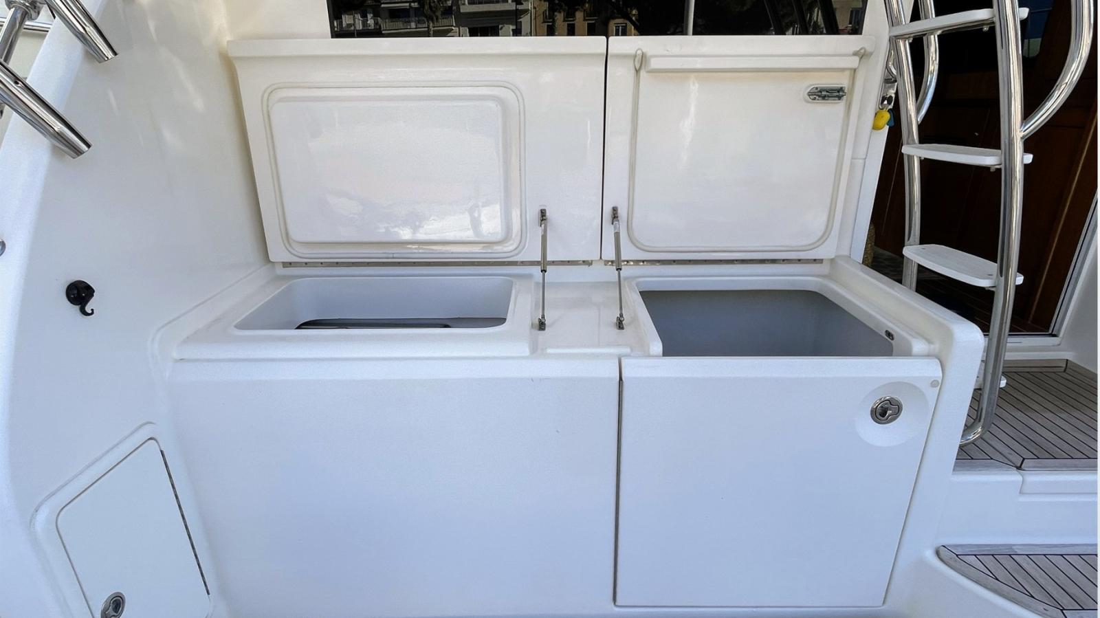 Ancre (50 m chaine), 9 Batteries (4 Service, 4 moteurs, 1 groupe), 3 Chargeur de batterie (dont 1 convertisseur), Douche de cockpit, Grue électrique (hydraulique 3 bras), Hard top, Extincteur(s) fixe(s) (FM 200), Lavabo dans le cockpit, Spots sous-marins (multicolors), 4 Panneau solaire, Passerelle, Plateforme arrière (Hydraulique), Cockpit en teck, Prise de quai, Connexion eau sous pression à quai, Guindeau électrique, table de cockpit.