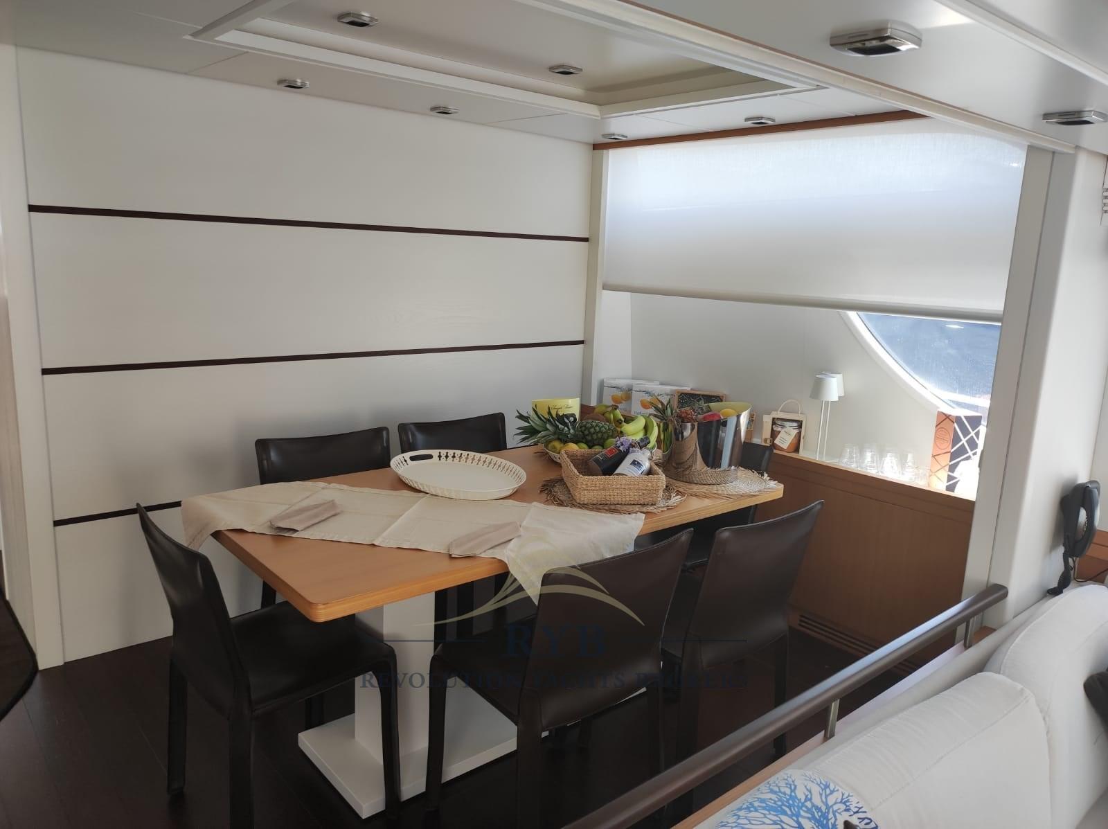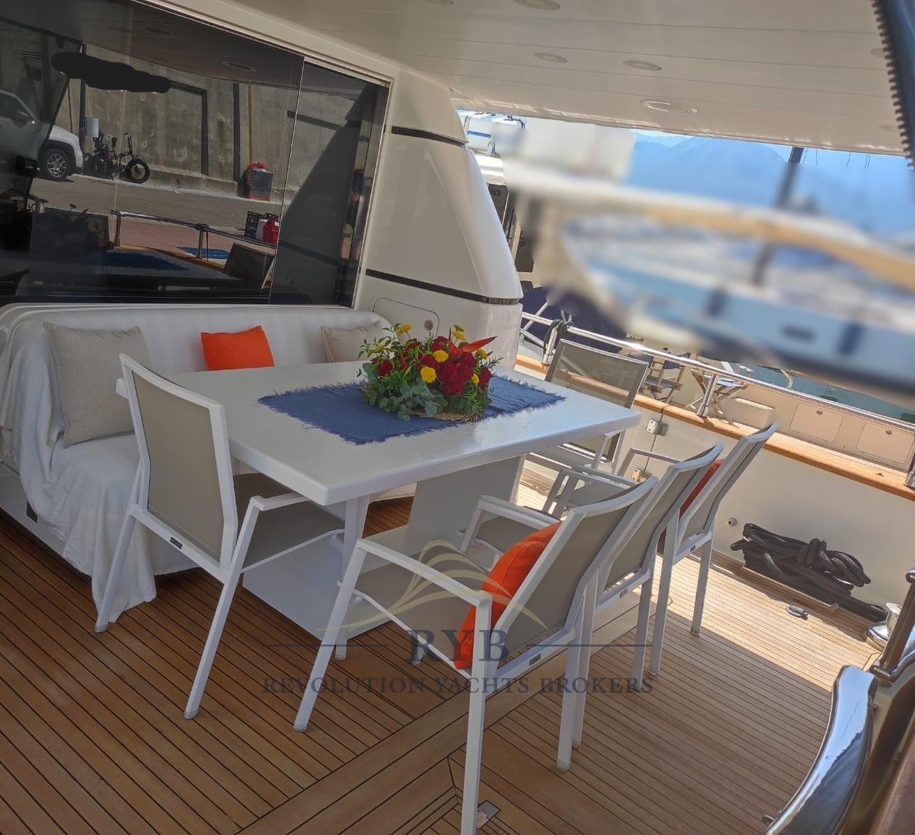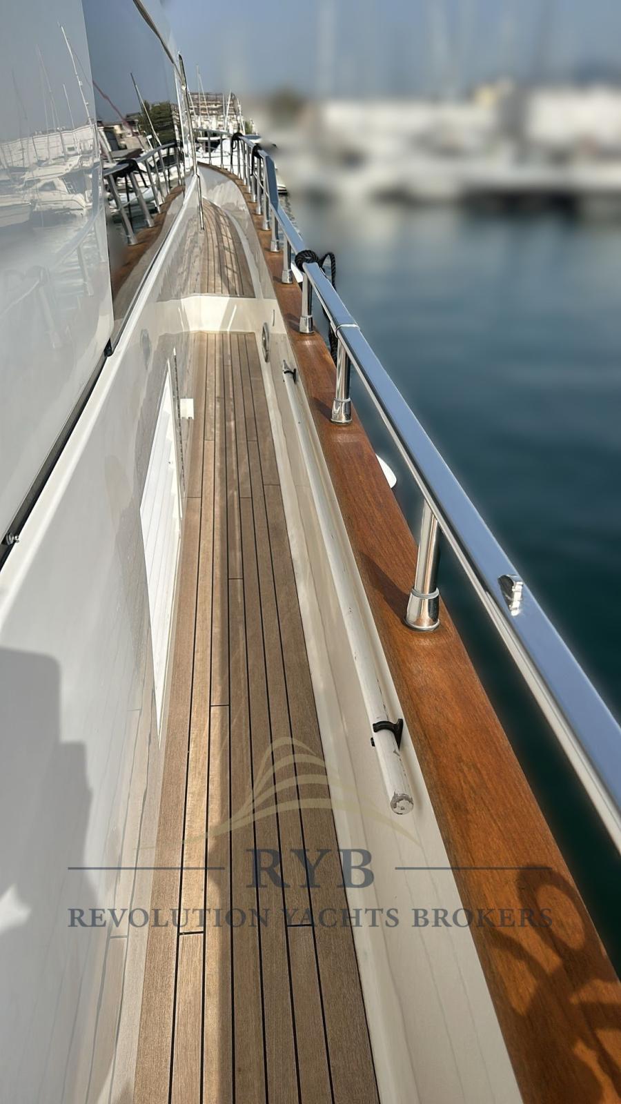 Alarme moteur, Alarme de pompe de cale, Eau sous pression, Système de vidange, Passavant en teck, Douche de cockpit, Double barre à roue, Phare de poursuite, Flaps hydrauliques, Lavage de chaine, Lavabo dans le cockpit, Éclairage de courtoisie, Spots sous-marins, Passerelle, Plateforme arrière, Pompe de cale automatique, Porte latérale, Porte latérale, Cockpit en teck, Prise de quai, Connexion eau sous pression à quai, Onduleur, Répétiteur électronique, Guindeau électrique, Echelle de bain, table de cockpit, Table pliante de salon, Corne, Winch électrique arrière, Winch électrique avant.