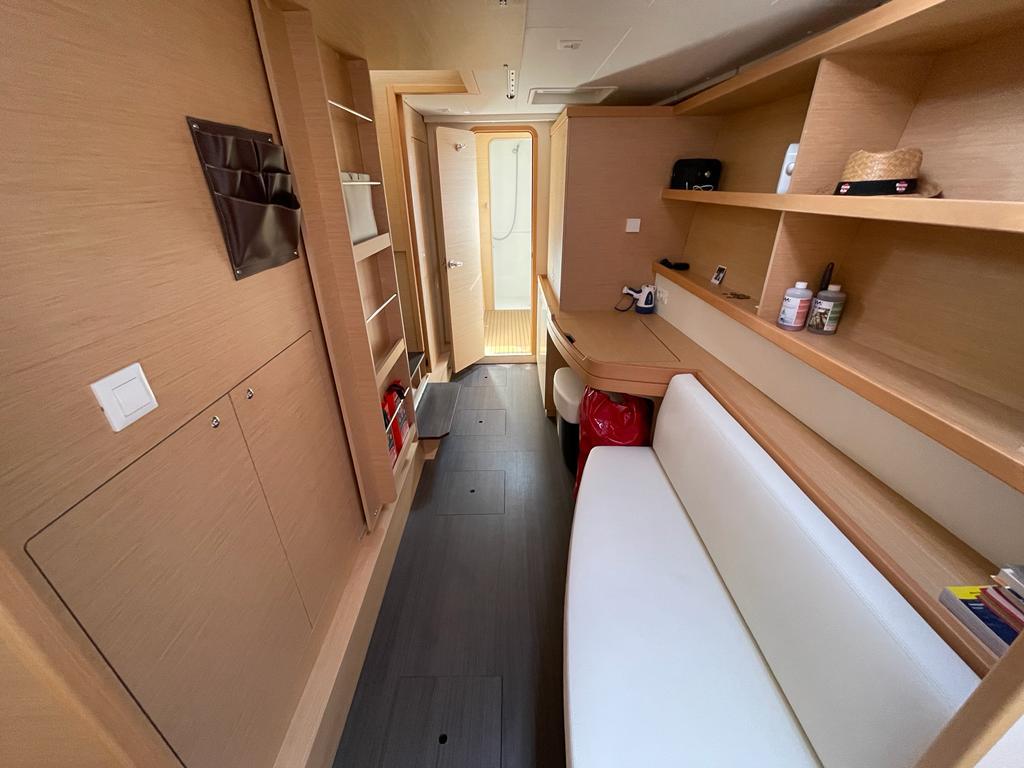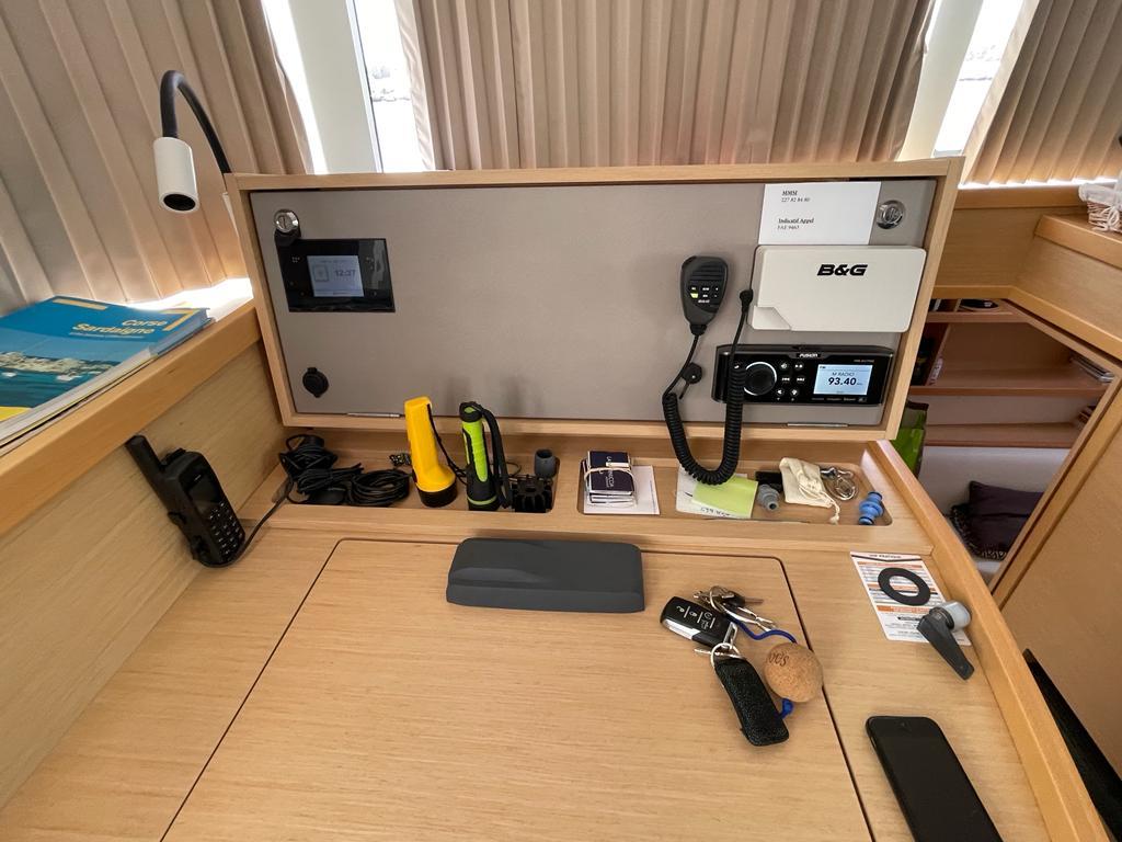 Profitez du Pack Comfort, des équipements de navigation B&G, du gréement complet GV, Génois, Spi, Code 0, et des options telles que le générateur, le dessalinisateur, les panneaux solaires souples, le bain de soleil sur le roof et la sellerie spéciale en PVC Snow White.