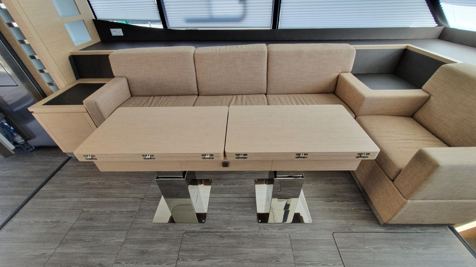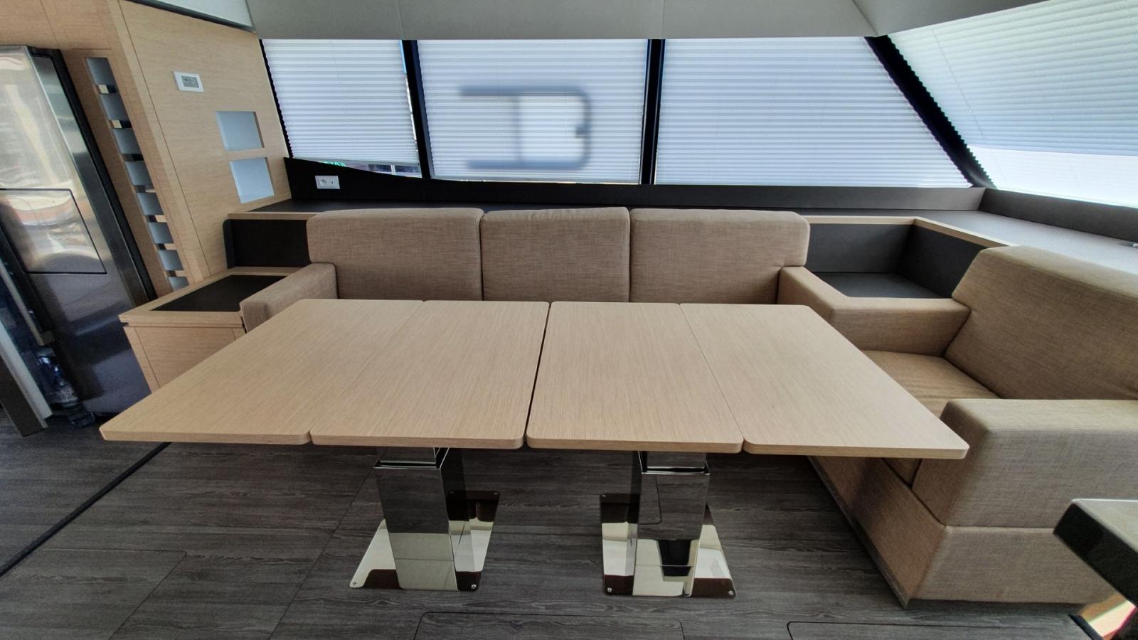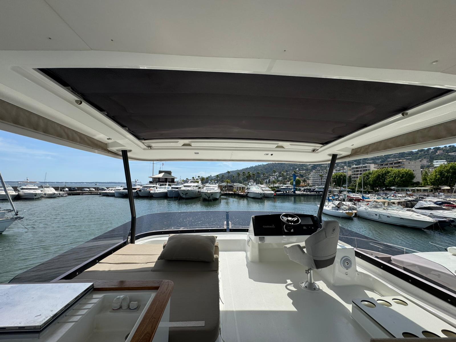 À l'extérieur, le cockpit arrière spacieux est doté d'un grand canapé et donne accès à une plateforme de bain. Le flybridge de 21 m² offre un espace supplémentaire pour se détendre, avec un poste de barre supérieur, un bar et un vaste solarium.
