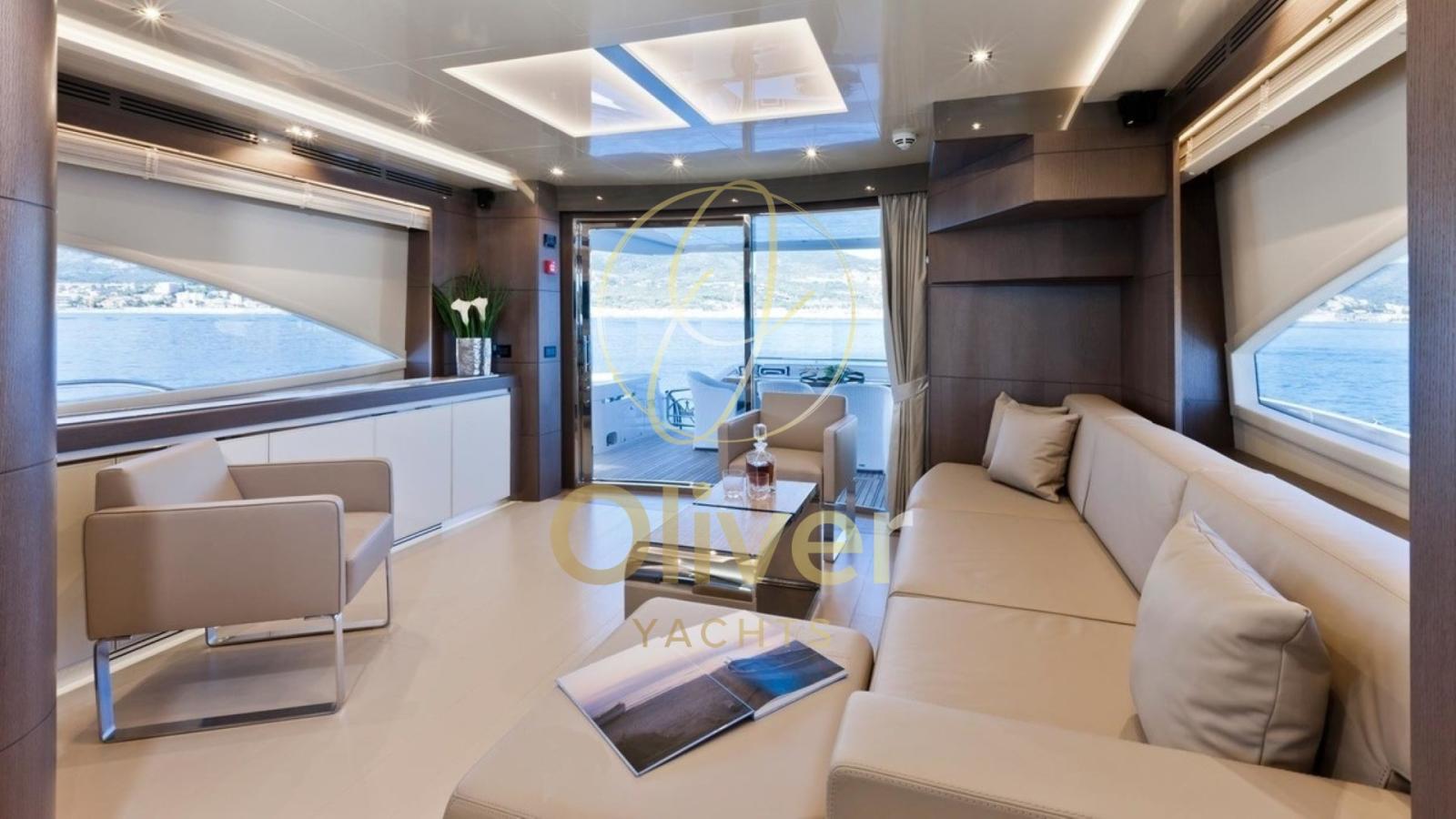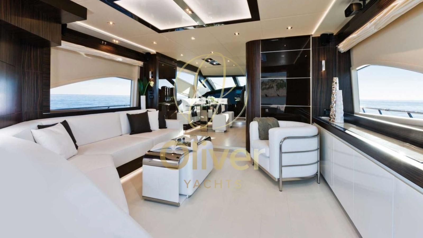 Le salon du SUNSEA 750 FLY est spacieux et ouvert, avec un salon et une salle à manger lumineux grâce aux grandes fenêtres panoramiques. Le mobilier moderne et élégant est entièrement personnalisable. Les matériaux comprennent le cuir, les bois précieux, le marbre naturel et les tissus fins. Les couleurs et les finitions peuvent être choisies pour créer une atmosphère exclusive, avec la possibilité de moduler les espaces pour des moments conviviaux ou privés.