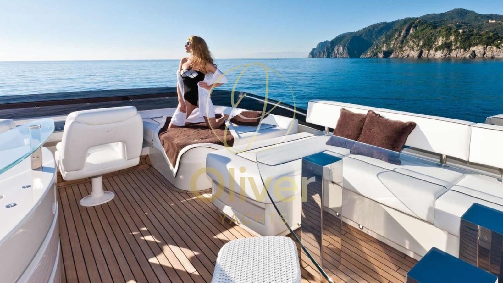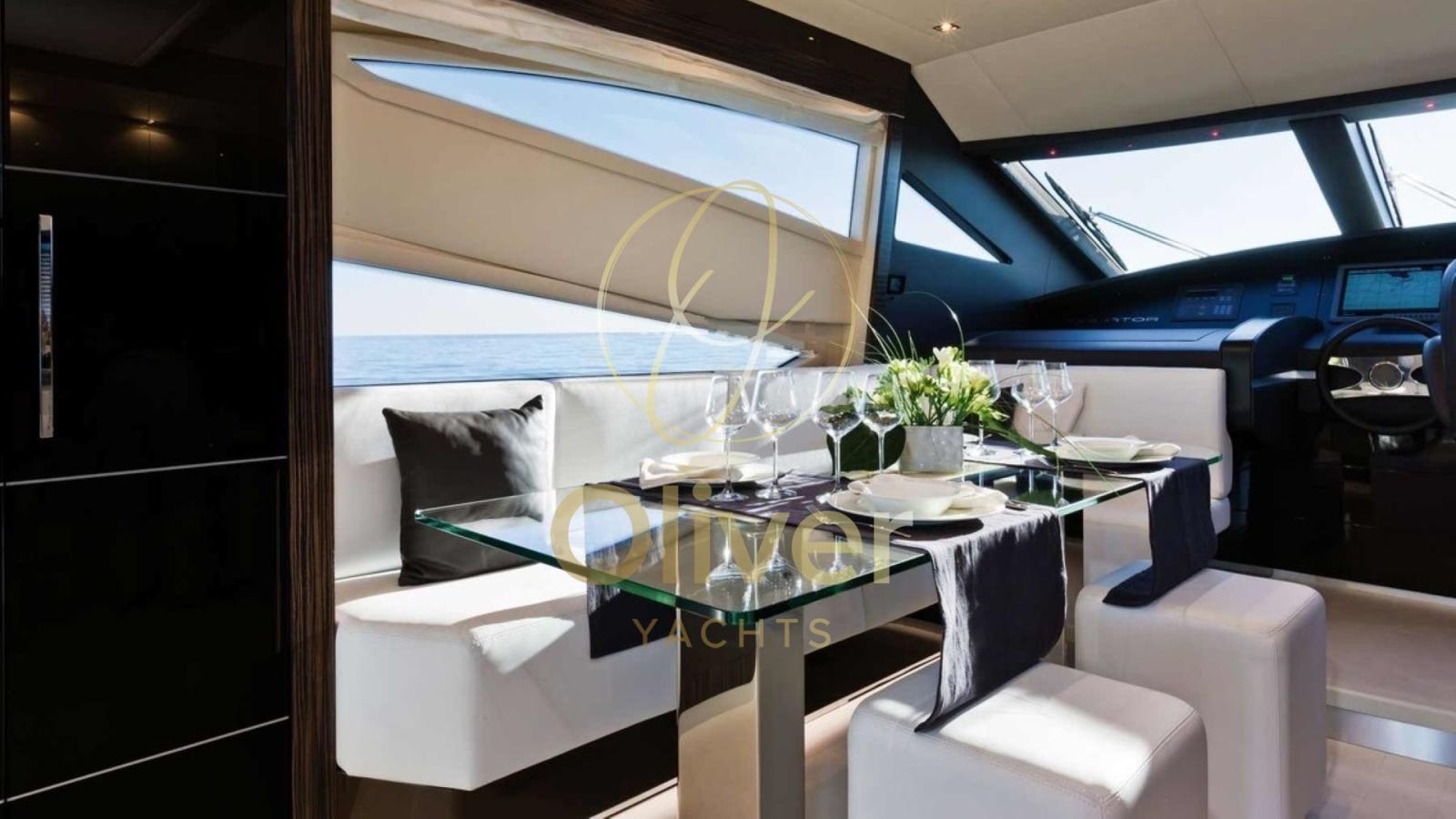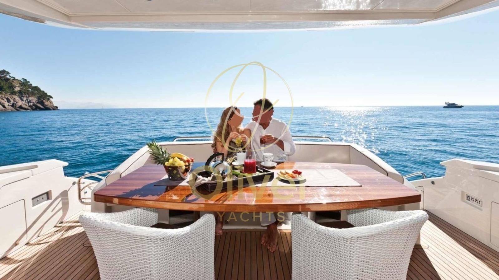 Le flybridge est grand et bien équipé : il comprend une salle à manger extérieure, un barbecue, un bar et une terrasse. Le mobilier d’extérieur est résistant aux intempéries et entièrement personnalisable. Le pont principal abrite un espace idéal pour les repas en plein air, tandis qu’à l’avant, il y a un grand espace de détente avec chaise longue et bain de soleil.