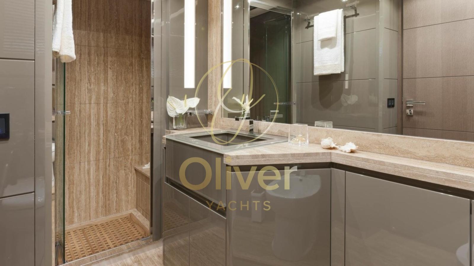 Spacieuse et raffinée, la cabine du propriétaire est une oasis d’intimité, équipée d’un lit double king-size, d’armoires aux finitions luxueuses et d’espaces pour les coiffeuses. La salle de bains privative dispose d’un double lavabo en marbre, d’une douche pleine hauteur en verre transparent et de détails en acier et en bois. L’éclairage tamisé crée un environnement relaxant et intime.