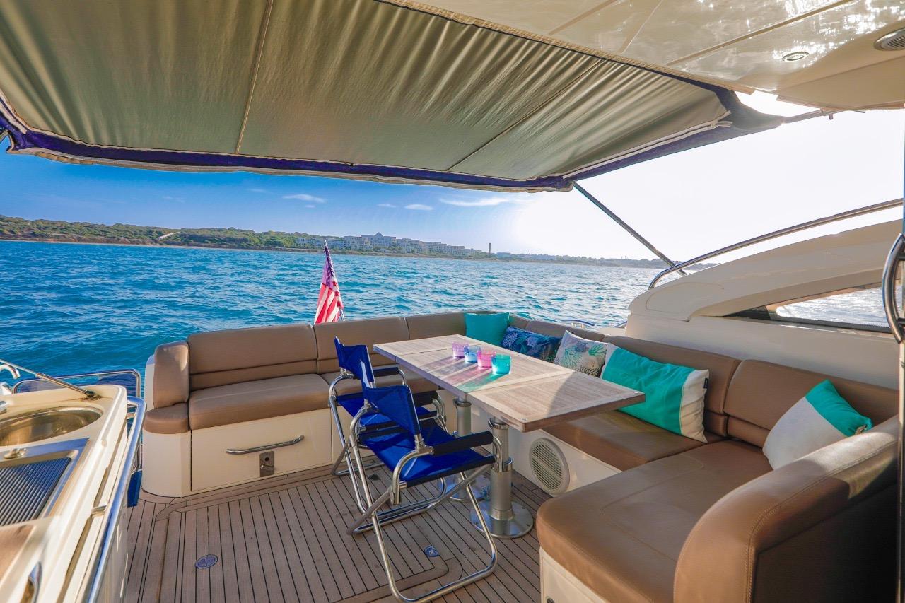 Le cockpit arrière est idéal pour recevoir, avec un coin repas convertible en grand bain de soleil, un wetbar avec évier et glacière, ainsi qu’un accès direct à la plage arrière hydraulique, pratique pour la baignade ou la mise à l’eau d’un tender ou jet-ski.