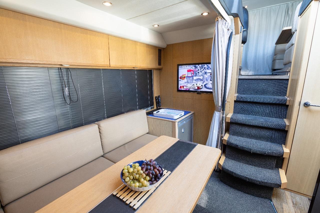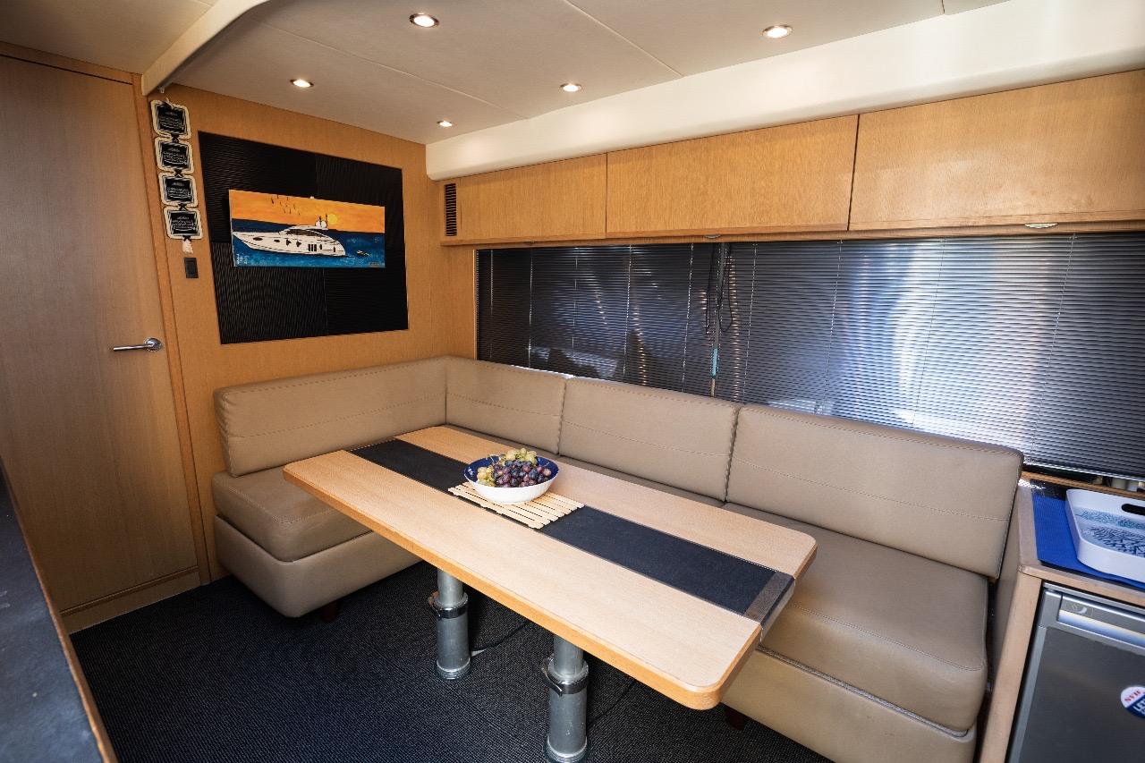 L’un des grands atouts de ce modèle est son salon de pont entièrement fermé, qui permet de profiter d’un espace intérieur plus vaste tout en conservant les sensations d’un yacht sportif. Les portes vitrées coulissantes et le toit ouvrant électrique offrent une belle modularité : ouverture totale sur l’extérieur ou protection confortable selon la météo et les envies.