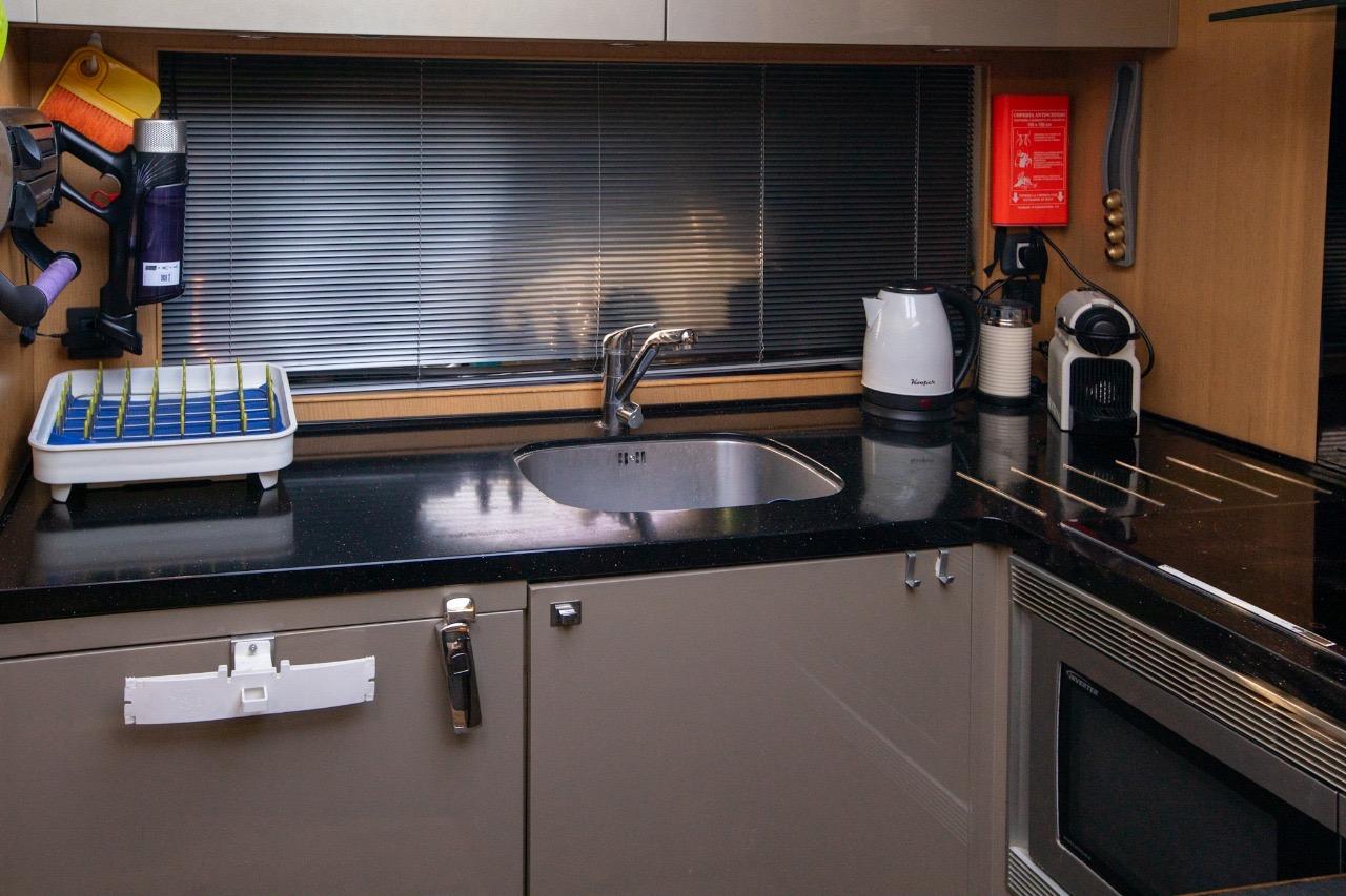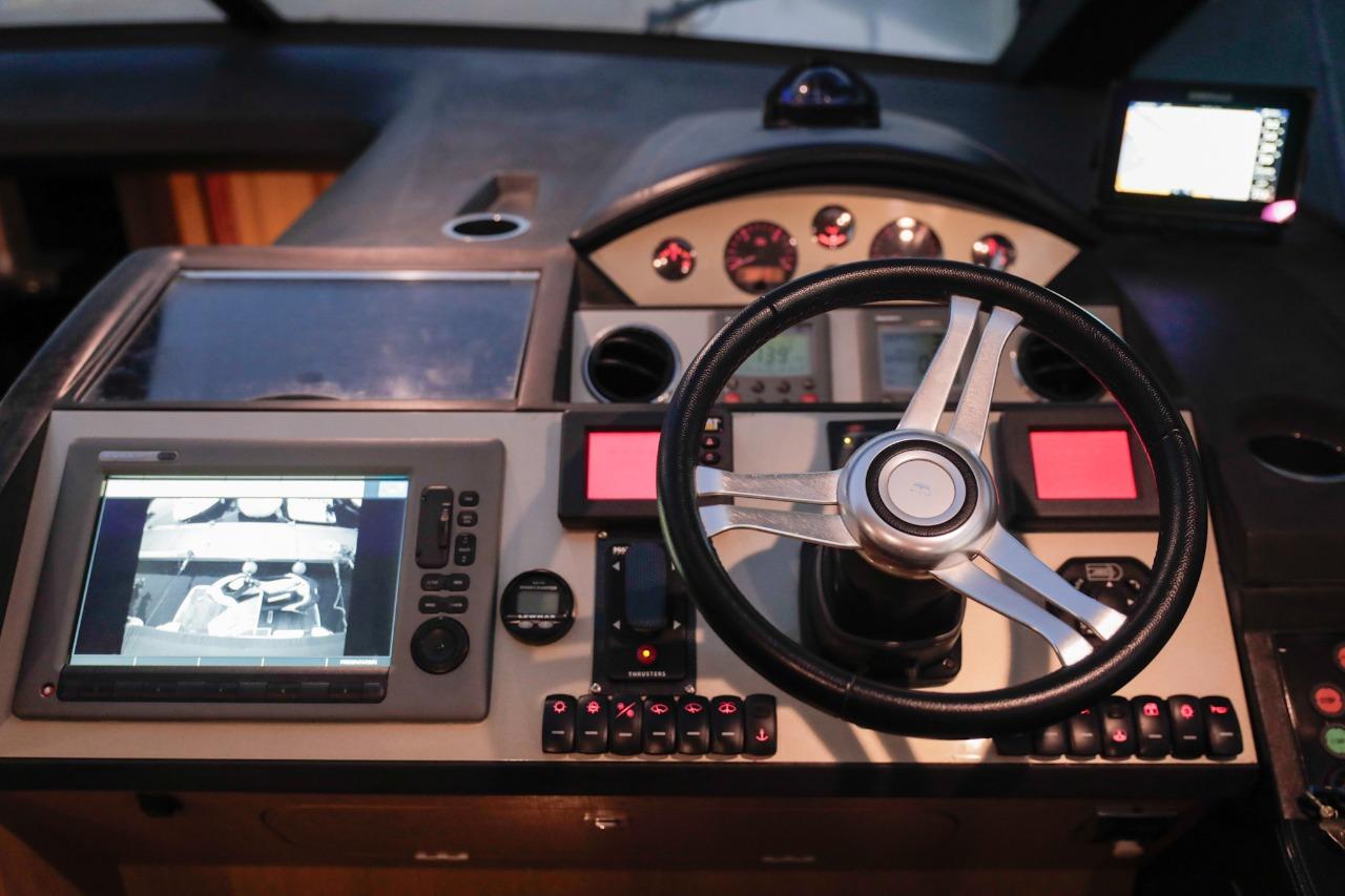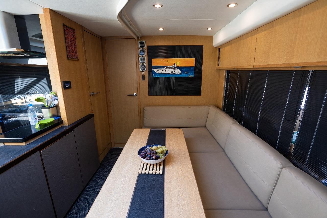 À l’intérieur, on retrouve tout le savoir-faire Princess avec des finitions luxueuses, des boiseries élégantes et une atmosphère chaleureuse. Le salon inférieur, situé face à la cuisine entièrement équipée, peut servir de coin détente ou être transformé pour accueillir des invités occasionnels.