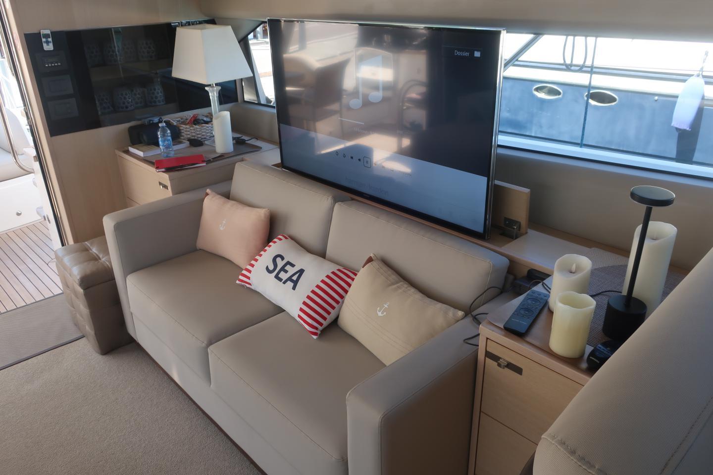 Salon avec table basse en canapé en entrant dans le carré à tribordCanapé en entrant à bâbord avec grande TV écran plat