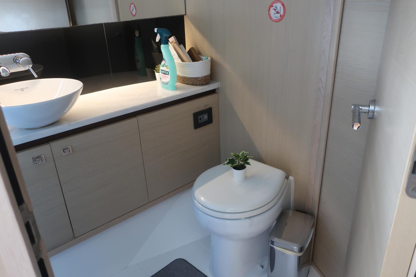 Une salle d’eau à bâbord avec douche, lavabo et WC électrique avec holding tank